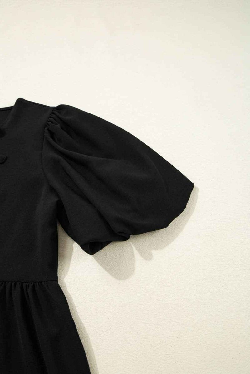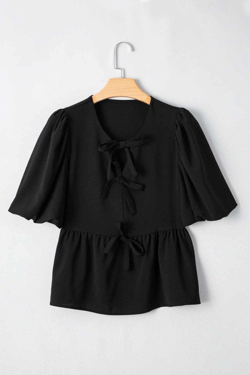 Chic Black Peplum Blouse with Puff Sleeves and Bowknot Detail