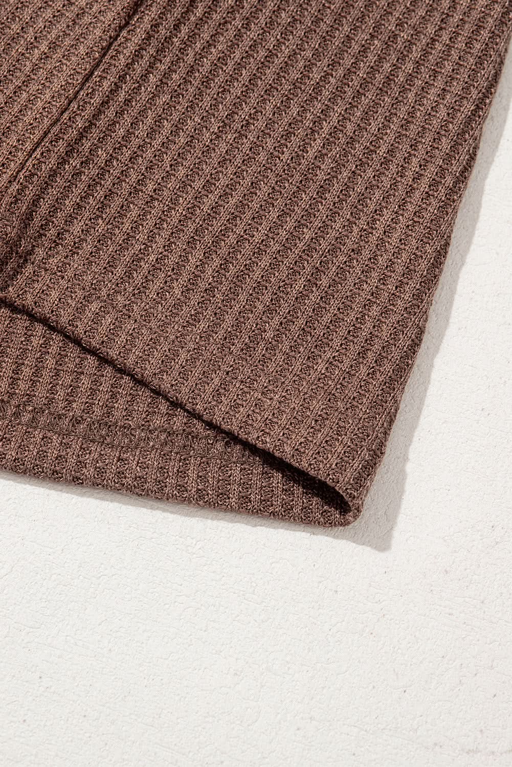 Coffee Ruffled Floral Sleeve Patchwork Waffle Knit O Neck Blouse ‐ Coffee / S / 100%Polyester