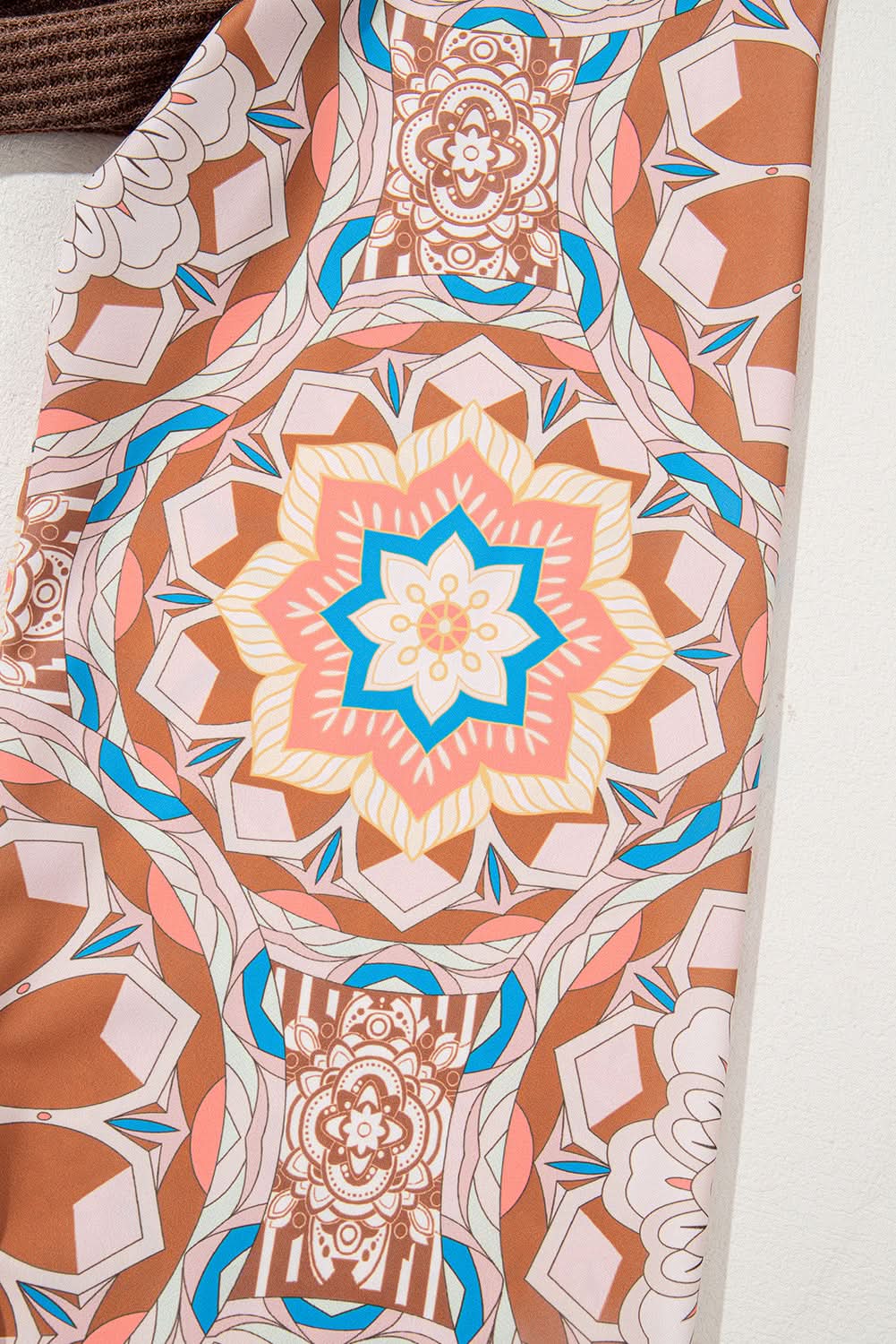 Coffee Ruffled Floral Sleeve Patchwork Waffle Knit O Neck Blouse