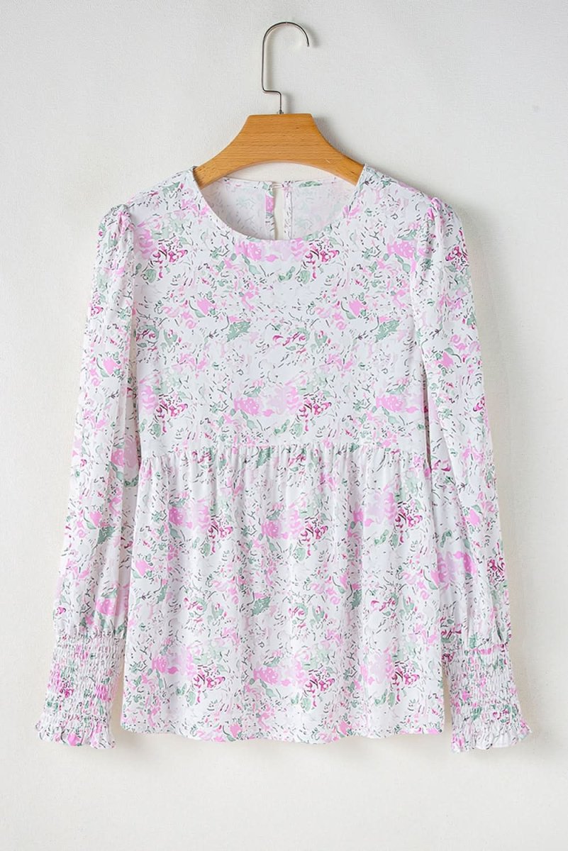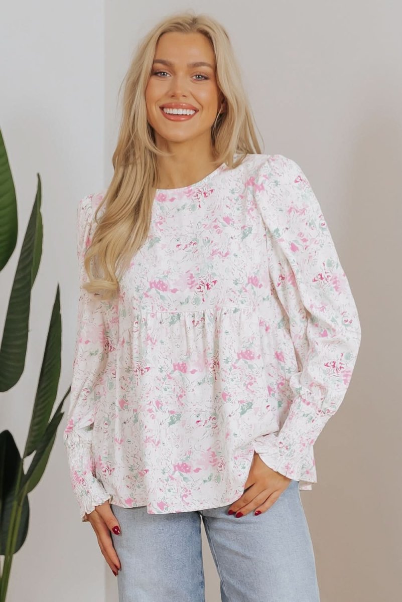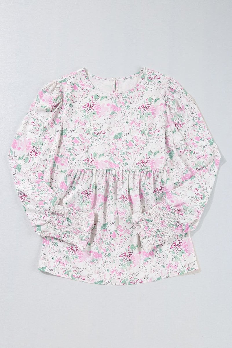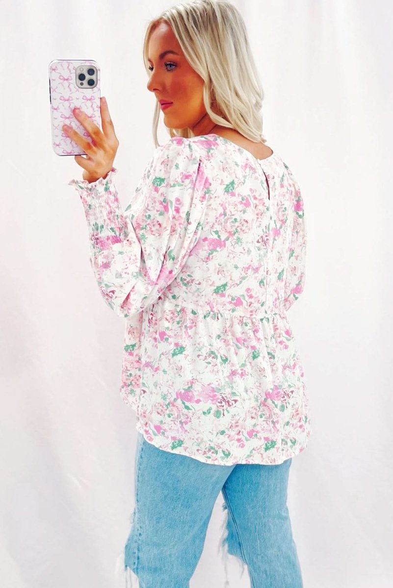 Embrace elegance with our Pink Floral Print Shirred Balloon Sleeve Babydoll Blouse.
