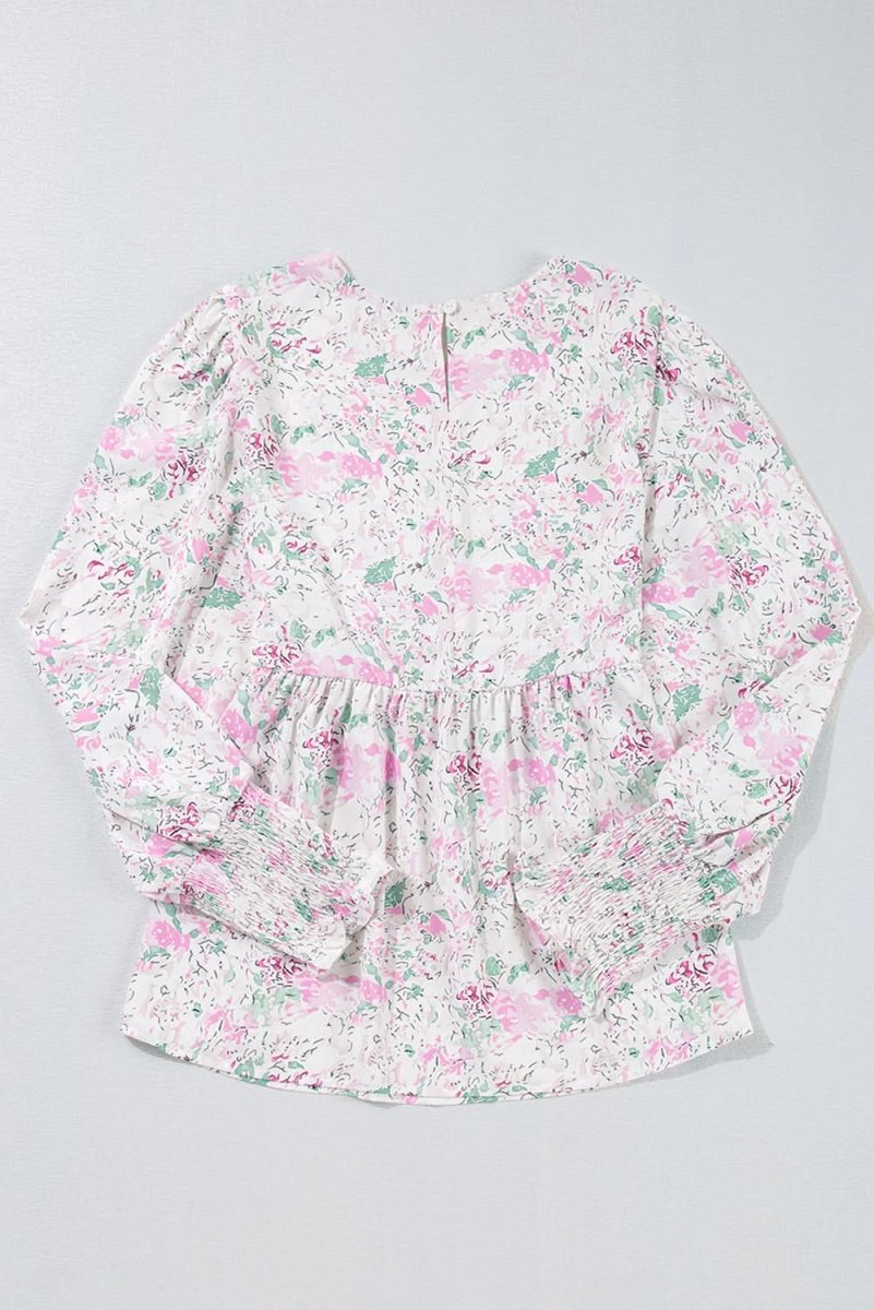 Pink Floral Print Shirred Balloon Sleeve Keyhole Back Babydoll Blouse