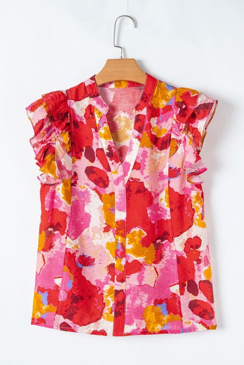 Red Ruffled V Neck Blouse with Abstract Print ‐ Red / S / 85%Viscose+15%Polyamide
