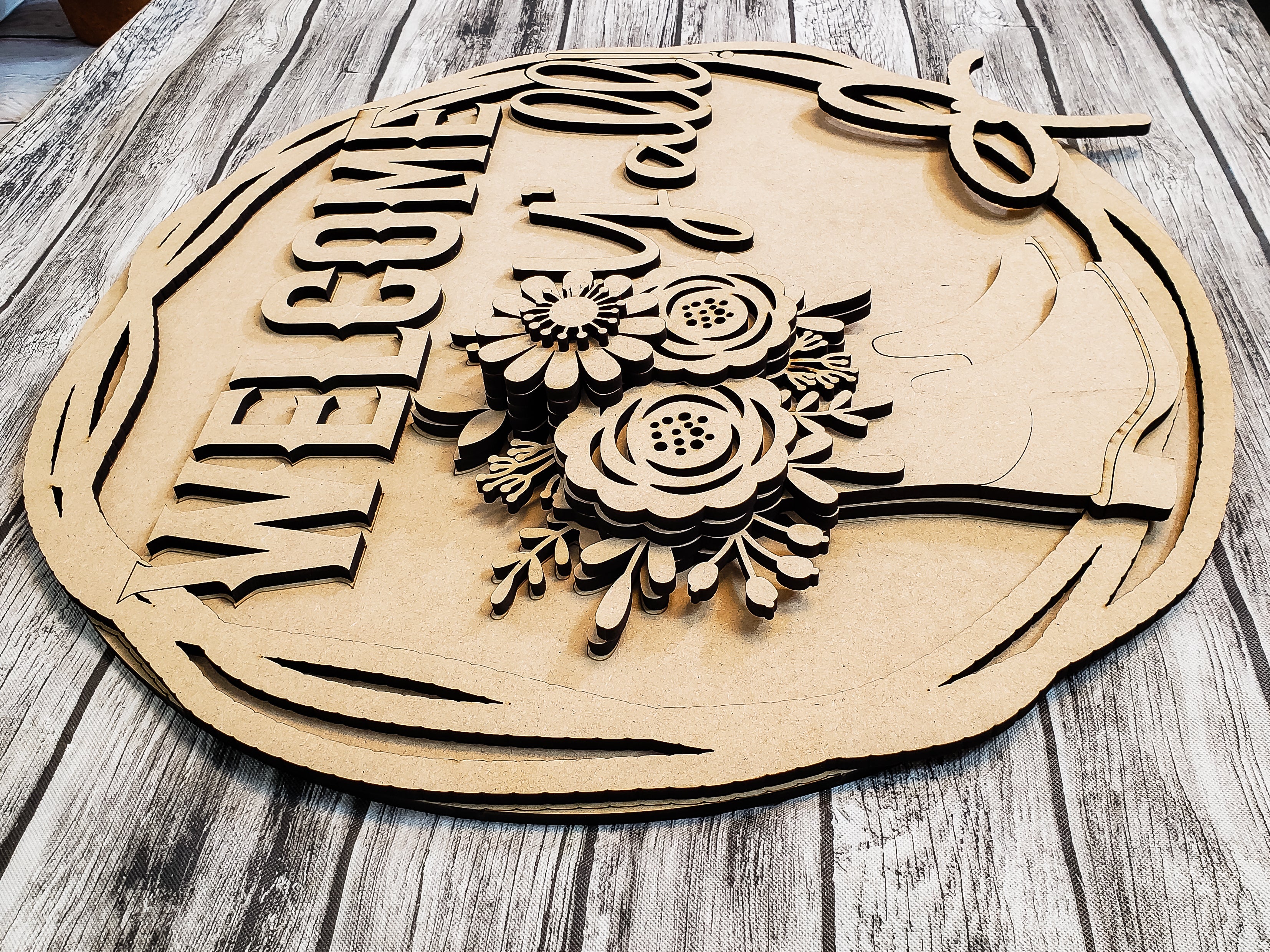 Beautifully crafted from 1/4" MDF, ready for you to use those creative juices and paint! 16" Round with wooden layers to give some beautiful depth. (Any painted pieces are examples only.)