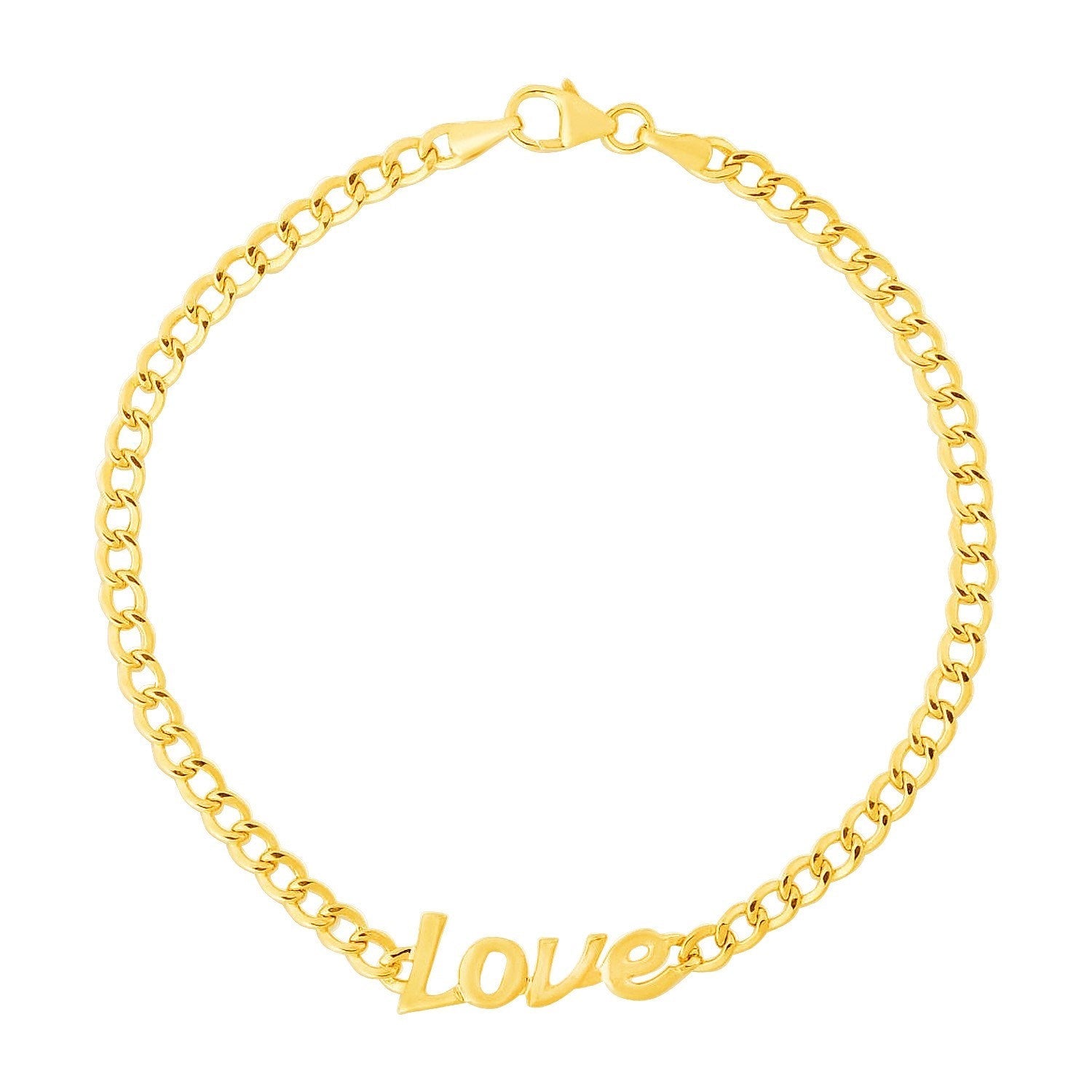 Wear love with you always with this elegant "love" bracelet, joined to classic curb chain and formed from 14k yellow gold. Bracelet is 7 inches long and closes with a lobster clasp.