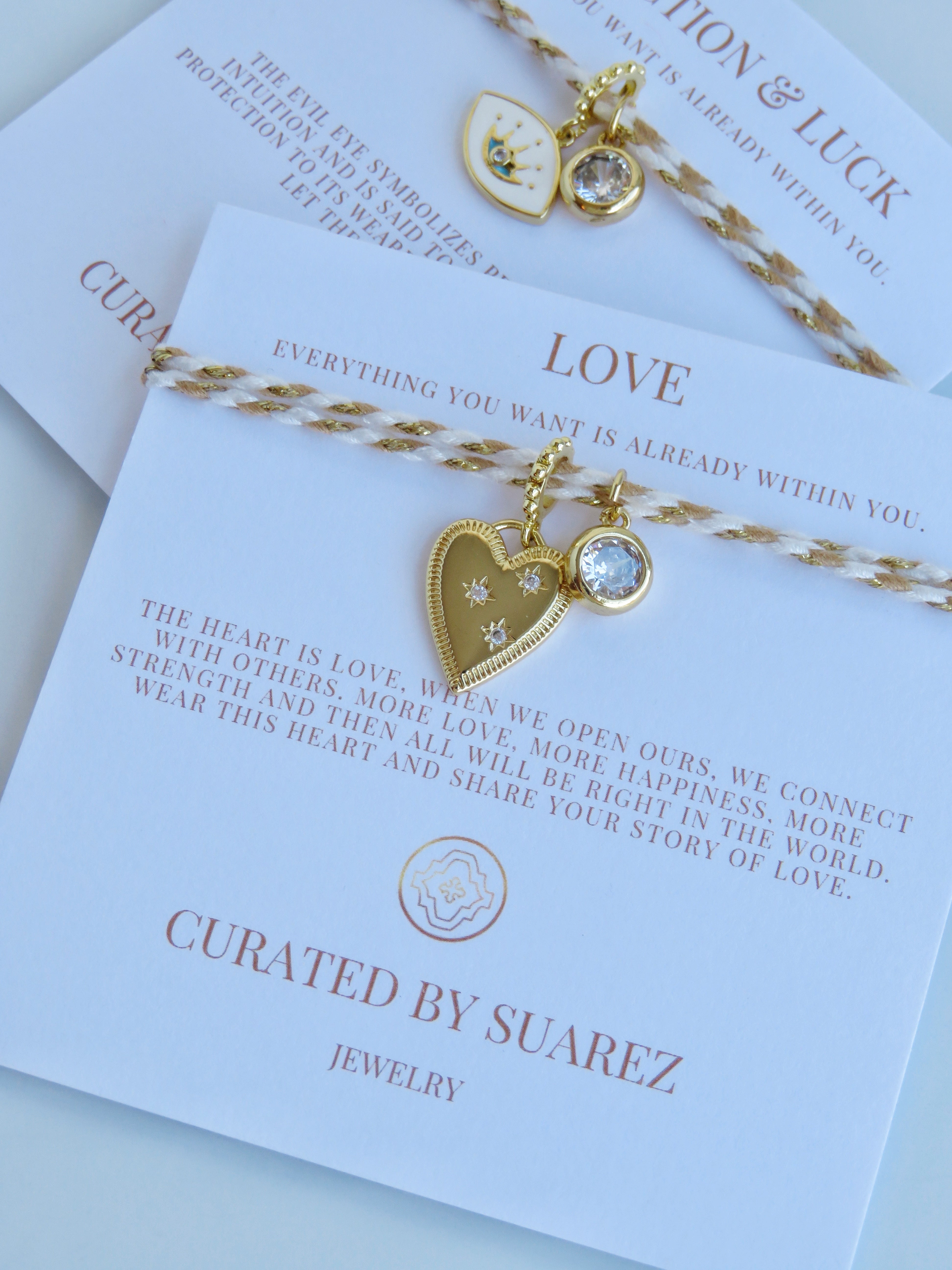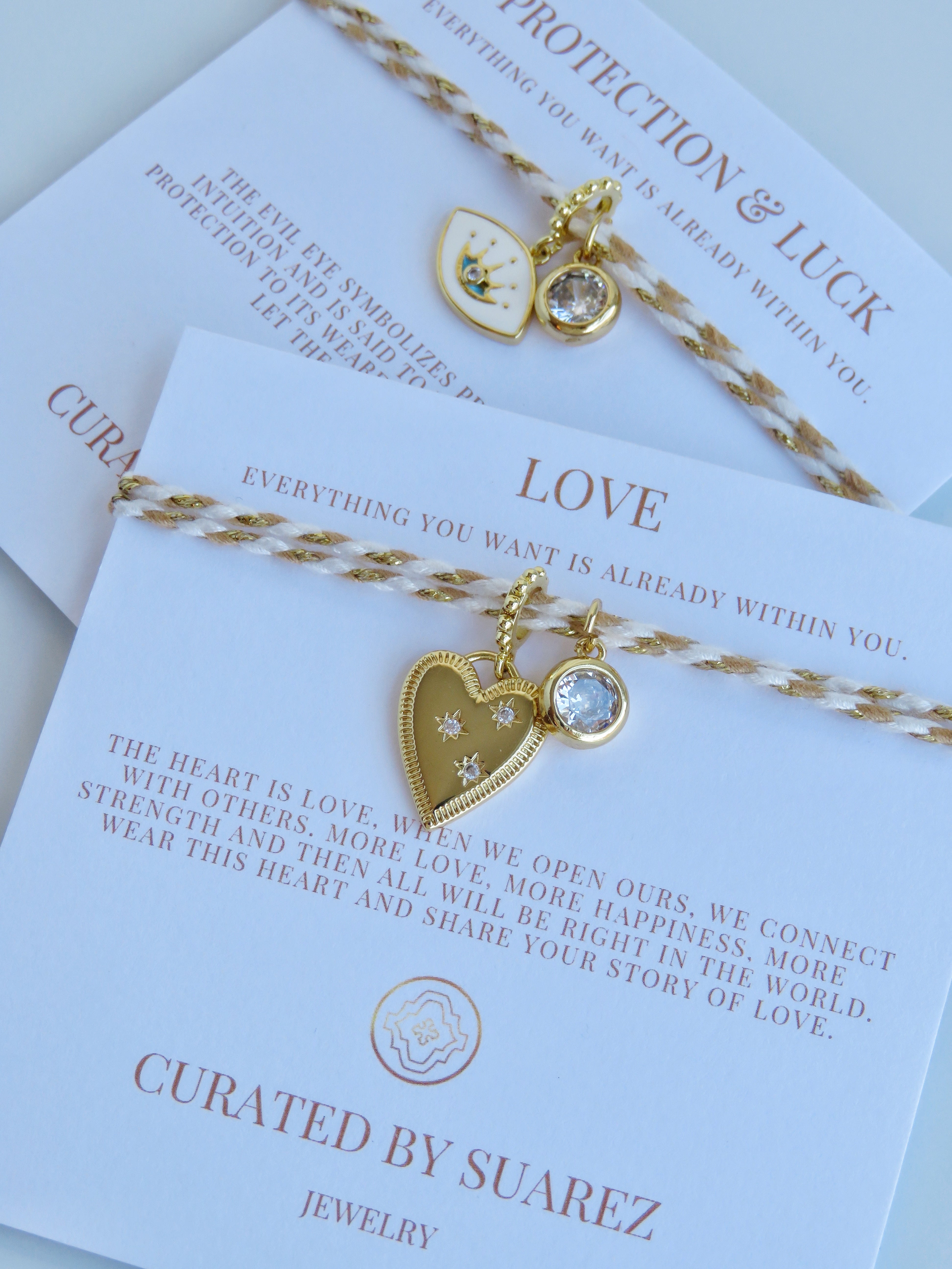 - Adjustable fabric cord bracelet with a an Evil Eye Charm or Heart Charm