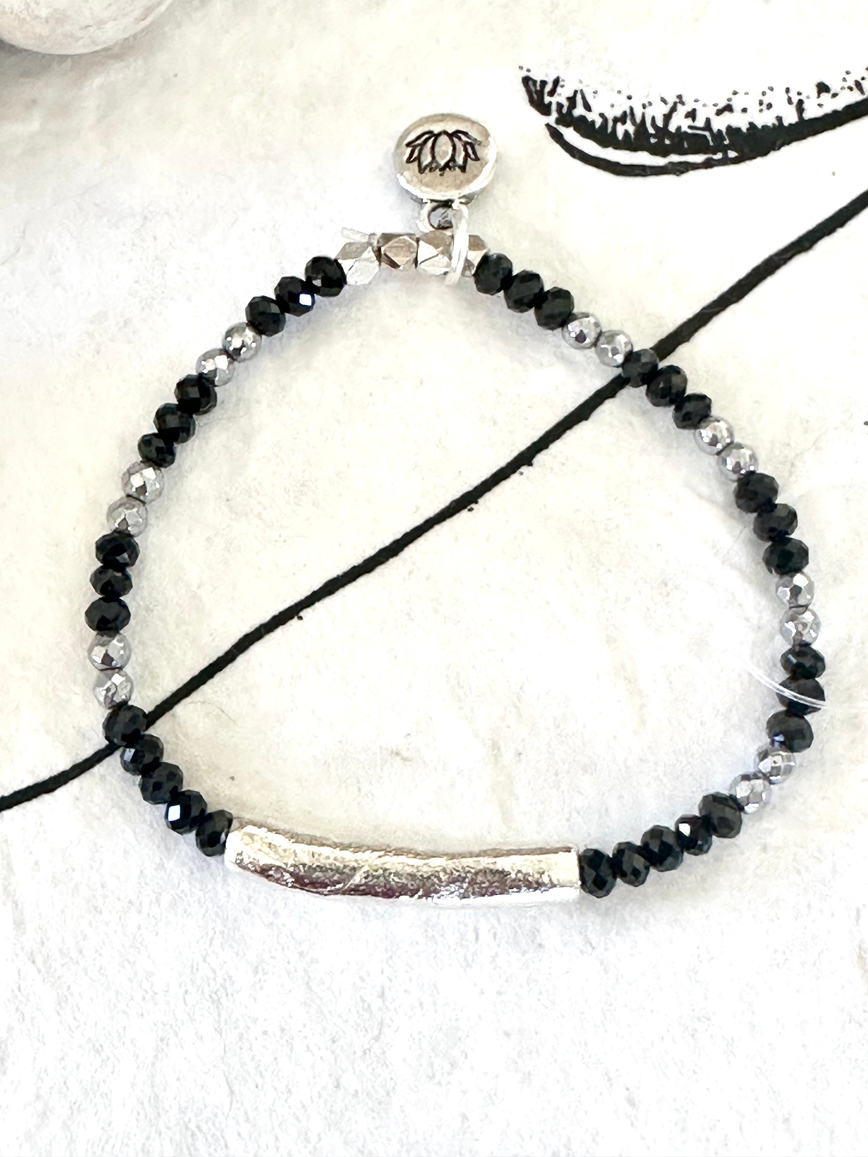 Gorgeous micro-faceted Black Spinel gemstones have a lovely sparkle next to the Primitive Tube and Hematite spacer beads.