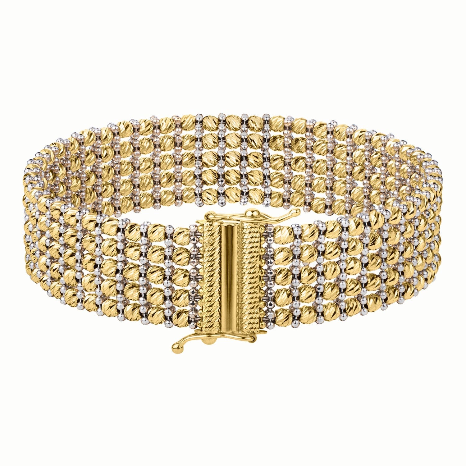 Simply stunning, this diamond-cut 14k two tone gold medium "Red Carpet" bracelet is designed to captivate. Featuring two-tone, textured, and beaded multi-row detailing, it sparkles with every movement. The slide design with a double figure-8 clasp ensures secure wear, while its bold and radiant aesthetic makes it truly worthy of the spotlight.