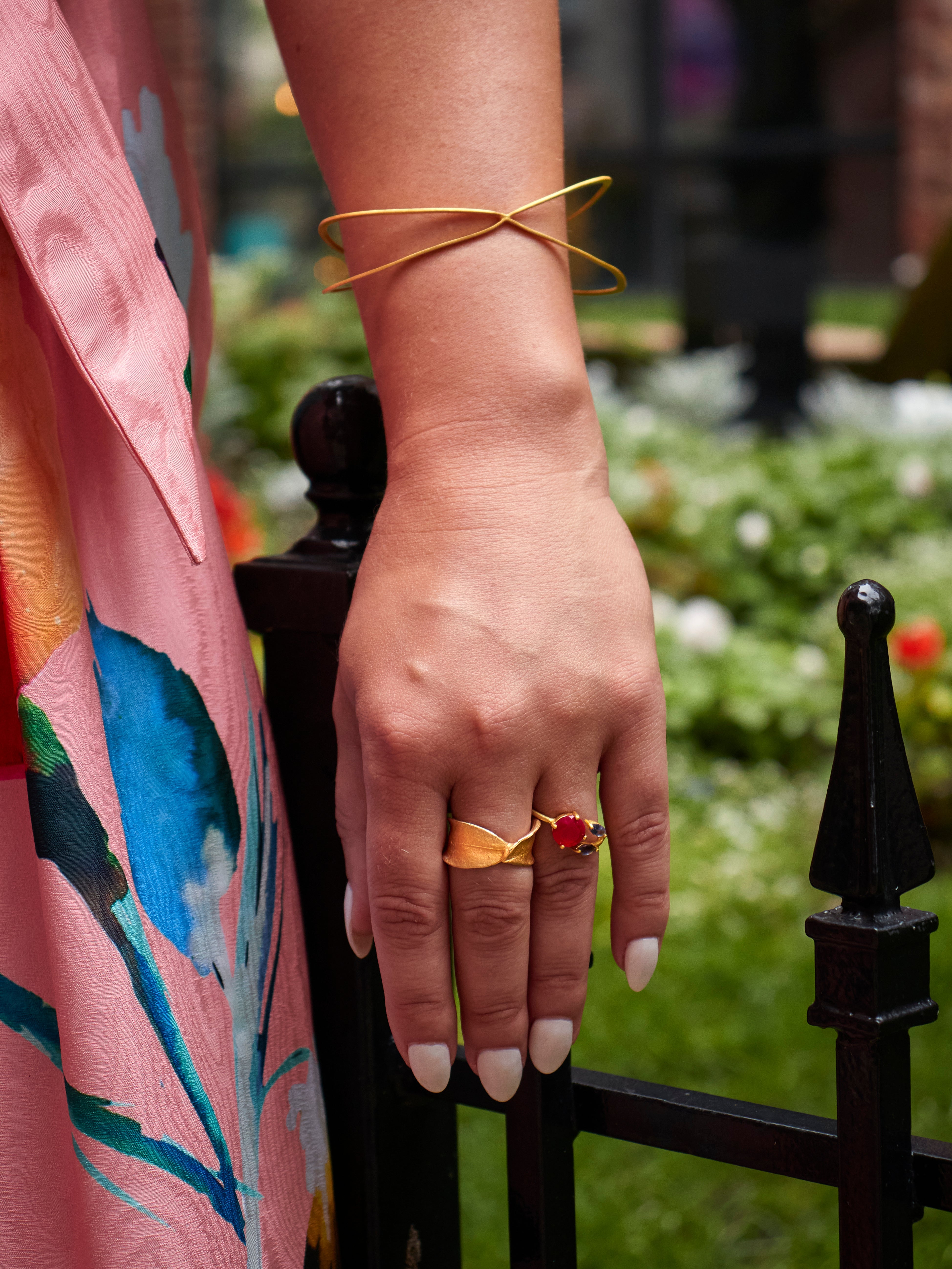 This light and airy cuff bracelet is comprised of two sweeping leaf-like shapes that come together to form an X in the center. Slightly flexible and size adjustable, so you can bend and shape it to your liking.