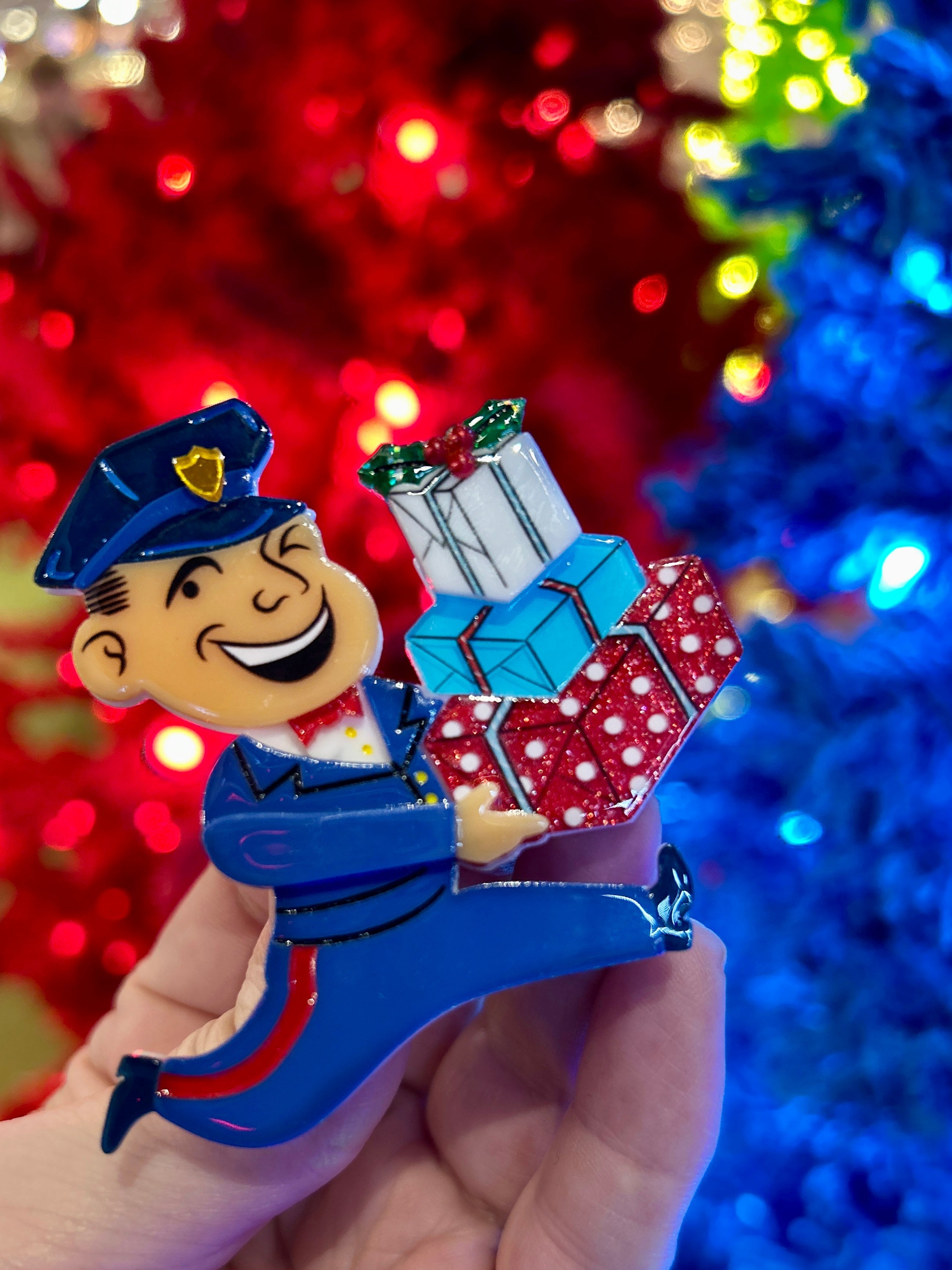 Welcome the holiday season with the Christmas Happy Mail Brooch by 50's Vintage Dame x Lipstick & Chrome! This adorable brooch, illustrated by 50s Vintage Dame, depicts a festive delivery man bringing you some extra holiday cheer. Made of durable acrylic material, this brooch is the perfect accessory to add some Christmas spirit to any outfit. Don't miss the matching earrings!