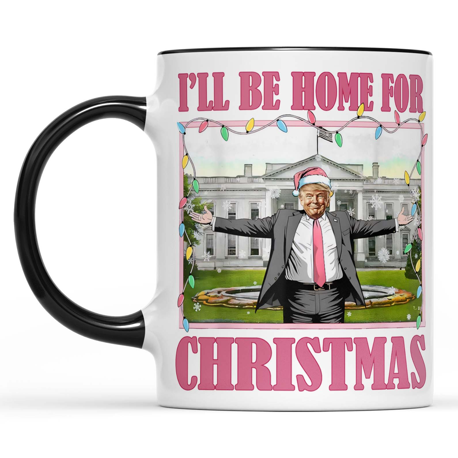 This festive mug features a humorous image of Donald Trump standing in front of the White House, arms open wide, and wearing a Santa hat. The design is framed with colorful Christmas lights, adding a cheerful holiday touch. Above the image, the text reads "I'LL BE HOME FOR" in bold pink letters, while "CHRISTMAS" appears below, completing the classic holiday song lyric. Perfect for anyone with a sense of humor and holiday spirit, this mug combines Christmas cheer with a playful nod to current events.