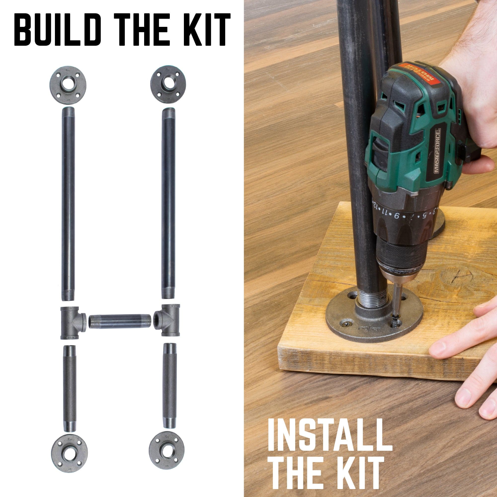 - Kit includes: (2) 3/4 in. x 8-inch pipes, (2) 3/4 in. x 18-inch pipes, (1) 3/4 in. x 6-inch pipe, (4) 3/4-in. round flanges, (2) 3/4 in. Tees, (8) screws, instructions, and a clean and seal sheet