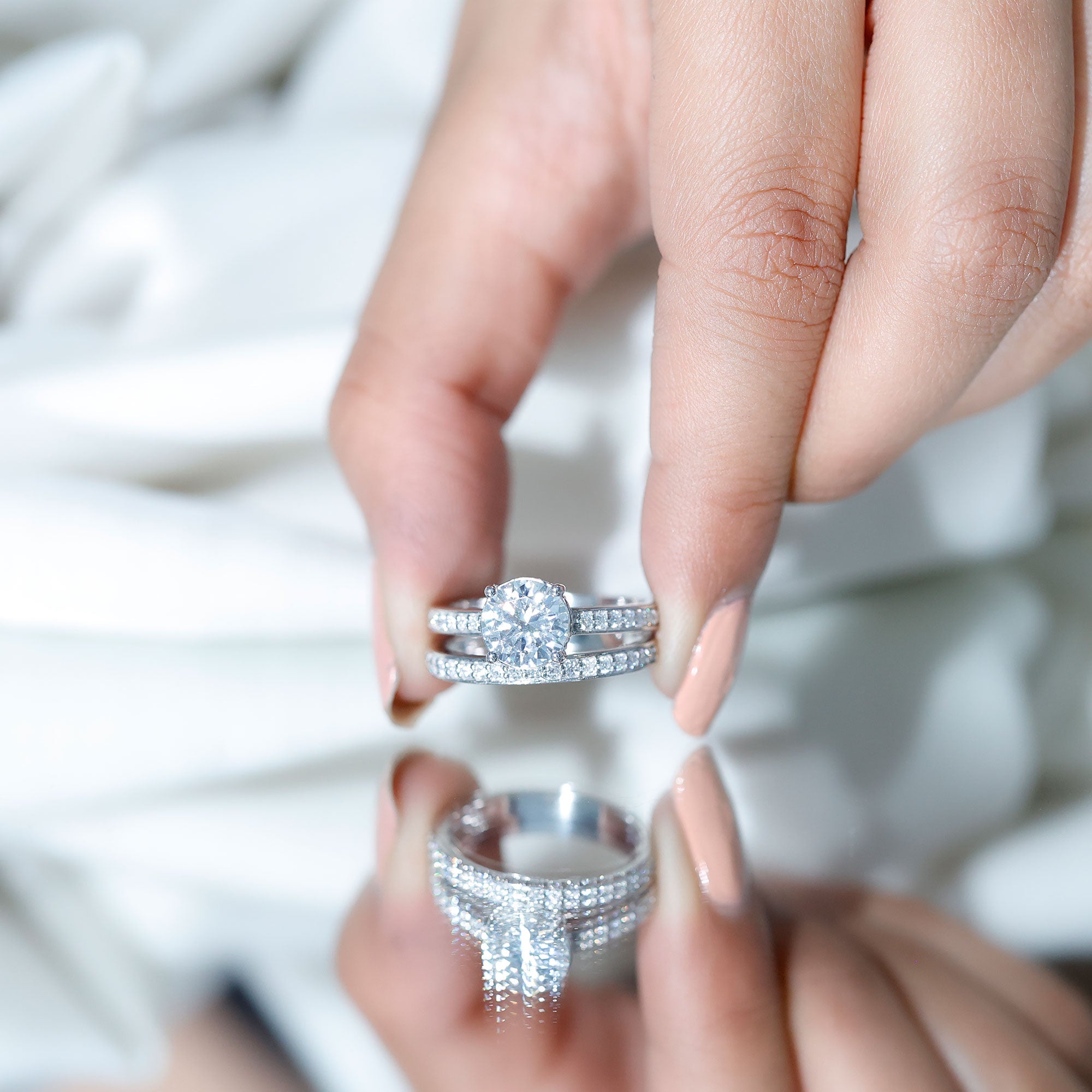 Celebrate your love with this exquisite Wedding Ring Set that features an 8 MM Round Shape Moissanite in Prong Setting with small Moissanite gemstones.