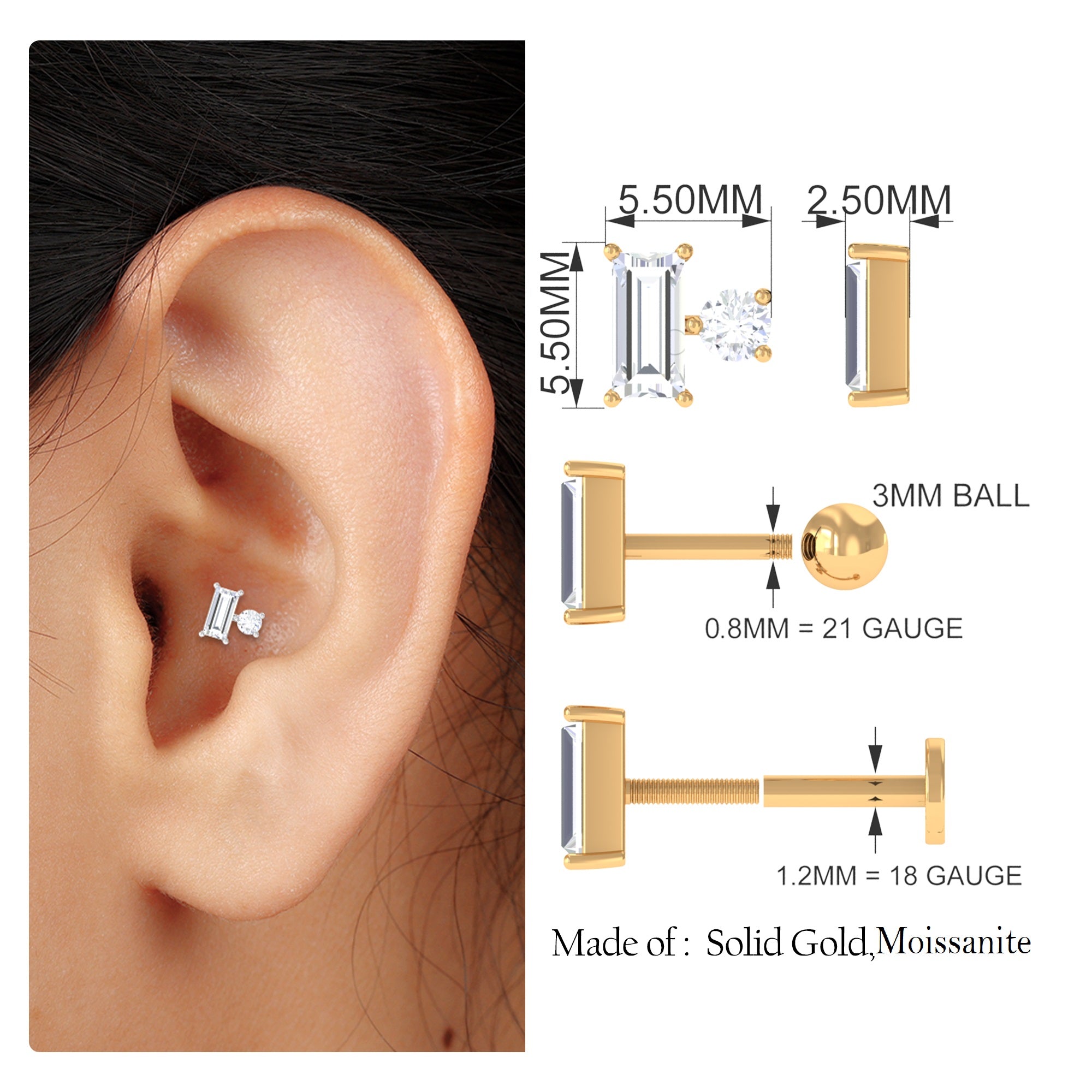 Baguette and Round Cut Moissanite Tragus Earring ‐ D-VS1 / 14K Yellow Gold / Flat Back 4.5 MM