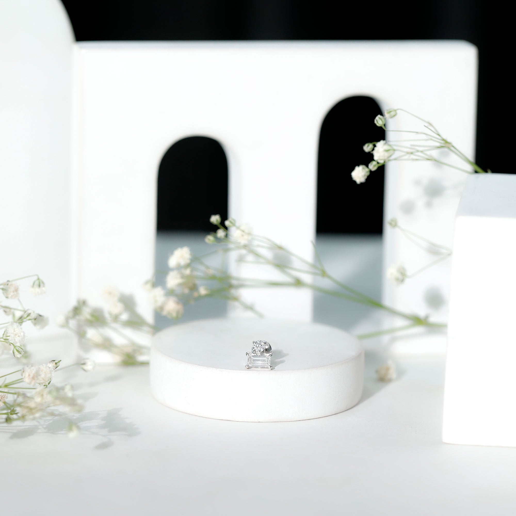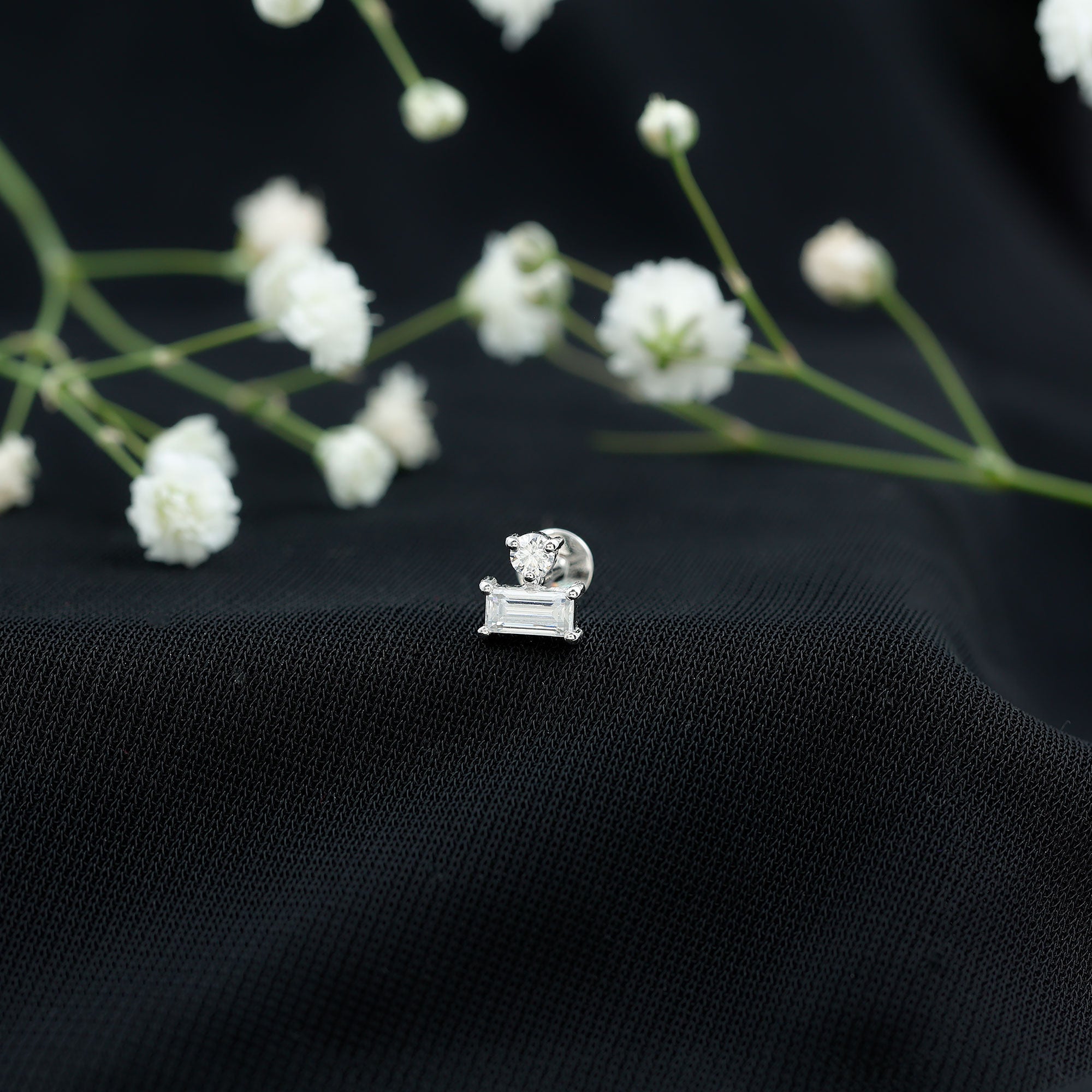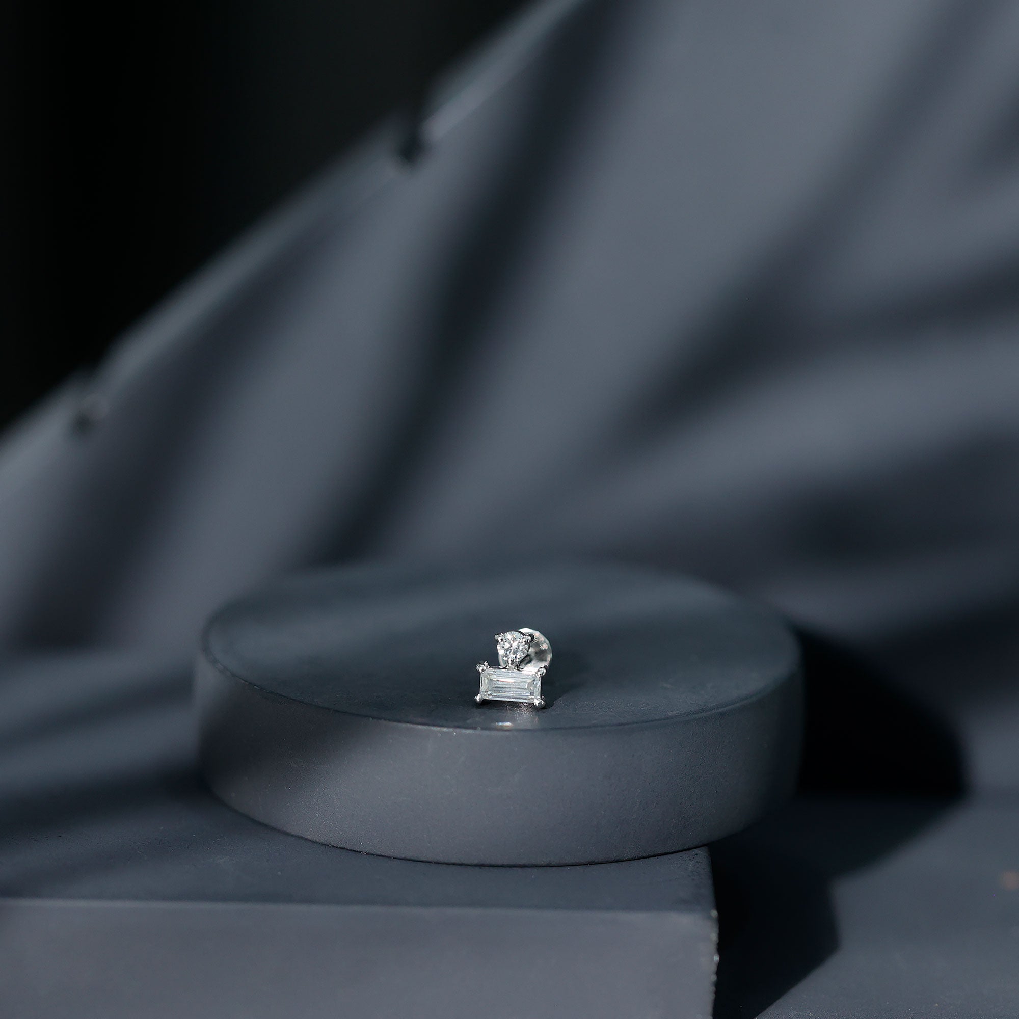 This unique two-stone Moissanite Tragus Earring sparkles and shines like crazy. Beautified with shimmering Round and Baguette Cut Moissanites secured in Prong Setting. You can style this Moissanite Earring on your Helix, Cartilage, Conch, or Upper lobe Piercing. This 2 Stone Earring will hypnotize everyone with its shine and beauty.