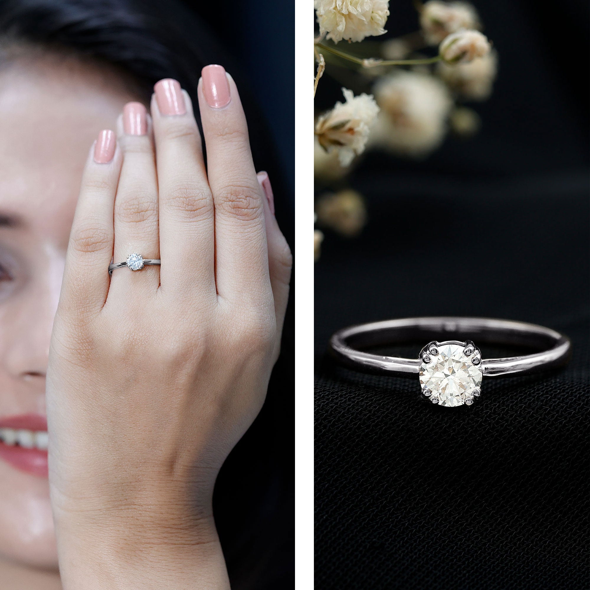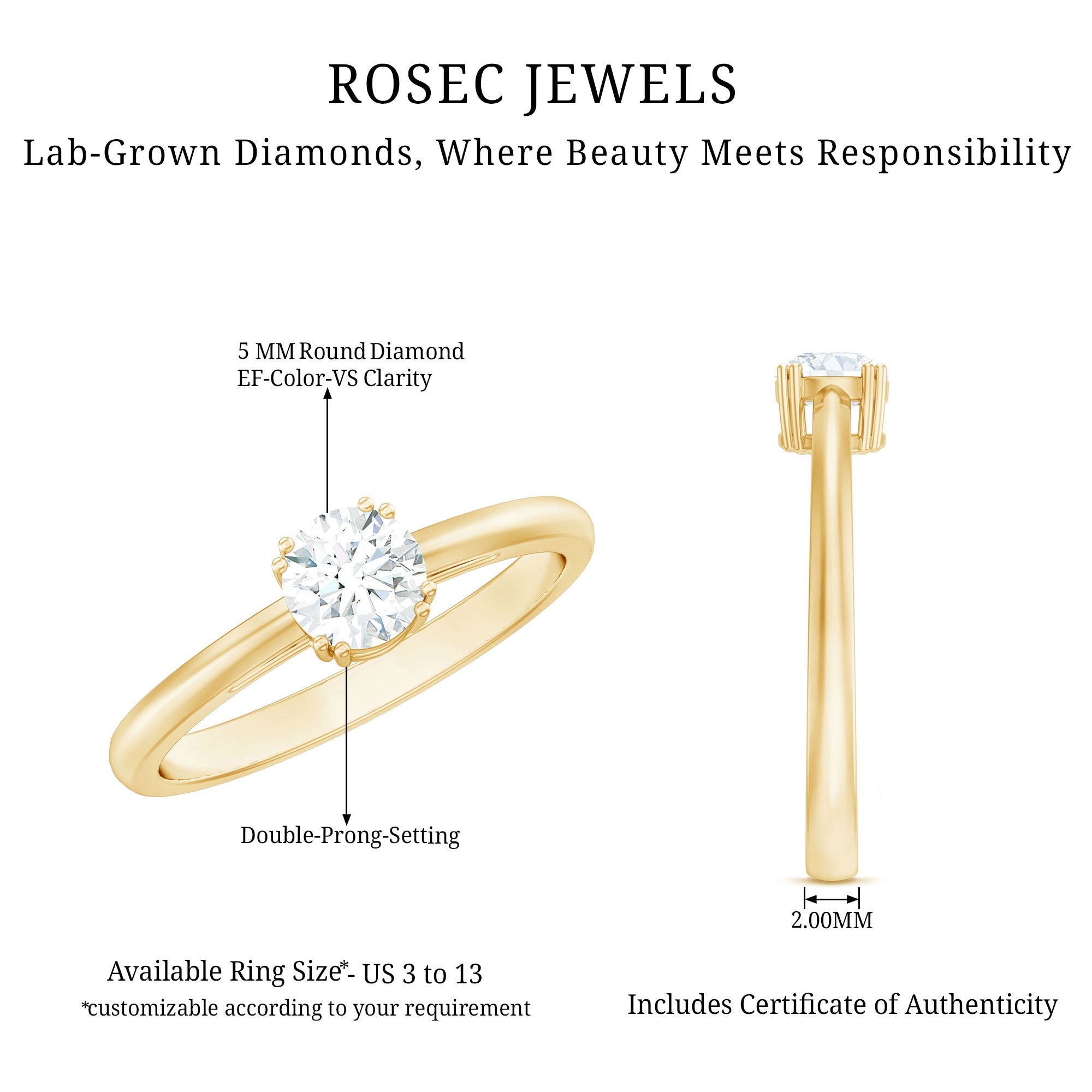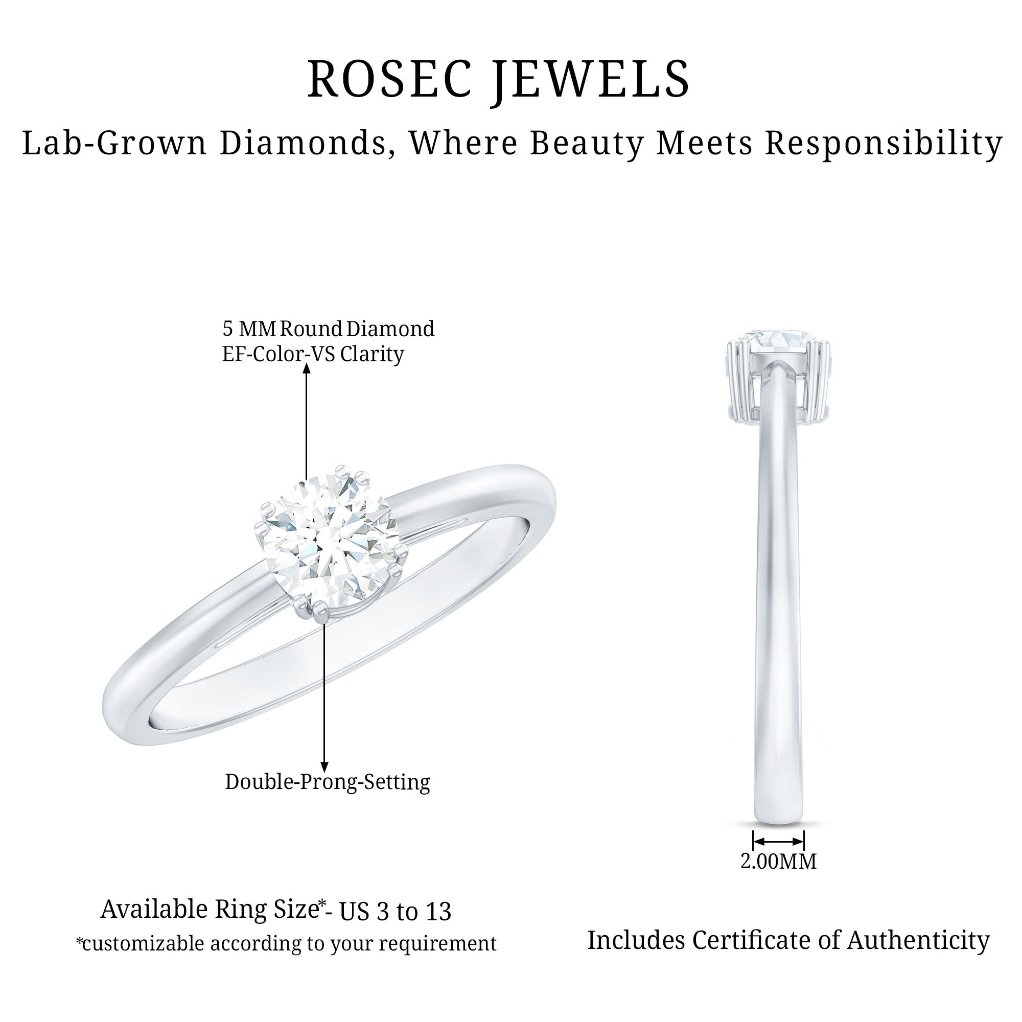 A fiery round diamond sparkles elegantly in the center of this breathtaking womens Solitaire Engagement Ring. Fashioned in top-notch metal with secure prongs, the total lab grown diamond weight of the ring is approximately 0.5 carat. Rosec Jewels is committed to making your entire experience a pleasant one, from shopping to shipping. This Diamond Promise Ring arrives in a deluxe ring box, ready for your proposal also, this Round Diamond Ring is available in a variety of metal colors, ring sizes, and purity options. If you are looking for something unique, timeless, and full of romance, this is the perfect ring to celebrate your love.