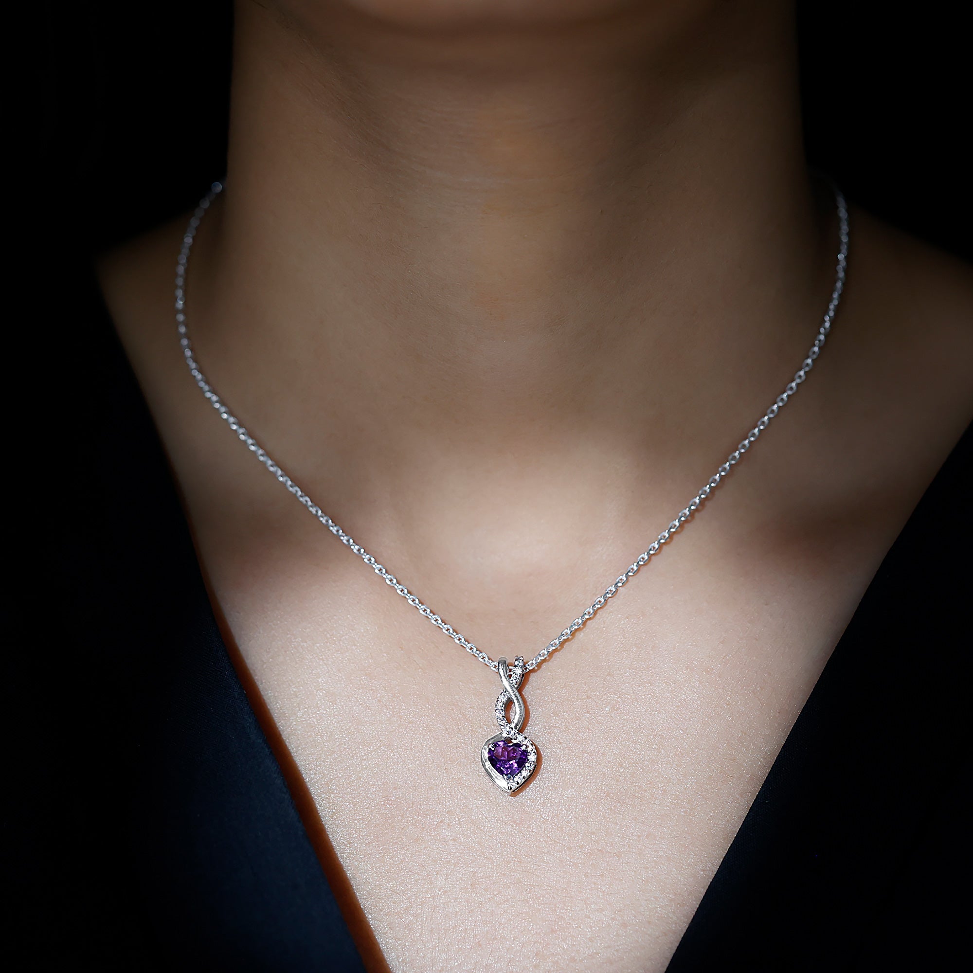 Present your heart to her in the form of this Amethyst Pendant Necklace, crafted with 14K White Gold Plated Silver. It features an 8 MM Heart Shape Amethyst secured in Prong Setting and placed at the center of a metallic infinity frame. The pendant frame is partially embedded with the smaller Moissanite and is accentuated with a hidden bail. The Heart Shape Pendant beholds the classic shine of AAA Quality Amethyst and dangles in sturdy cable chain, which makes it beautifully sit on the neckline. The Infinity Necklace will be delivered to you in a velvet pouch with the certificate of authenticity.