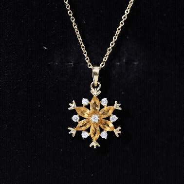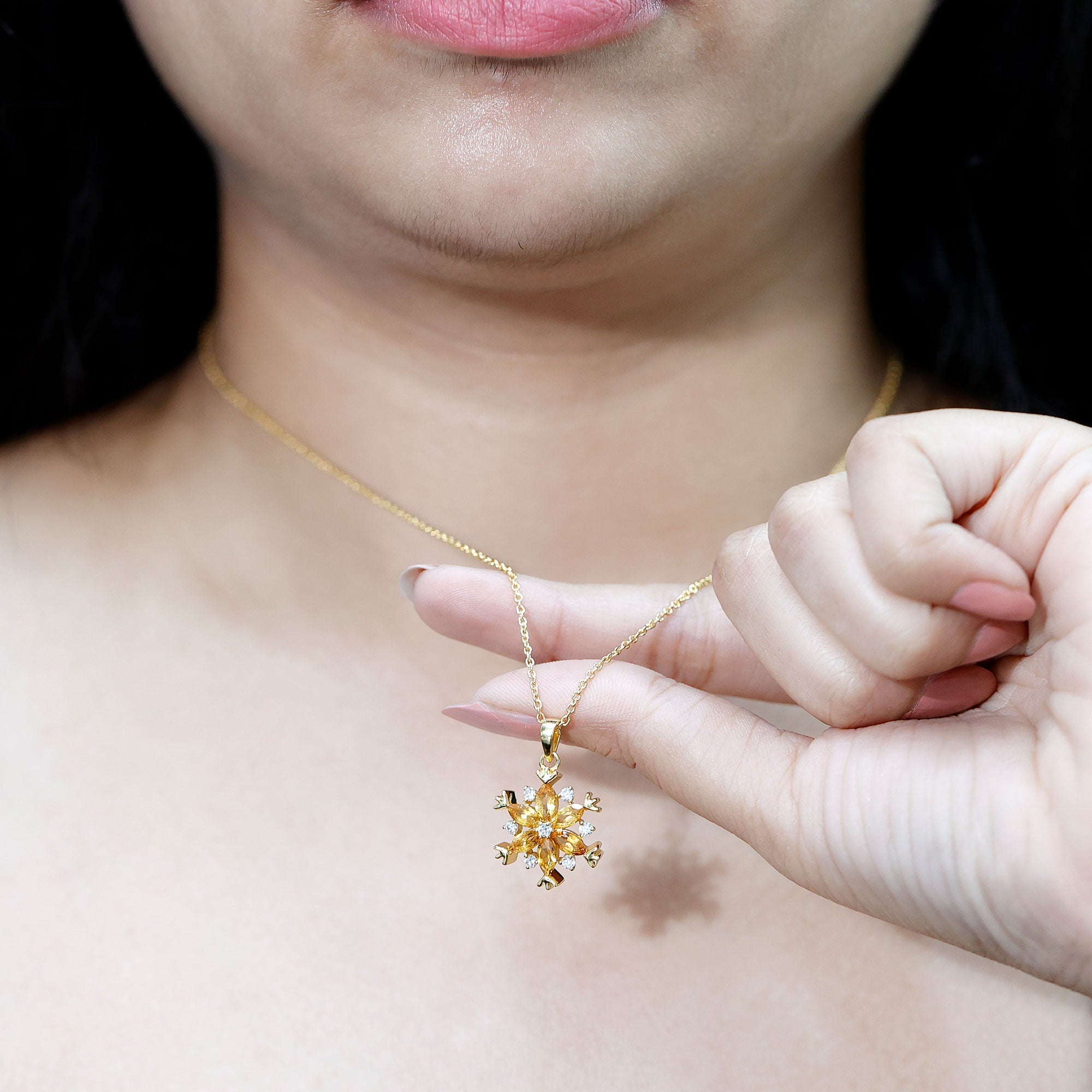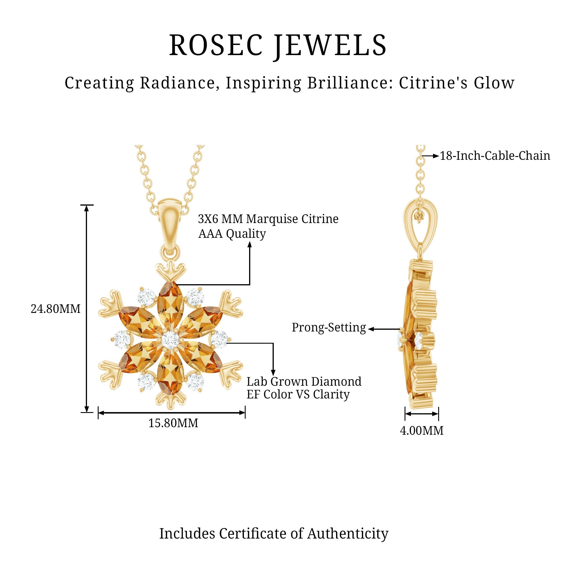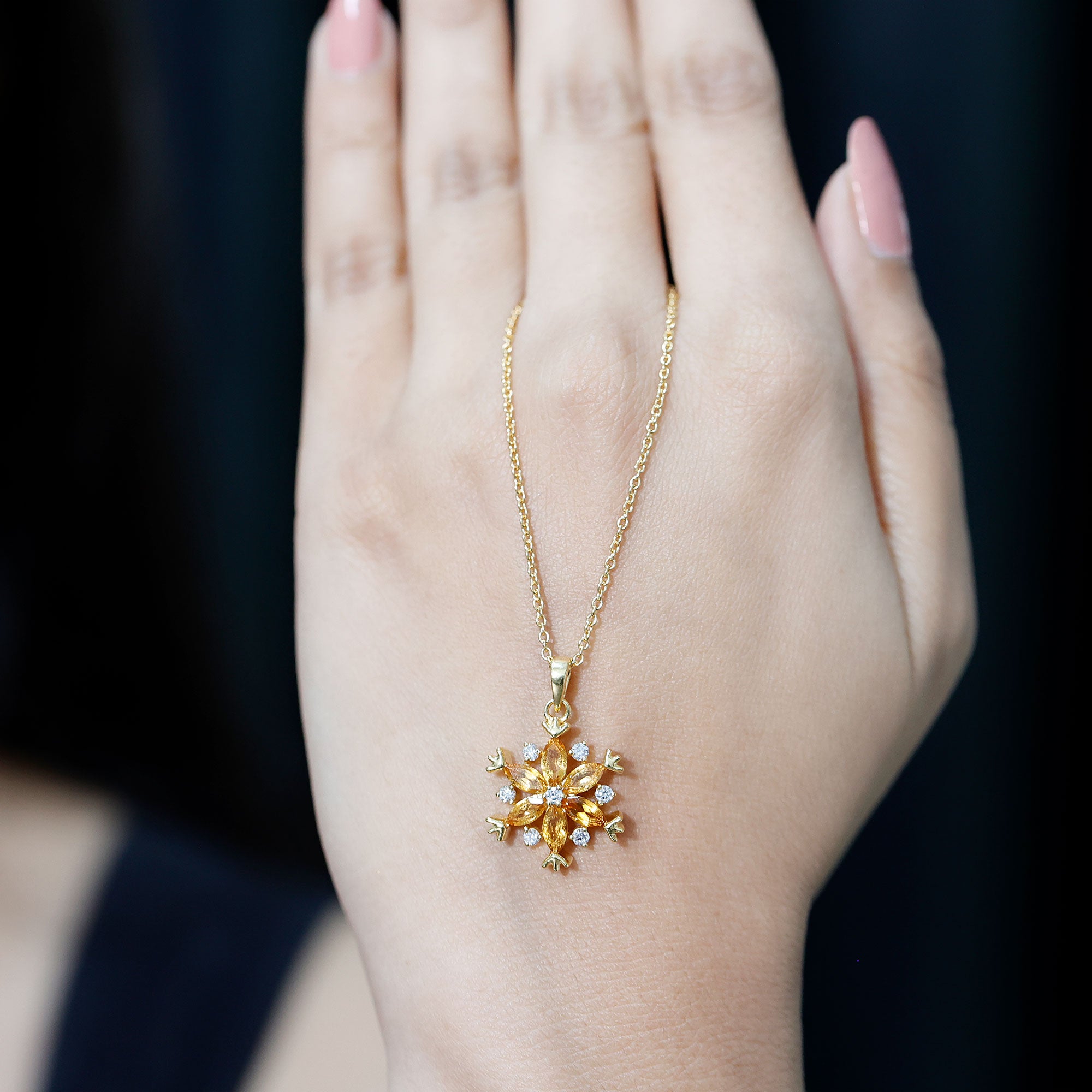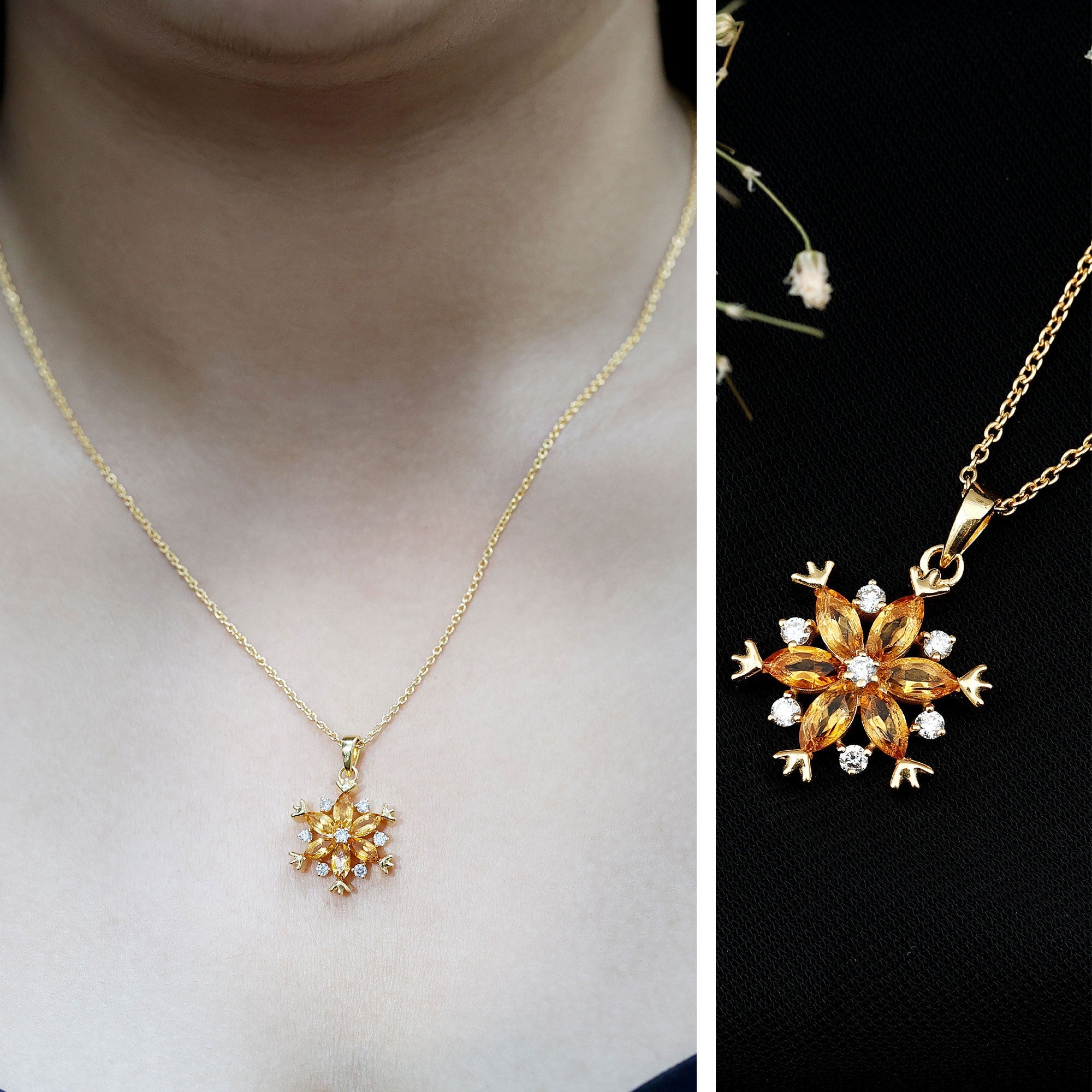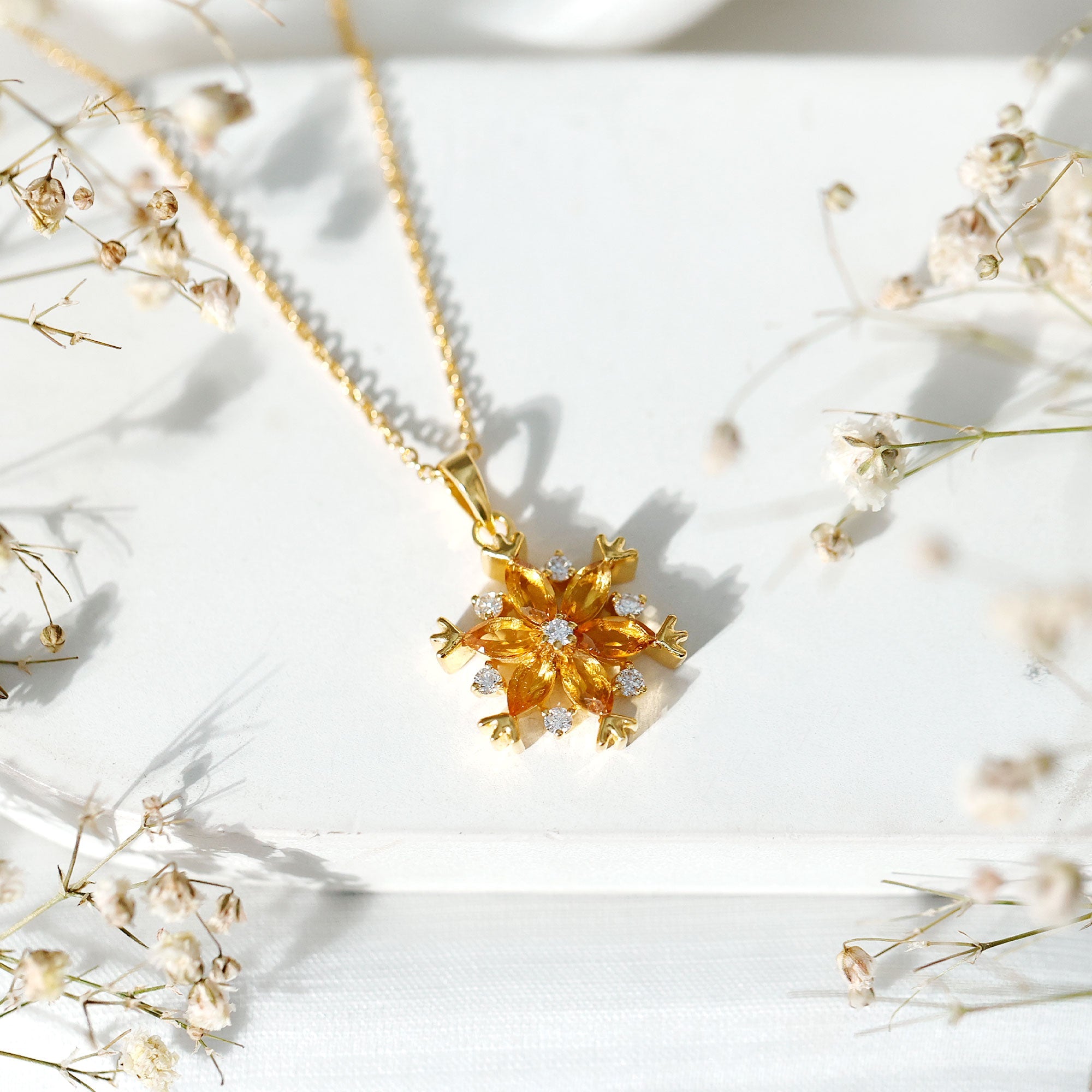 Let your style bloom with the golden warmth of this Citrine Flower Necklace, a cheerful and elegant piece that brings the beauty of nature right to your neckline. Handcrafted in 14k yellow gold plated silver, this Cluster Pendant shines with joyful energy, making it a perfect addition to your jewelry collection. The necklace features carefully placed marquise shaped Citrine gemstones arranged to form a delicate floral pattern. Set in secure prongs, each AAA quality Citrine glows with a soft golden yellow hue that feels like sunshine captured in a jewel. To enhance its sparkle, round lab grown diamonds are placed at the center and between the petals, adding a subtle shimmer that catches the light from every angle. The Citrine and Diamond Necklace dangles gracefully from a matching cable chain, resting comfortably along the neckline and bringing elegance to any outfit. As the birthstone for November, this Flower Pendant also makes a meaningful and personal gift for loved ones born in that month. This necklace arrives with a gemstone certificate and is beautifully packed in a signature jewelry box, ready for gifting or treasuring. Let this Snowflake-Inspired Necklace be your symbol of happiness, warmth, and the radiant beauty found in nature.