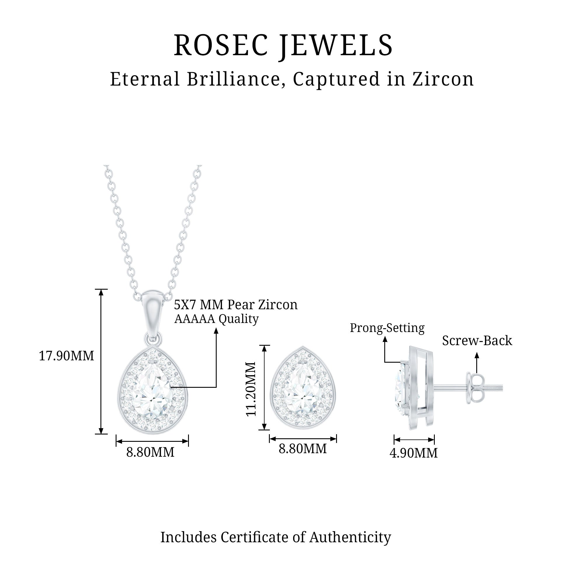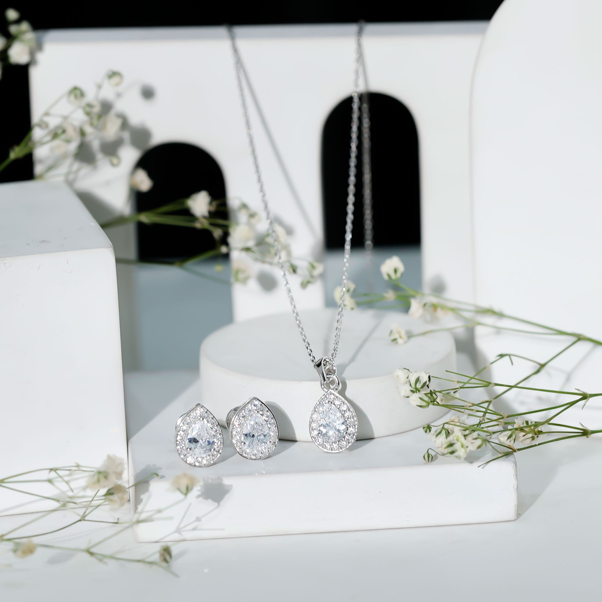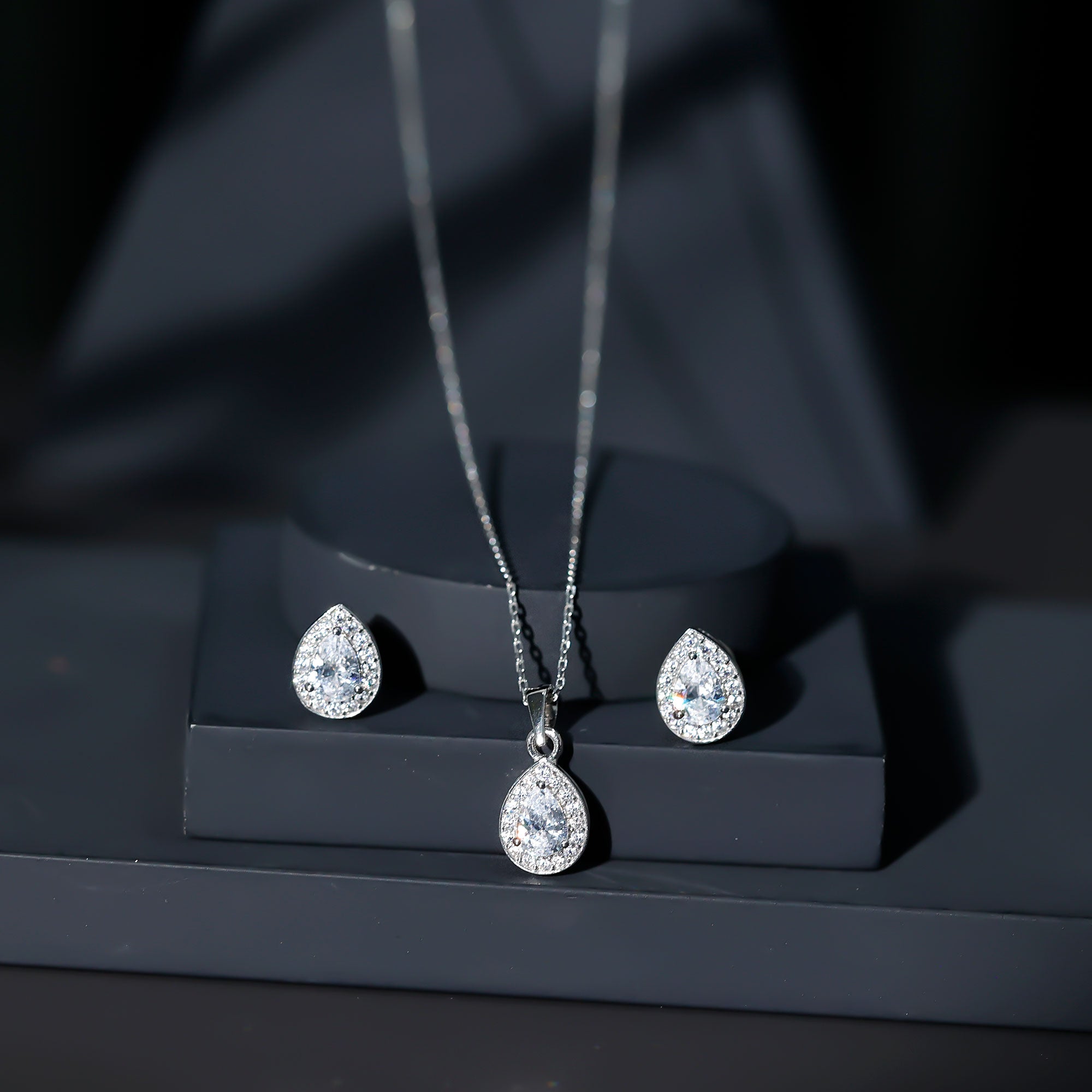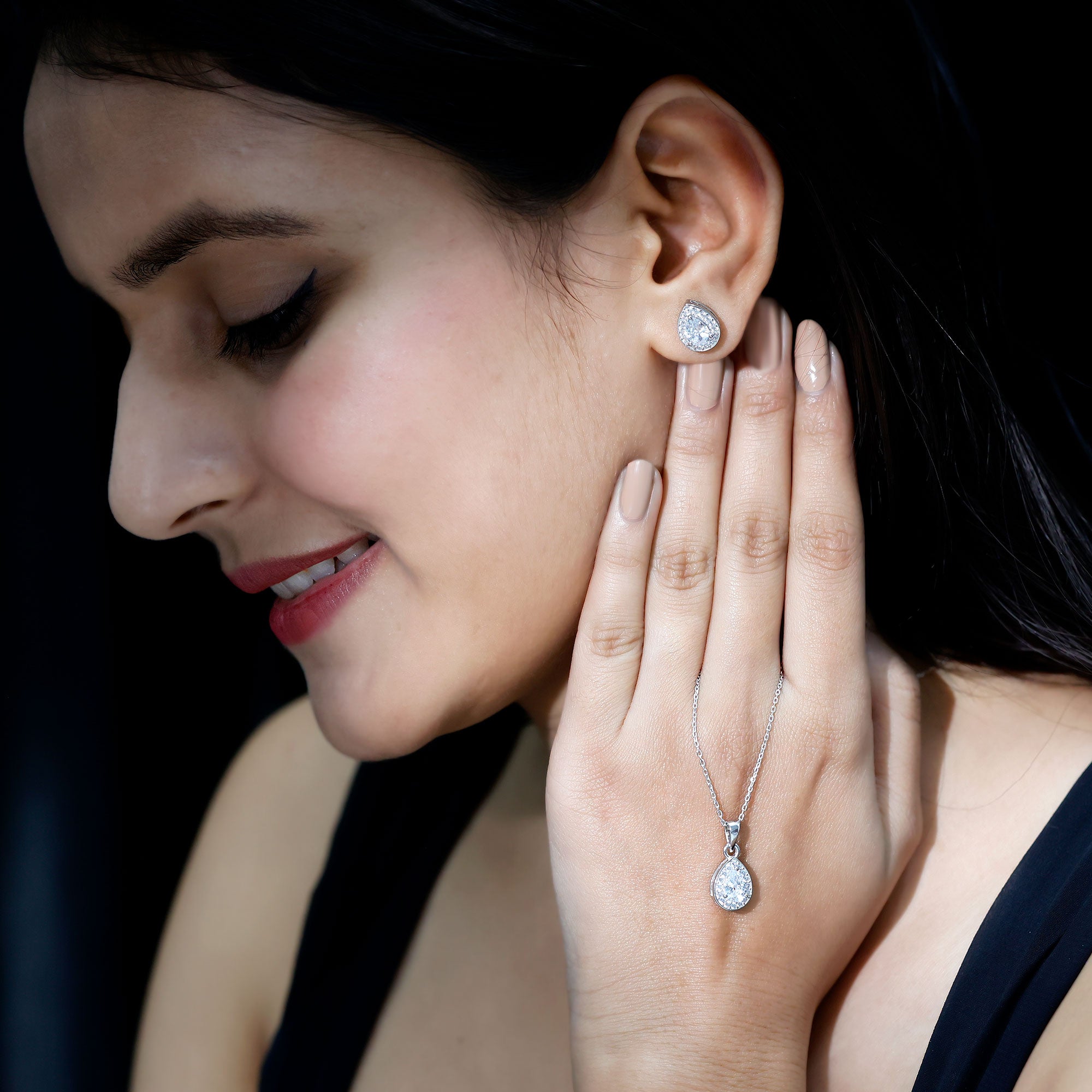 This CZ Jewelry Set is all you want to dazzle every day. The Earrings Necklace Set features a pendant with chain and a pair of stud earrings handcrafted with white gold plated silver. The pendant features a 5X7 MM Pear Shape Zircon encircled by a Halo of smaller stones, securely placed in Prong Setting and dangles in a sturdy cable chain. The earrings feature a 5X7 MM Zirconia surrounded by petite gemstones, enhancing the grace of the cartilage. This Necklace and Earring Set can be styled with formal looks or for cocktail parties. This Classic Jewelry Set will be delivered to you in a premium packaging with the certificate of authenticity.