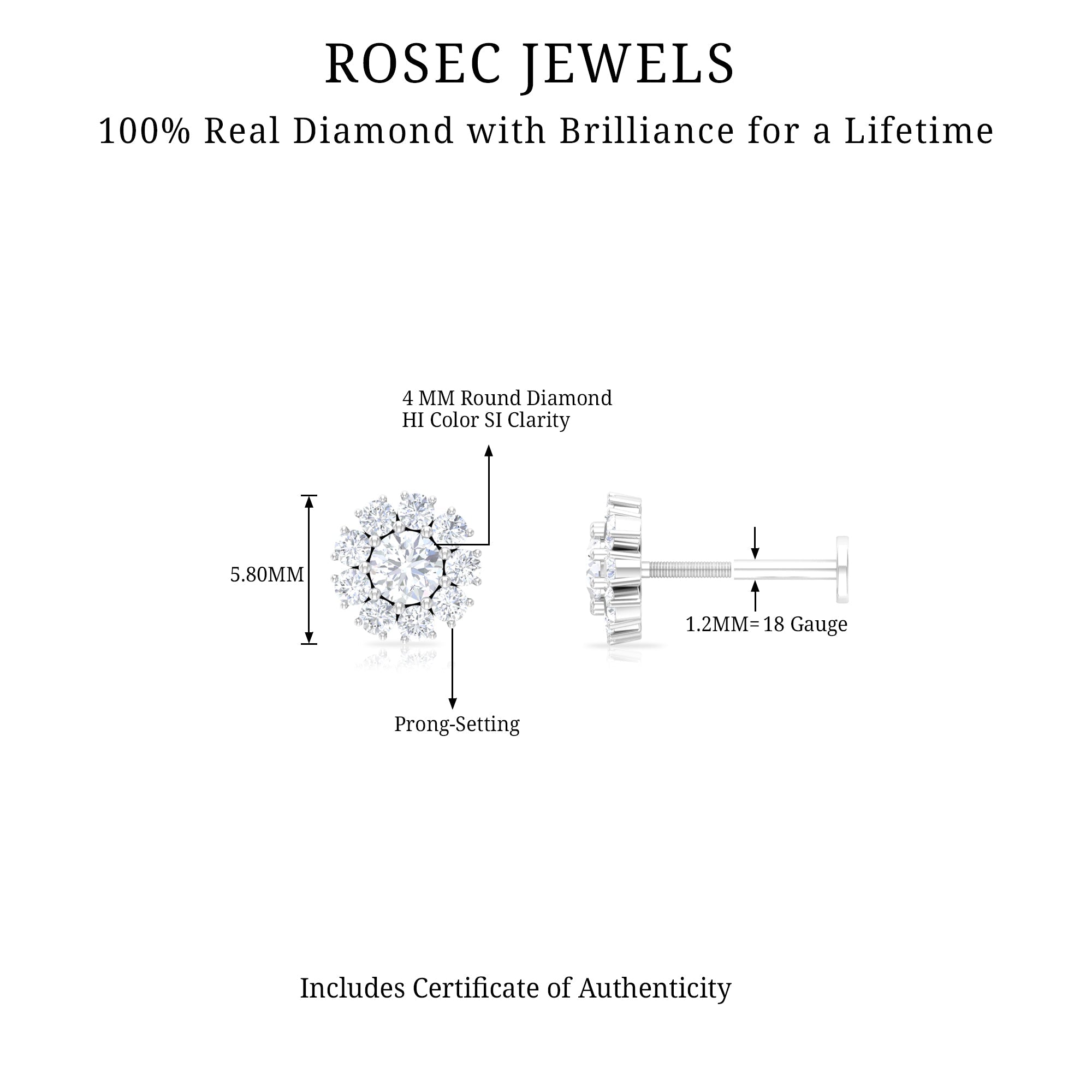 Effortlessly elevate your style with the stunning Diamond Cluster Earring! It features a delicate Round Diamond surrounded by a halo of more diamonds, all set in prong setting. This diamond piercing earring is the ideal addition to your Conch, Helix, Cartilage, Rook, or Upper Lobe Piercing. Whether you are going for a casual vibe or dressing up for a special event, do not miss out on showcasing this captivating piece. Made with care and meant to be a treasured keepsake, this Cluster Helix Earring is a perfect gift for Birthdays, Anniversaries, or Valentine’s Day. This lightweight and comfy earring comes with secure flat back closure for all-day wear, smoothly transitioning from daytime elegance to nighttime charm, making it a versatile piece in any jewelry collection. Not every occasion calls for bold accessories; you can wear this Halo Stud alone or mix it with other earrings to highlight the finer details. Elevate your look with this Cartilage Stud Earring, which adds a unique and artistic flair. The subtle elegance of this piece ensures its timeless charm, making it a staple in your collection for years to come. Adorn your ears with this chic stud, as its enchanting beauty is sure to leave an impression.