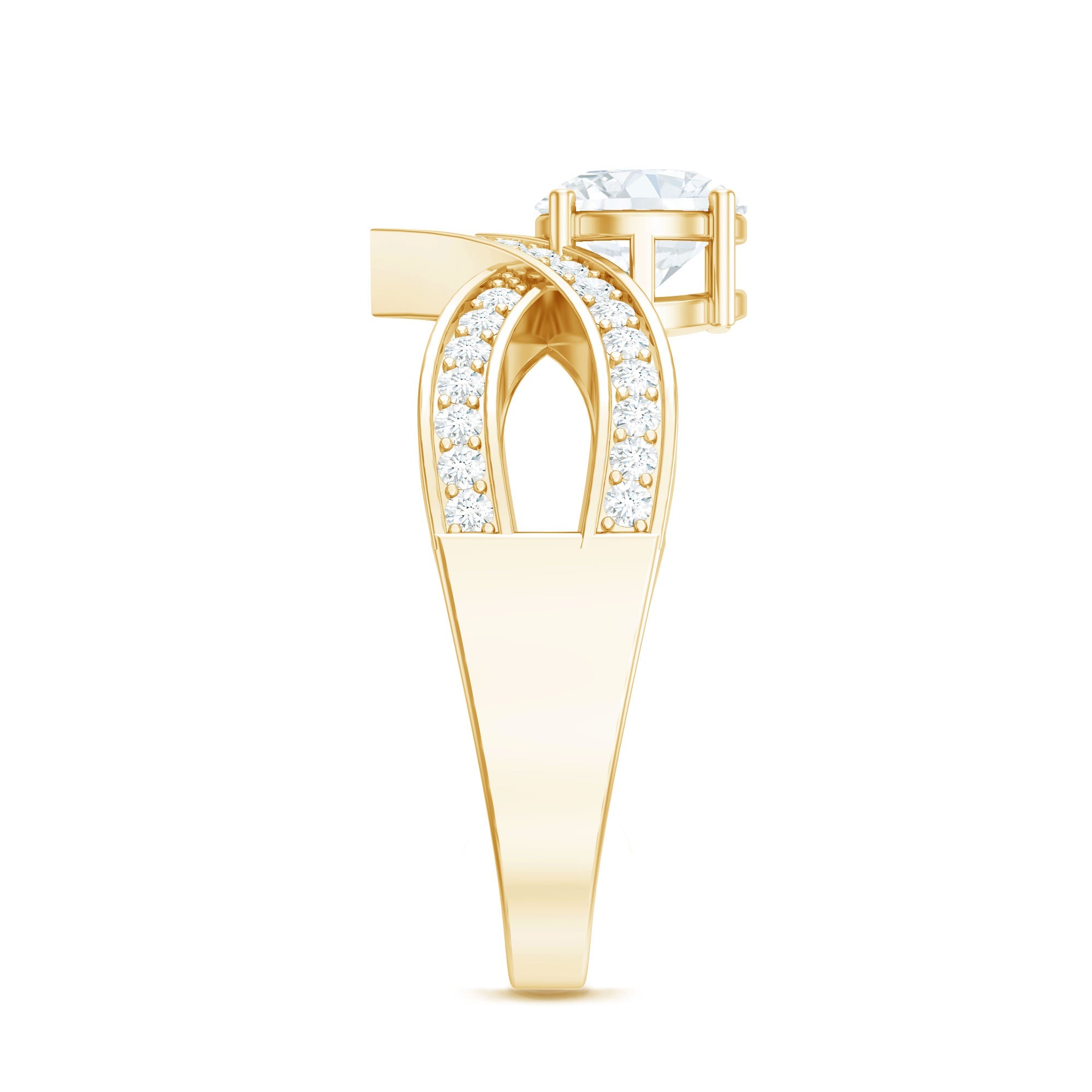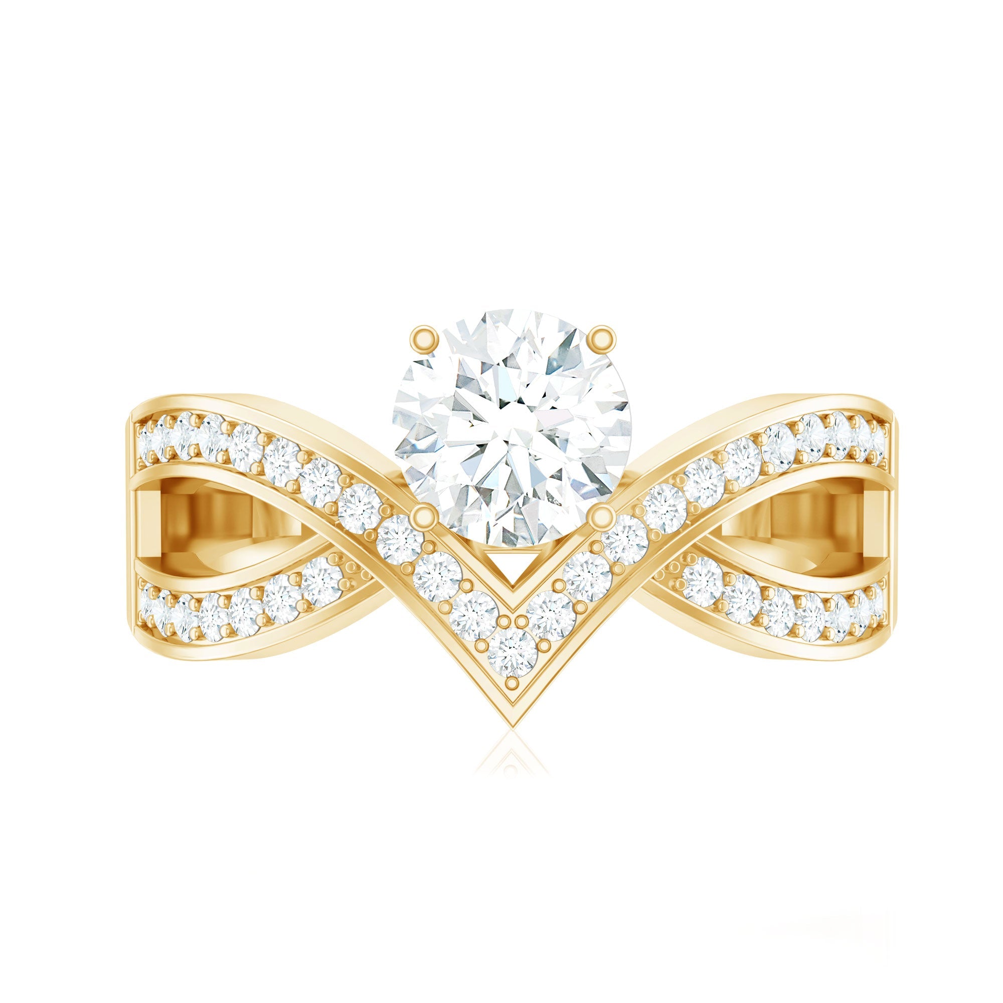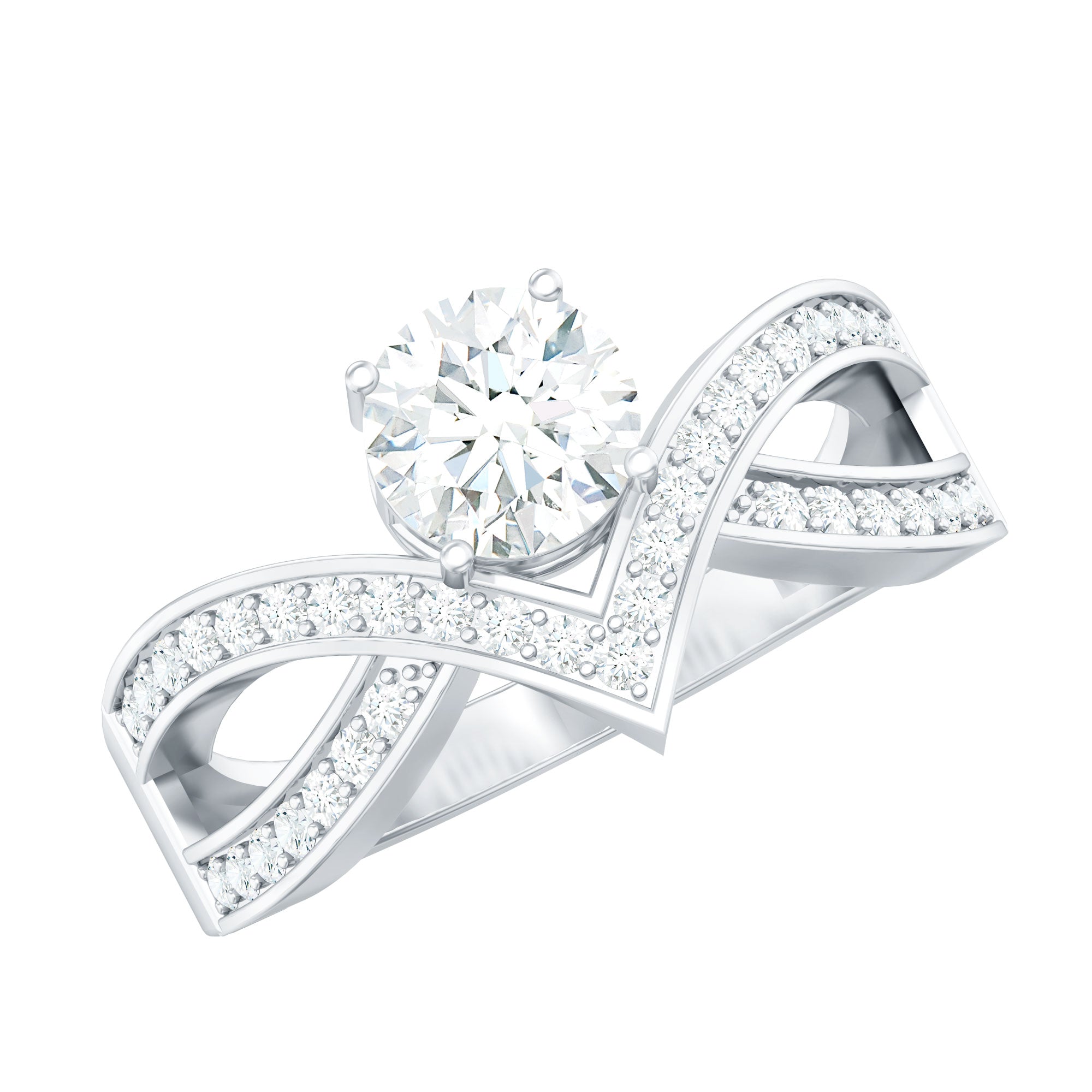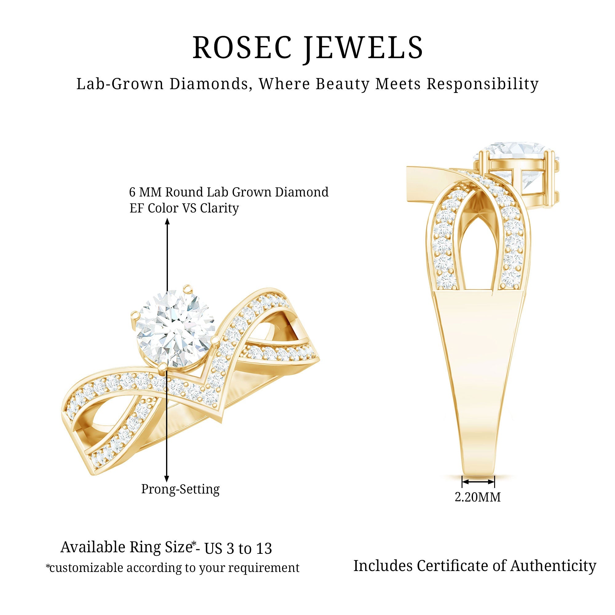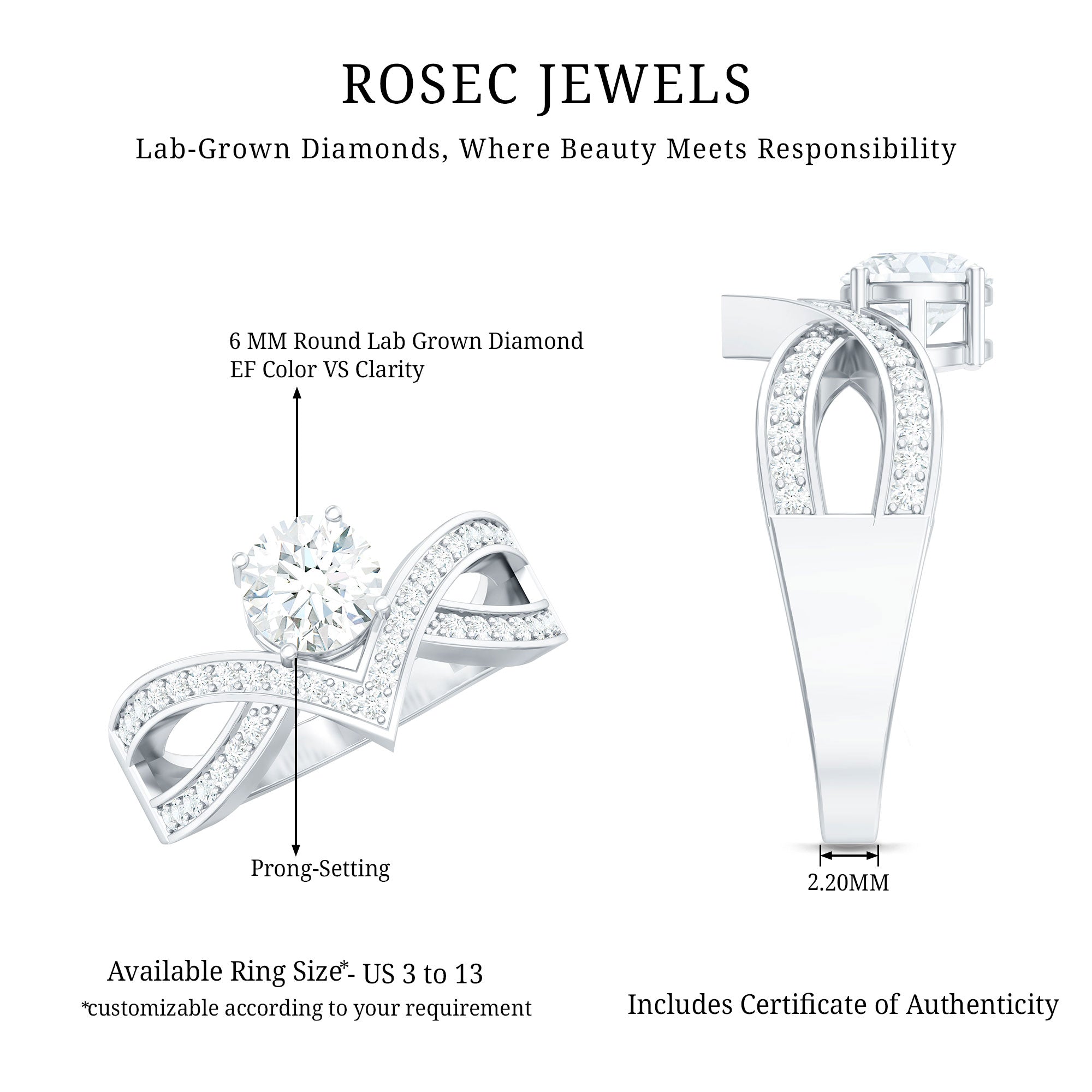 Capturing hearts with timeless elegance, this Designer Engagement Ring is a masterpiece that seamlessly blends sophistication and style. Meticulously crafted, this ring is adorned with 6x6 mm Round Shape Lab Grown Diamond gemstones studded over the Interlocking V Shape Band, symbolizing eternal love. Elevate your love story with this enchanting symbol of commitment. Ef-Vs Quality Diamond is placed in this Man made Diamond Ring which makes the ring center of attraction.