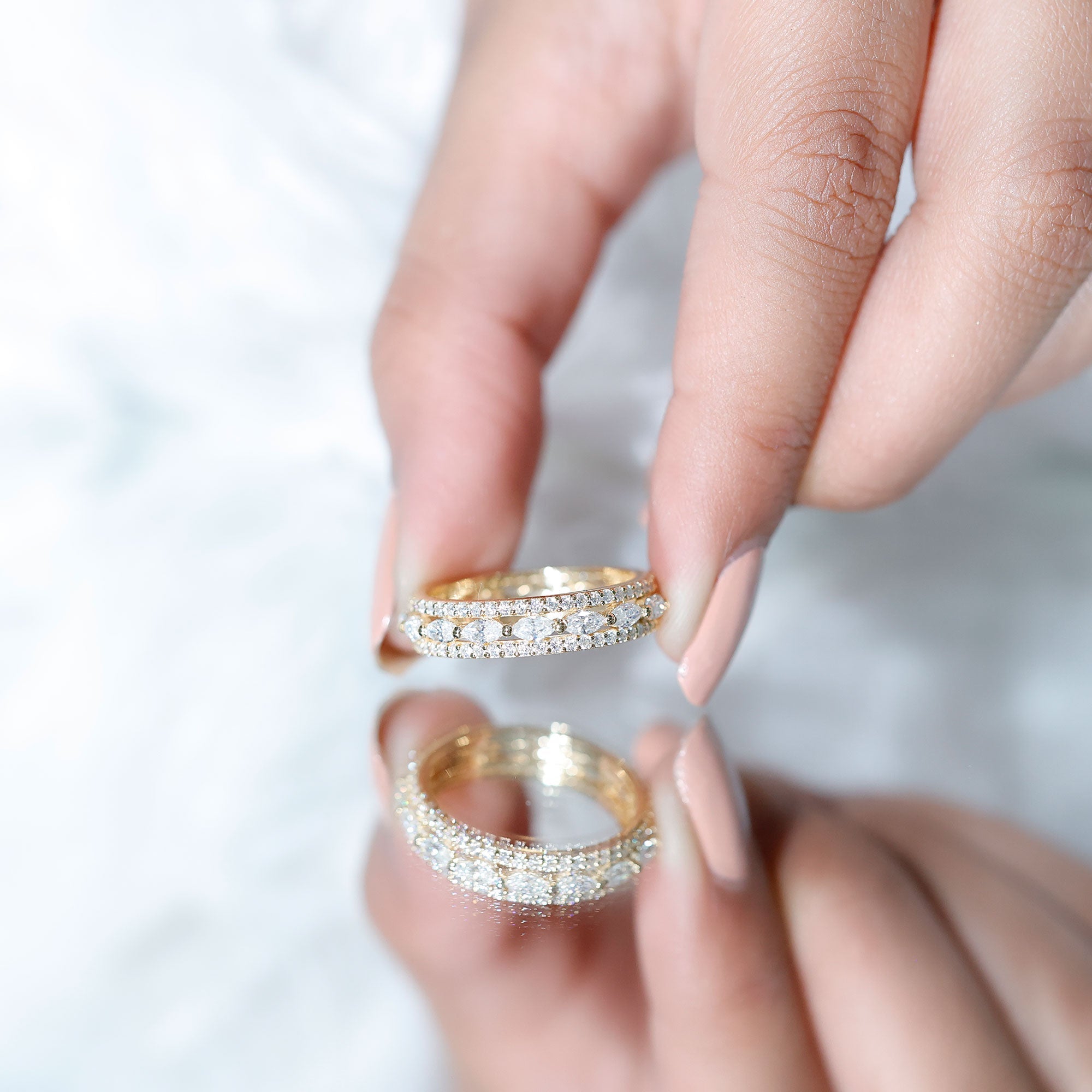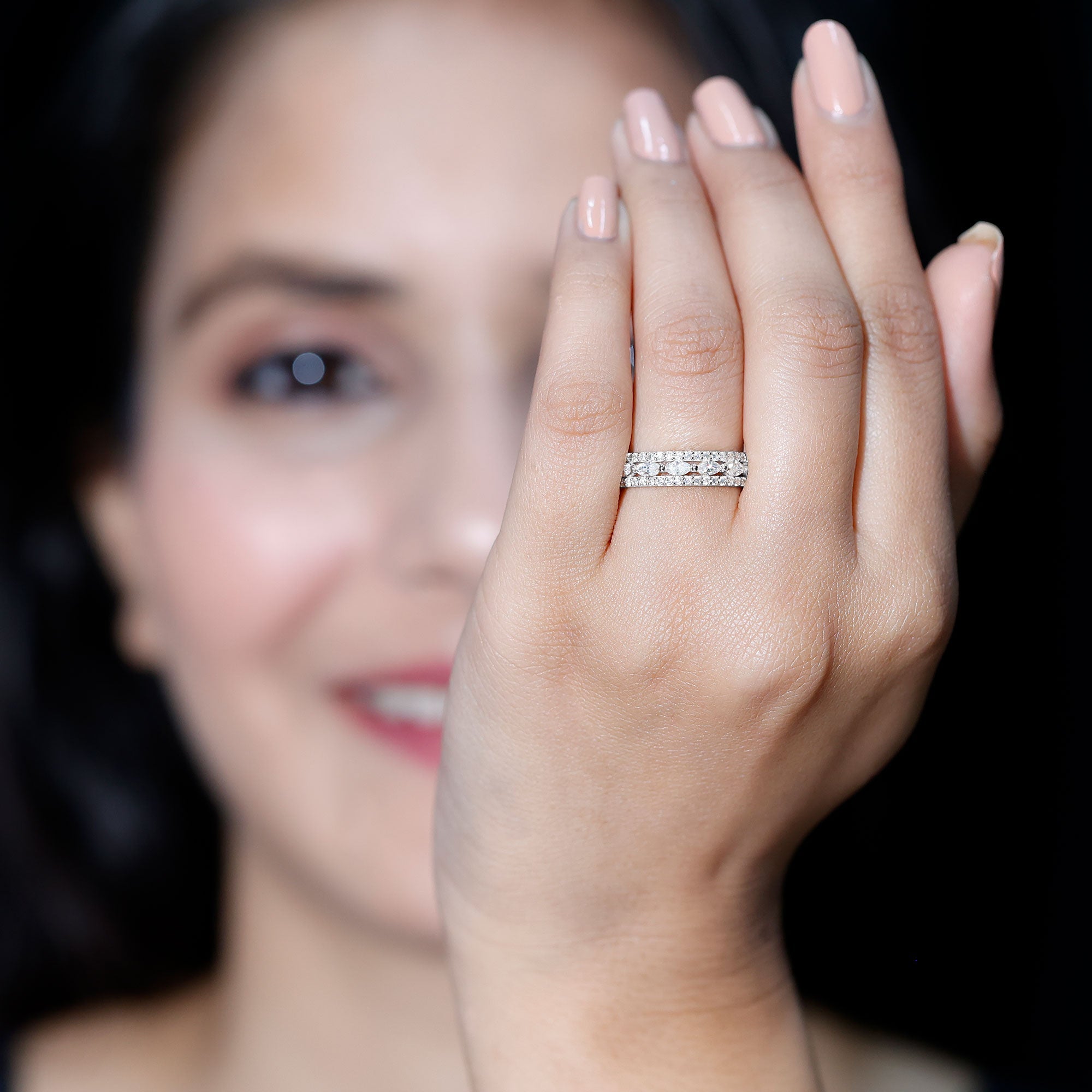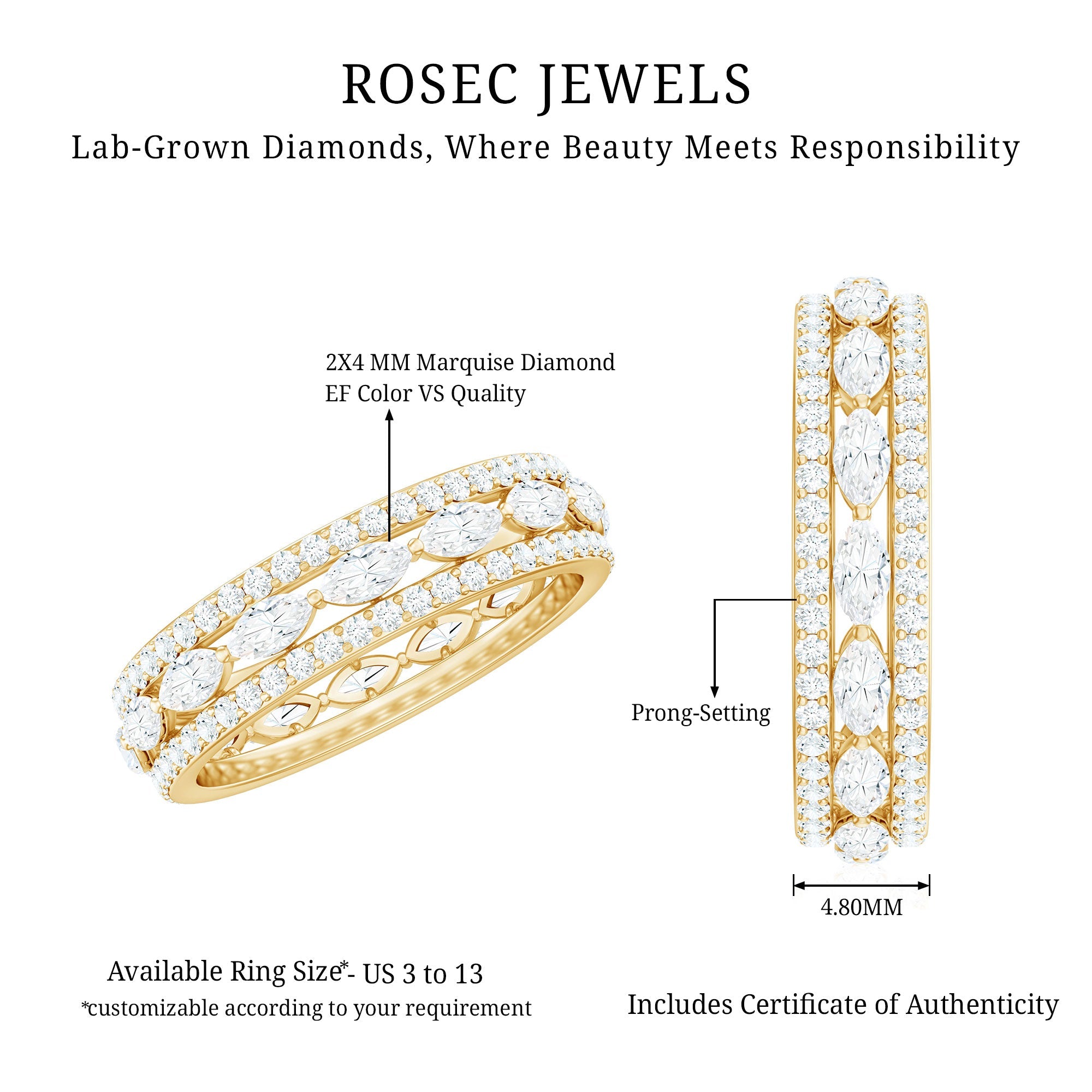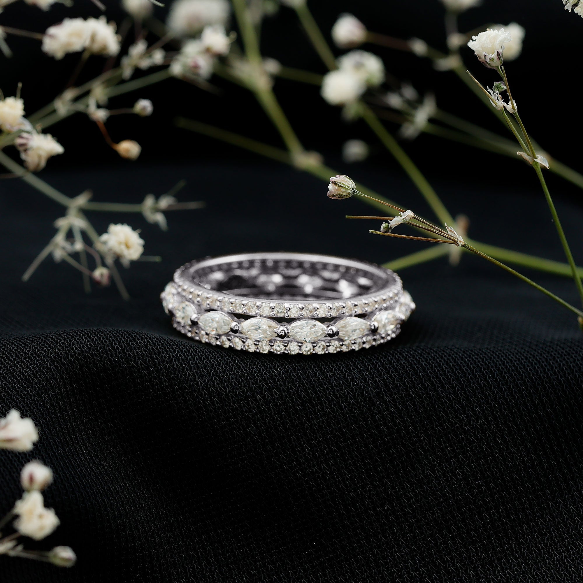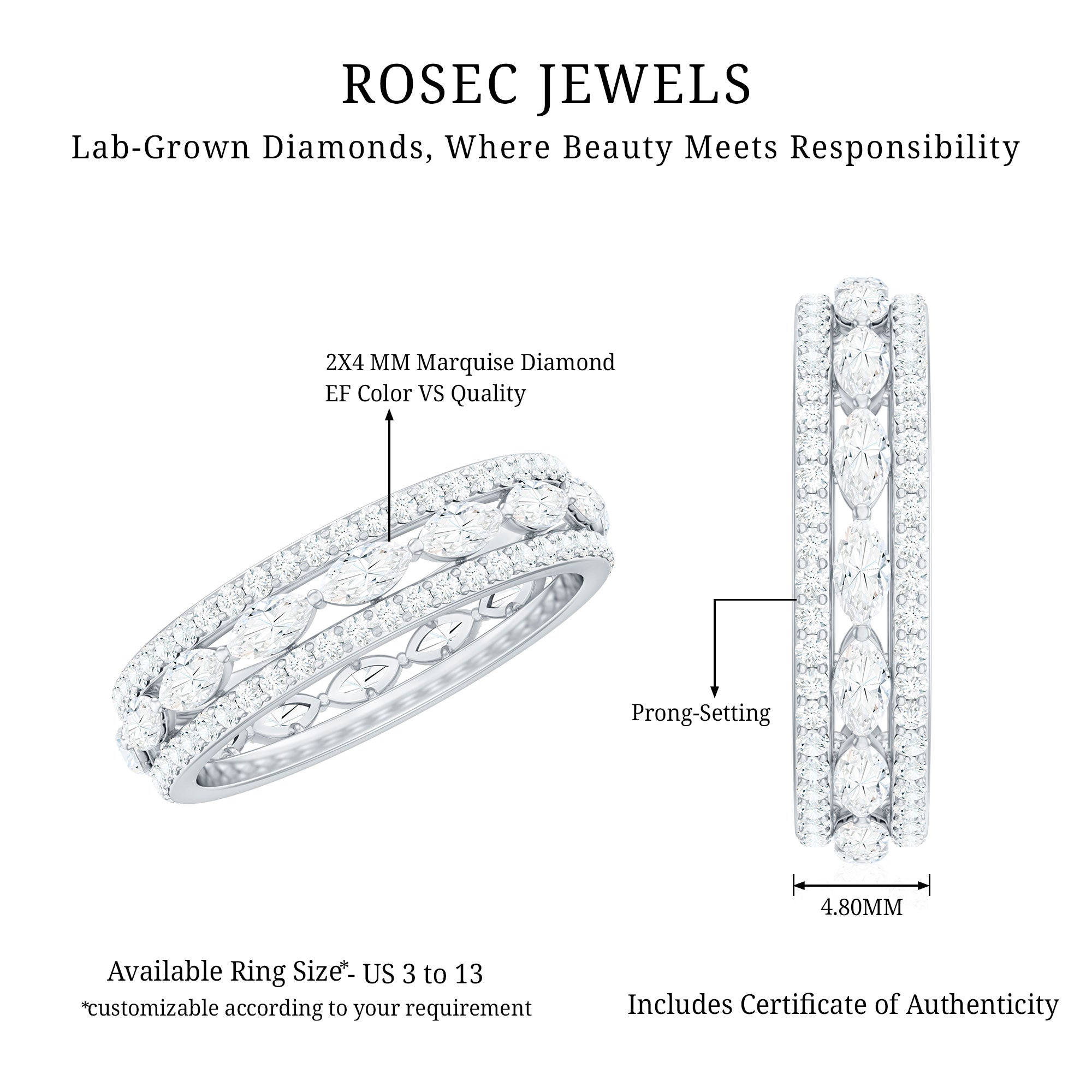 Illuminate your days with this exquisite Lab Created Diamond Eternity Band, an ideal way to honor love, milestones, and cherished memories. This gorgeous Eternity Wedding Ring showcases three rows of marquise and round shape lab grown diamond stones securely held by prong setting and glimmer with every movement. This Wedding Band for Women represents eternity, embodying something significant, stylish, and durable. The Lab Diamond stones are meticulously set around the band, providing a complete circle of brilliance that looks stunning from every perspective. Whether you are commemorating a wedding anniversary, a special event, or simply treating yourself to something extraordinary, this Diamond Anniversary Band adds the perfect hint of elegance to your look. Comfortable enough for everyday wear yet sophisticated for special occasions, this Diamond Band is a piece you will never want to remove. Delivered in a lovely jewelry box, it is ready to bring joy to someone special. This Designer Band Ring serves as a reminder of your journey and that every moment in life deserves to be celebrated. Allow your hands to shine with happiness, style, and a touch of enchantment.