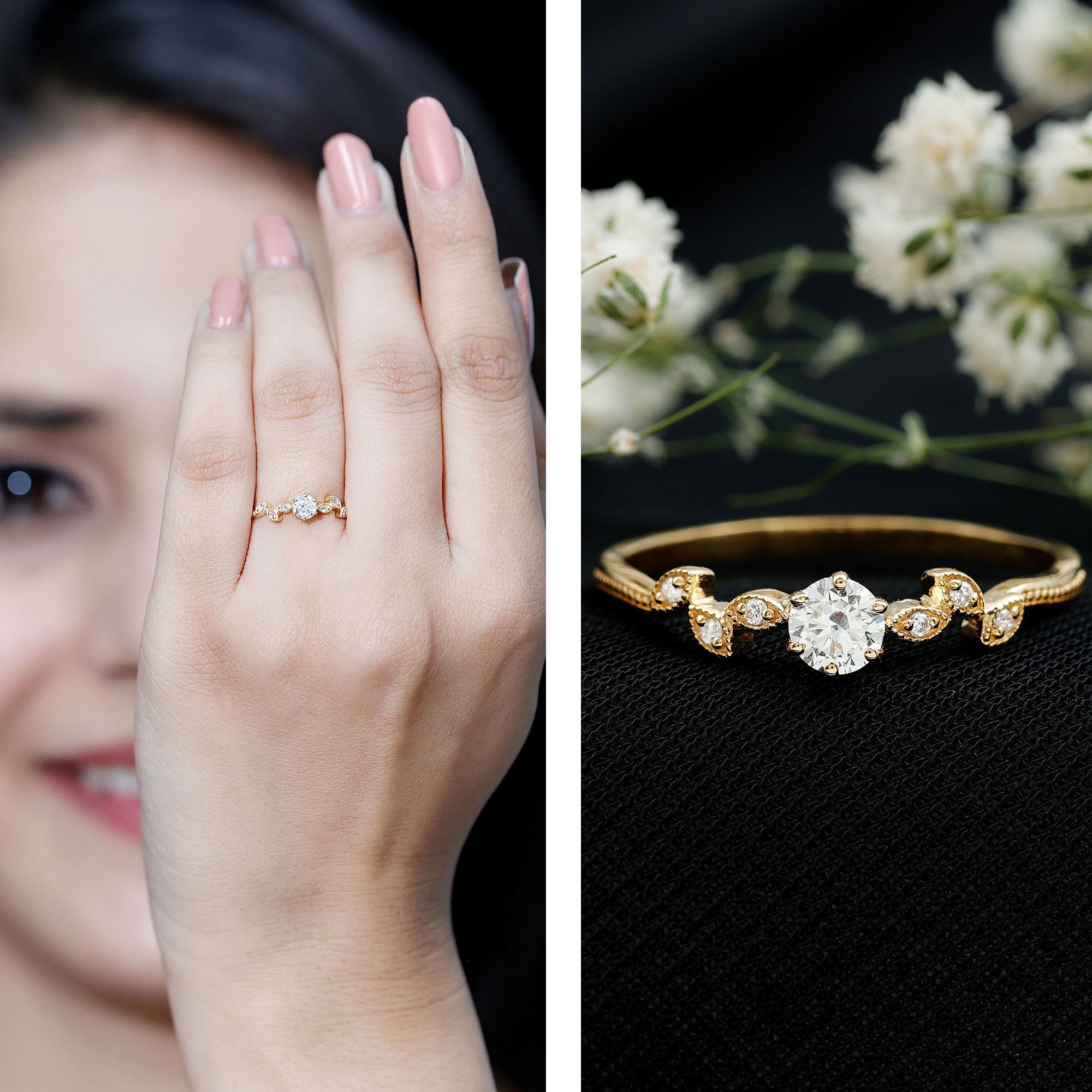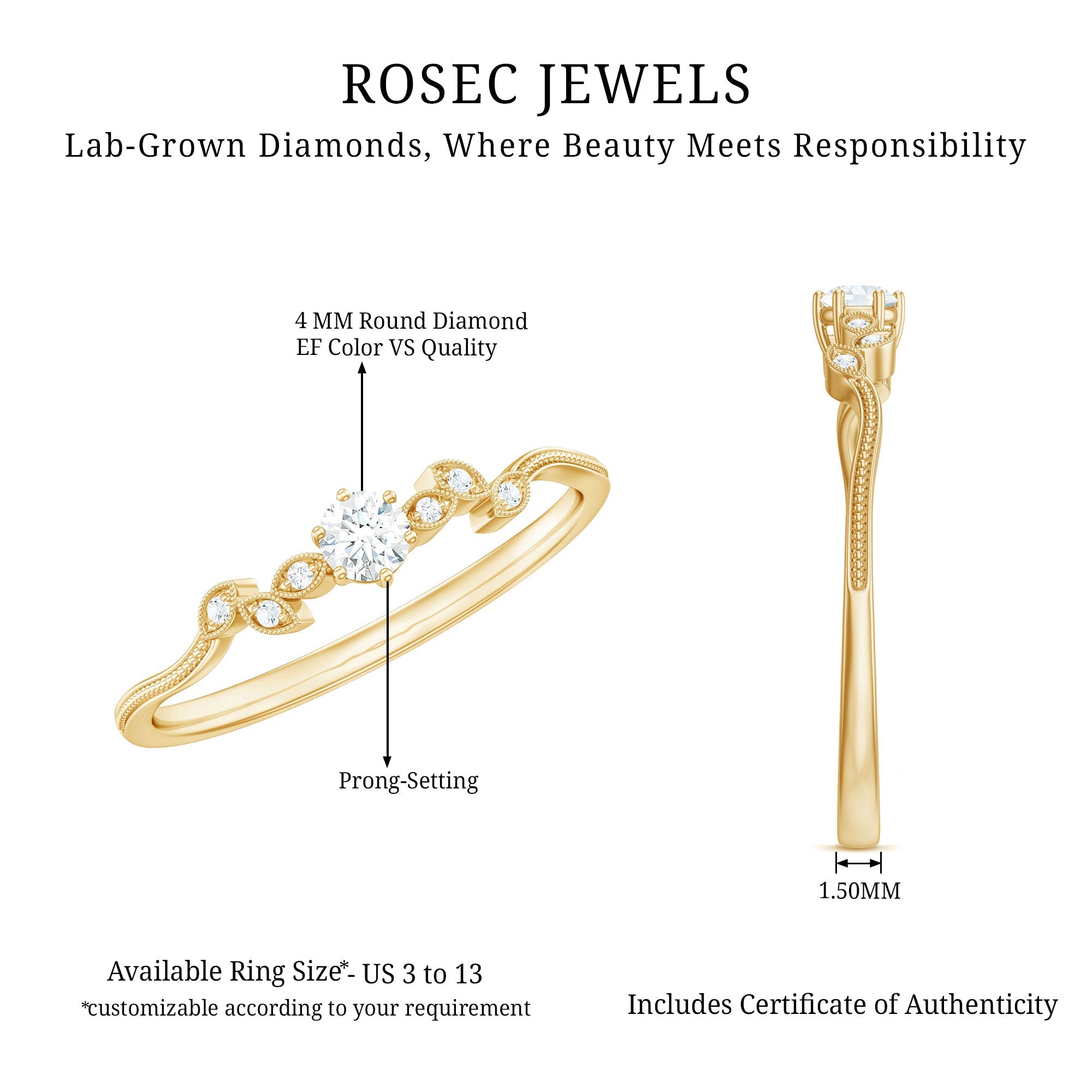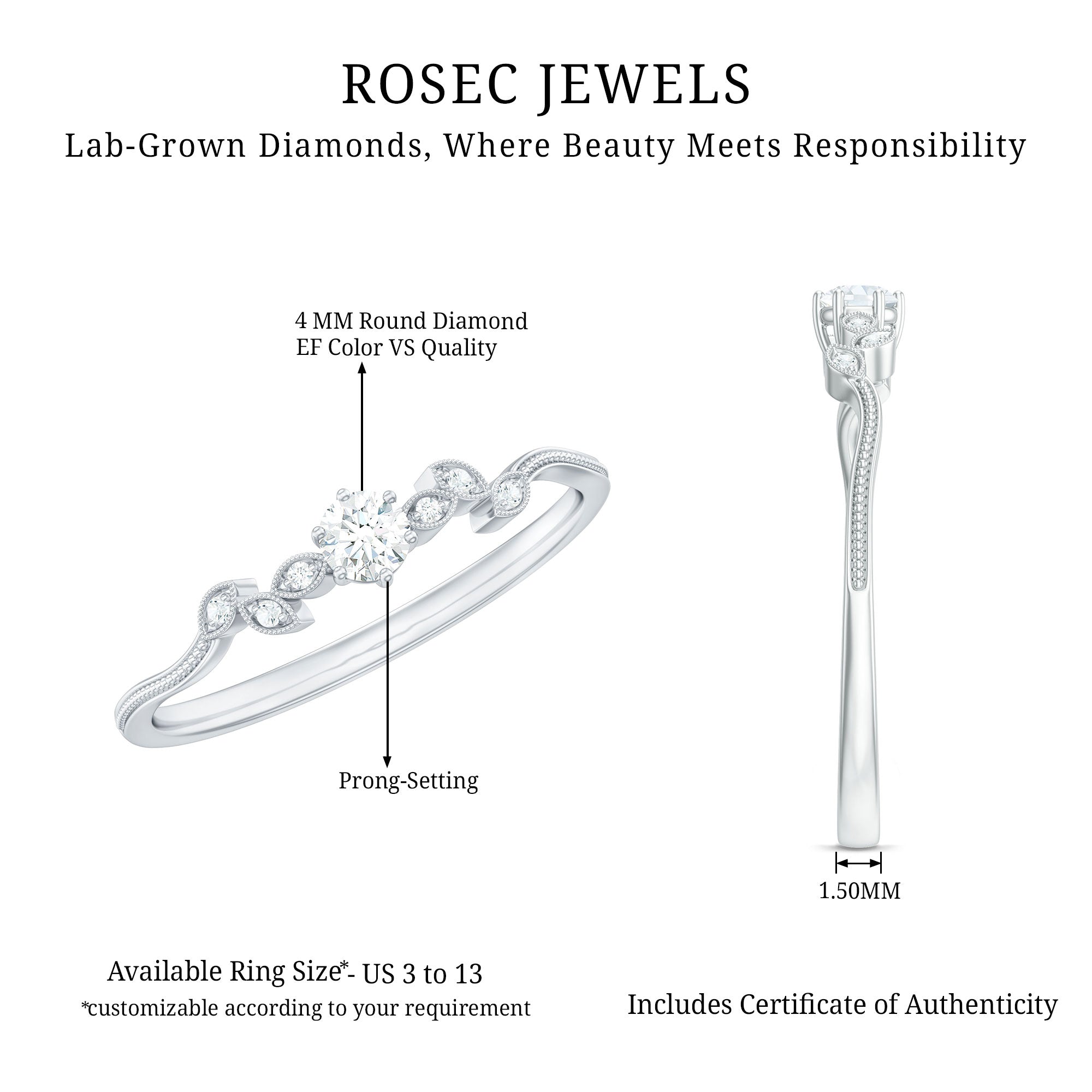 This exquisite Lab Grown Diamond Ring is a true masterpiece, capturing the beauty of nature in its unique design. At the center of this Minimalist Ring, a 4 MM round cut diamond of Ef-Vs quality sits as a showstopper in a secure 6 prong setting. The band of this Diamond Promise Ring features a leaf branch-like pattern embellished with dainty round cut diamonds and milgrain detailing. This Nature Inspired Ring is perfect for celebrating any occasion, whether it is for a proposal, anniversary, or a thoughtful birthday gift. This Diamond Leaf Ring is a great way to show love, appreciation, and connection to your loved one.