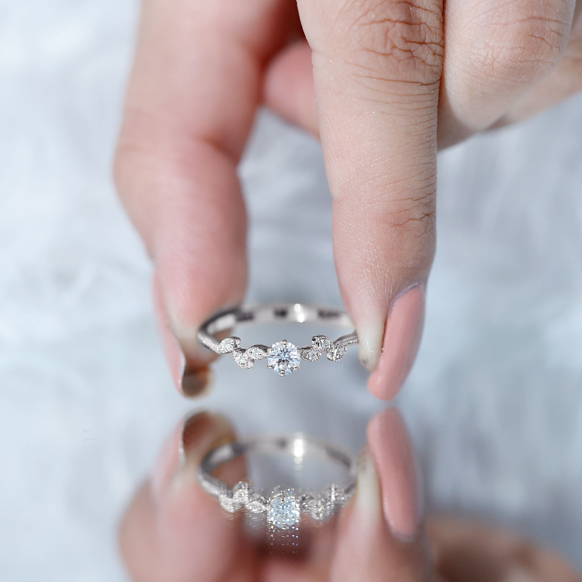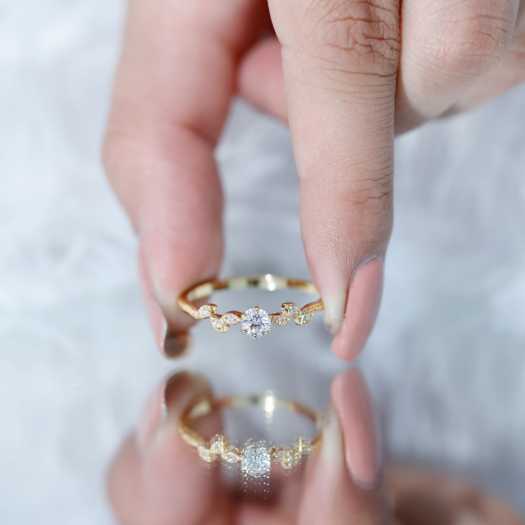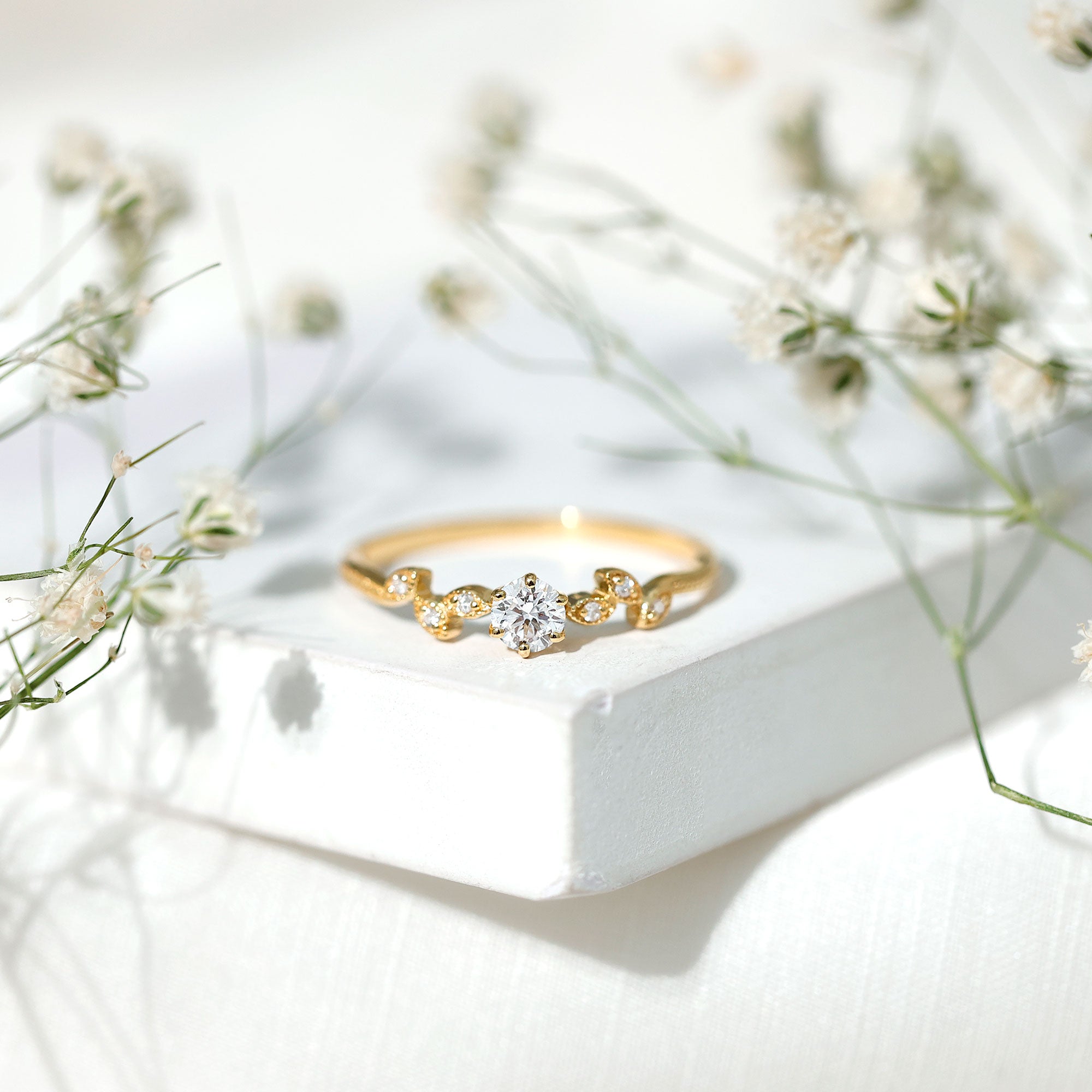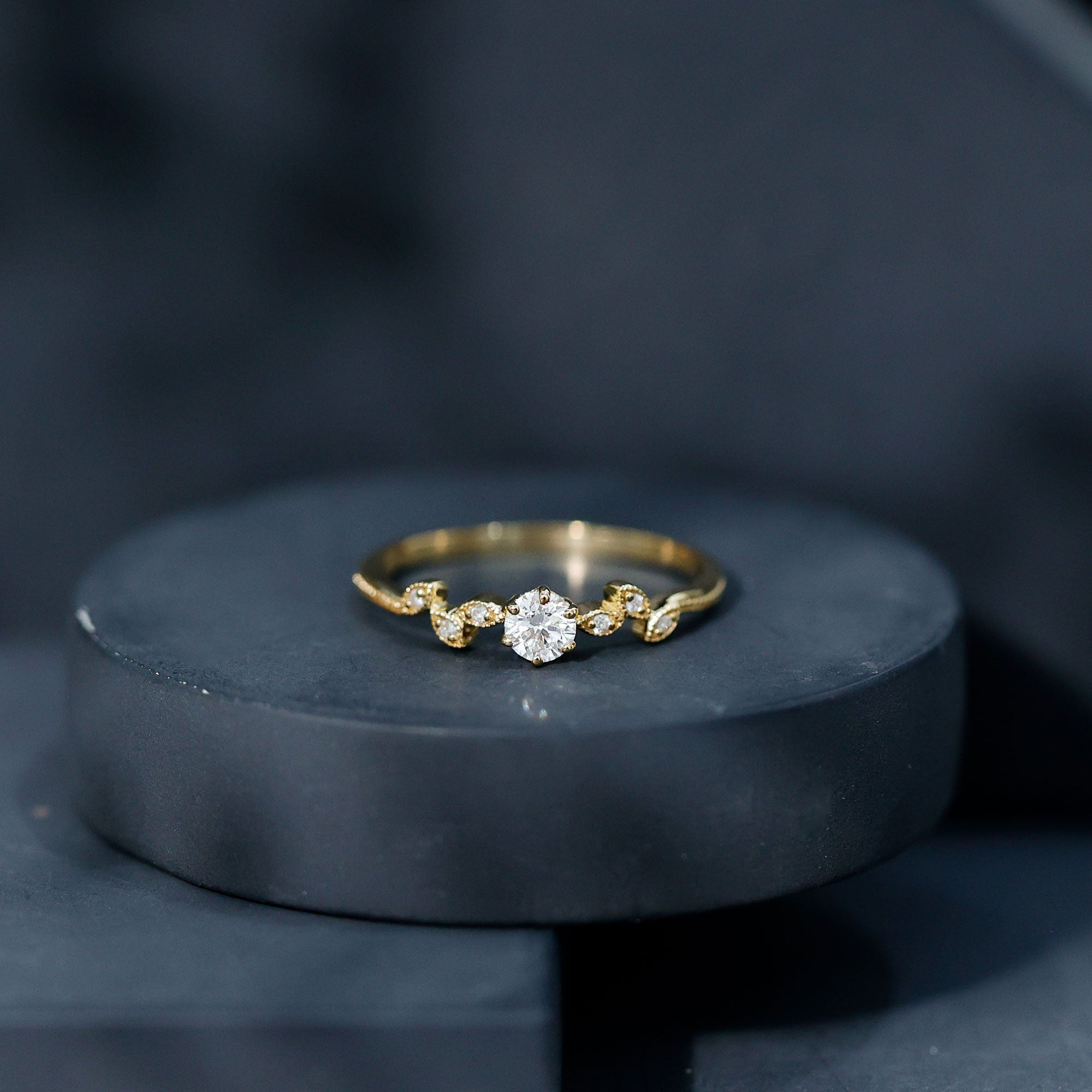 This exquisite Lab Grown Diamond Ring is a true masterpiece, capturing the beauty of nature in its unique design. At the center of this Minimalist Ring, a 4 MM round cut diamond of Ef-Vs quality sits as a showstopper in a secure 6 prong setting. The band of this Diamond Promise Ring features a leaf branch-like pattern embellished with dainty round cut diamonds and milgrain detailing. This Nature Inspired Ring is perfect for celebrating any occasion, whether it is for a proposal, anniversary, or a thoughtful birthday gift. This Diamond Leaf Ring is a great way to show love, appreciation, and connection to your loved one.