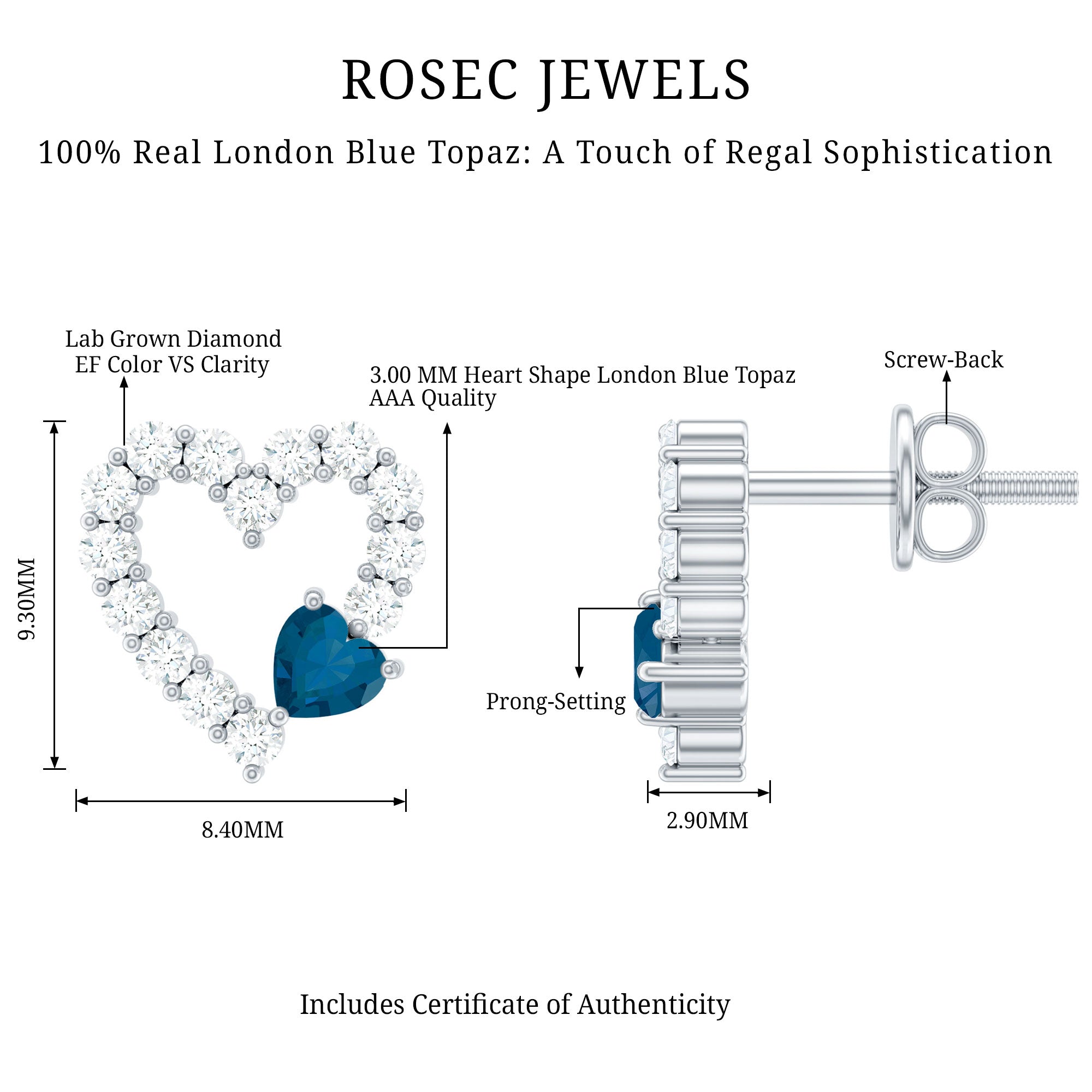 Designed to feel close and personal, these London Blue Topaz Earrings bring together thoughtful details and everyday wearability. Made in 14k white gold plated silver, these delicate Topaz Stud Earrings are styled with a romantic touch. At the center sits a 3 MM heart shaped London Blue Topaz, held securely in prong setting that lets the shape shine through. To make the design even more special, the open heart is gently accented with round lab created diamonds, placed with care to catch the light at every angle. Whether you are heading to work or dressing up for dinner, these Blue Topaz and Diamond Earrings are easy to wear and hard to overlook. They come with screw back closures for a snug and secure fit, so you can wear them all day with comfort and confidence. Crafted with AAA quality London Blue Topaz and EF-VS quality lab grown diamonds, these Heart Earrings blend fine craftsmanship with emotional charm. Add them to your jewelry box and wear them as a symbol of your unique story, simple, elegant, and full of heart.