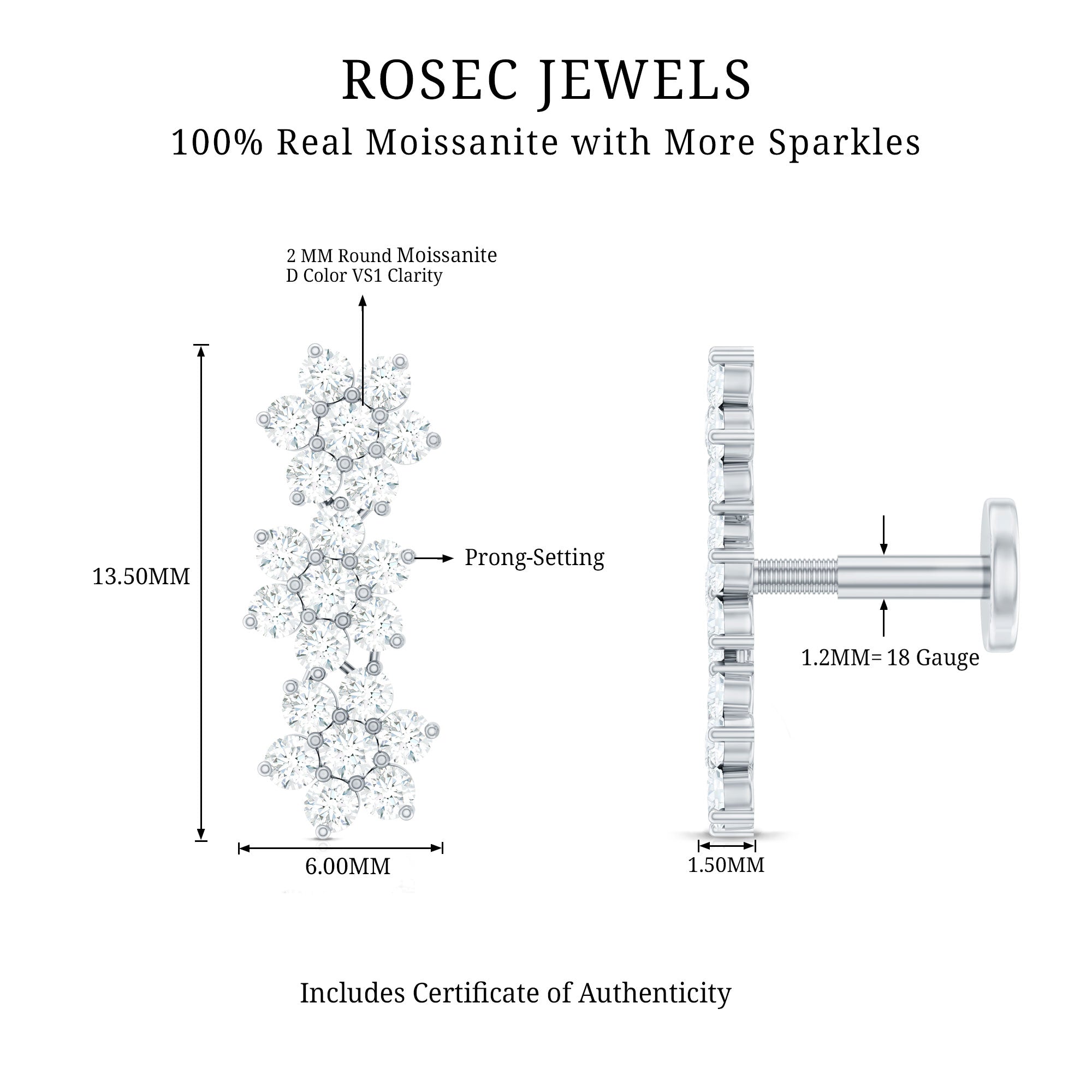 Certified Moissanite Floral Ear Climber Earring ‐ D-VS1 / 18K White Gold / Flat Back 5.5 MM
