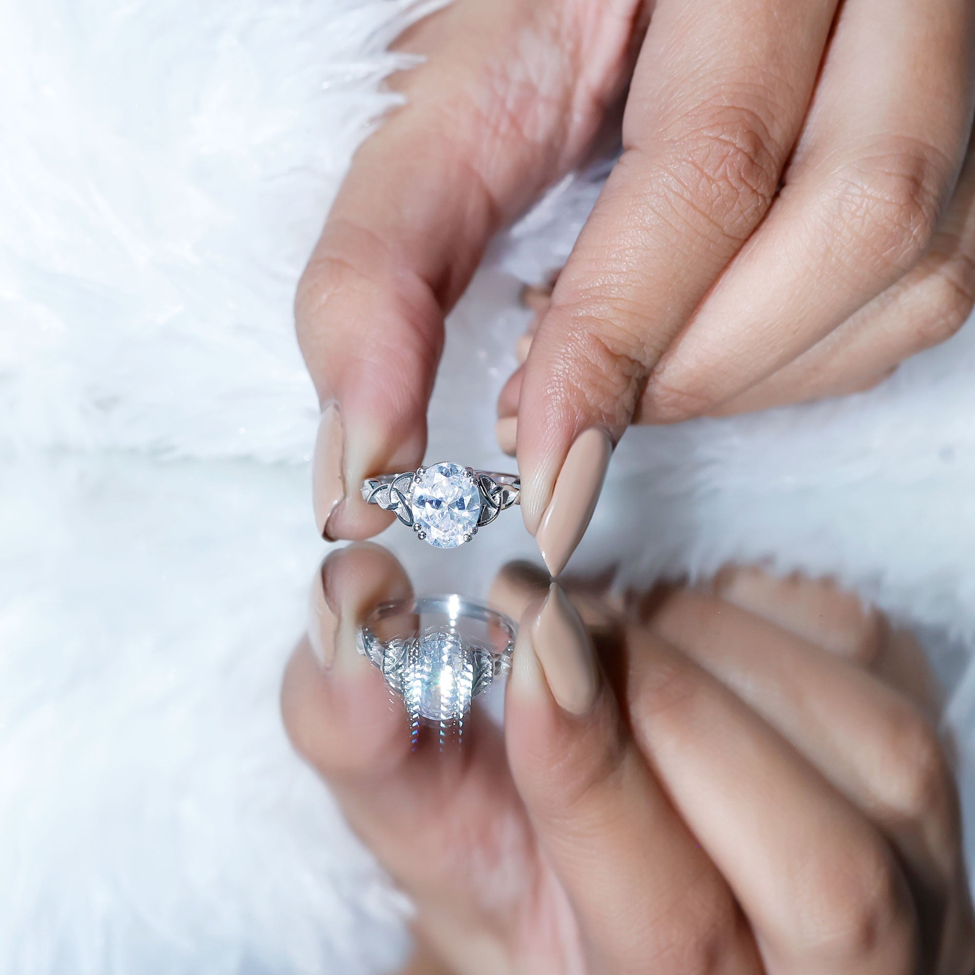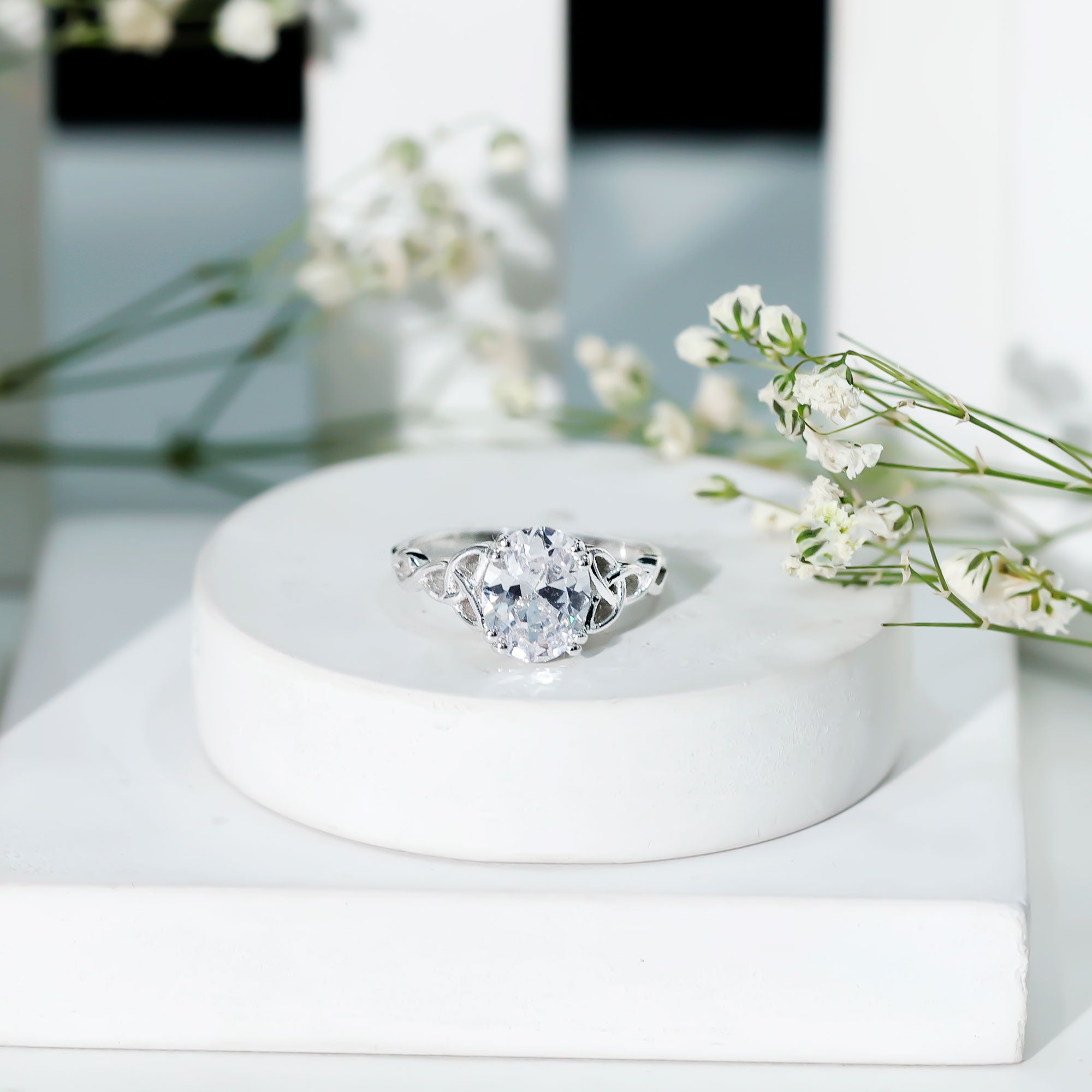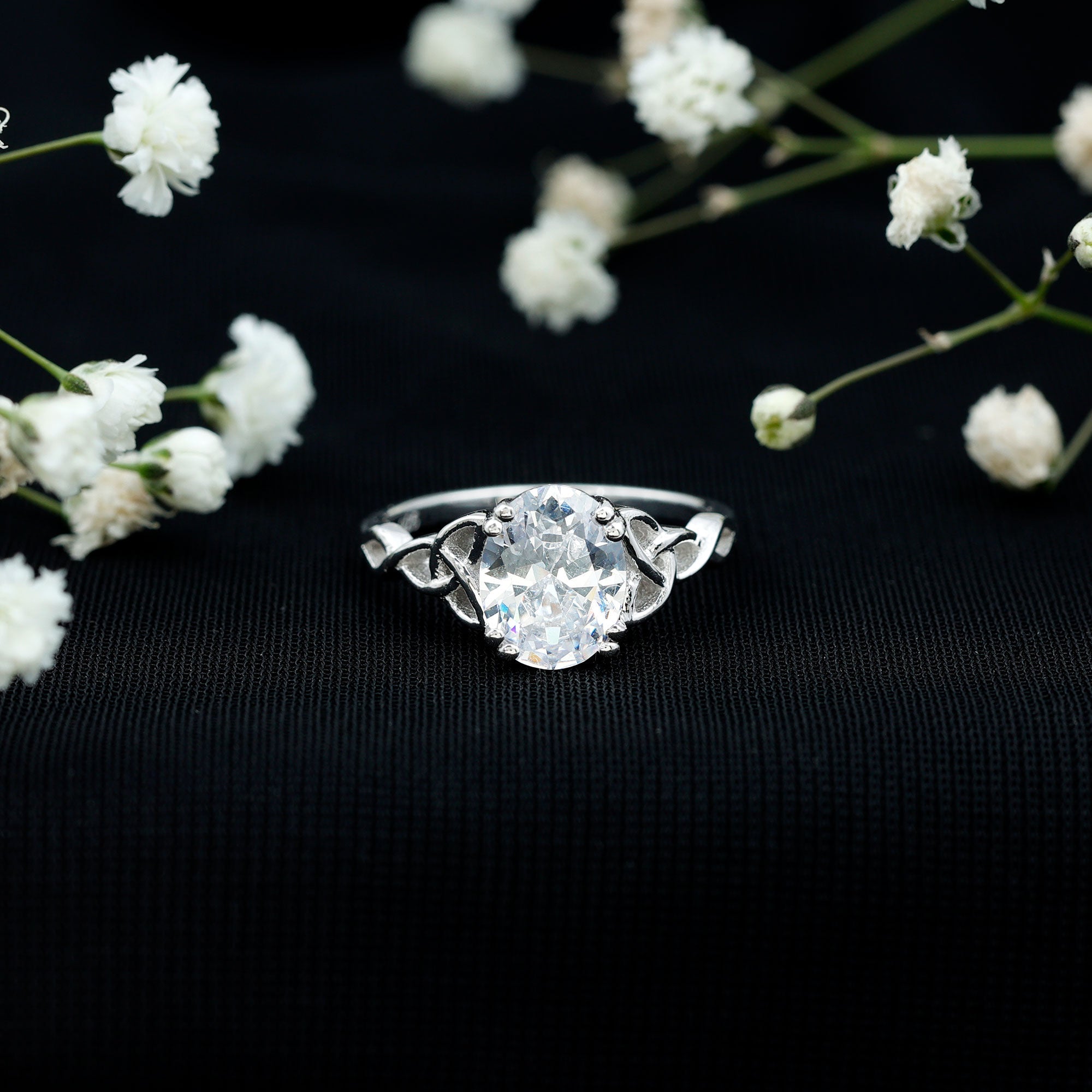 Certified Oval Cut Solitaire Zirconia Celtic Engagement Ring in Silver ‐ AAAAA / 92.5 Sterling Silver / 6.5