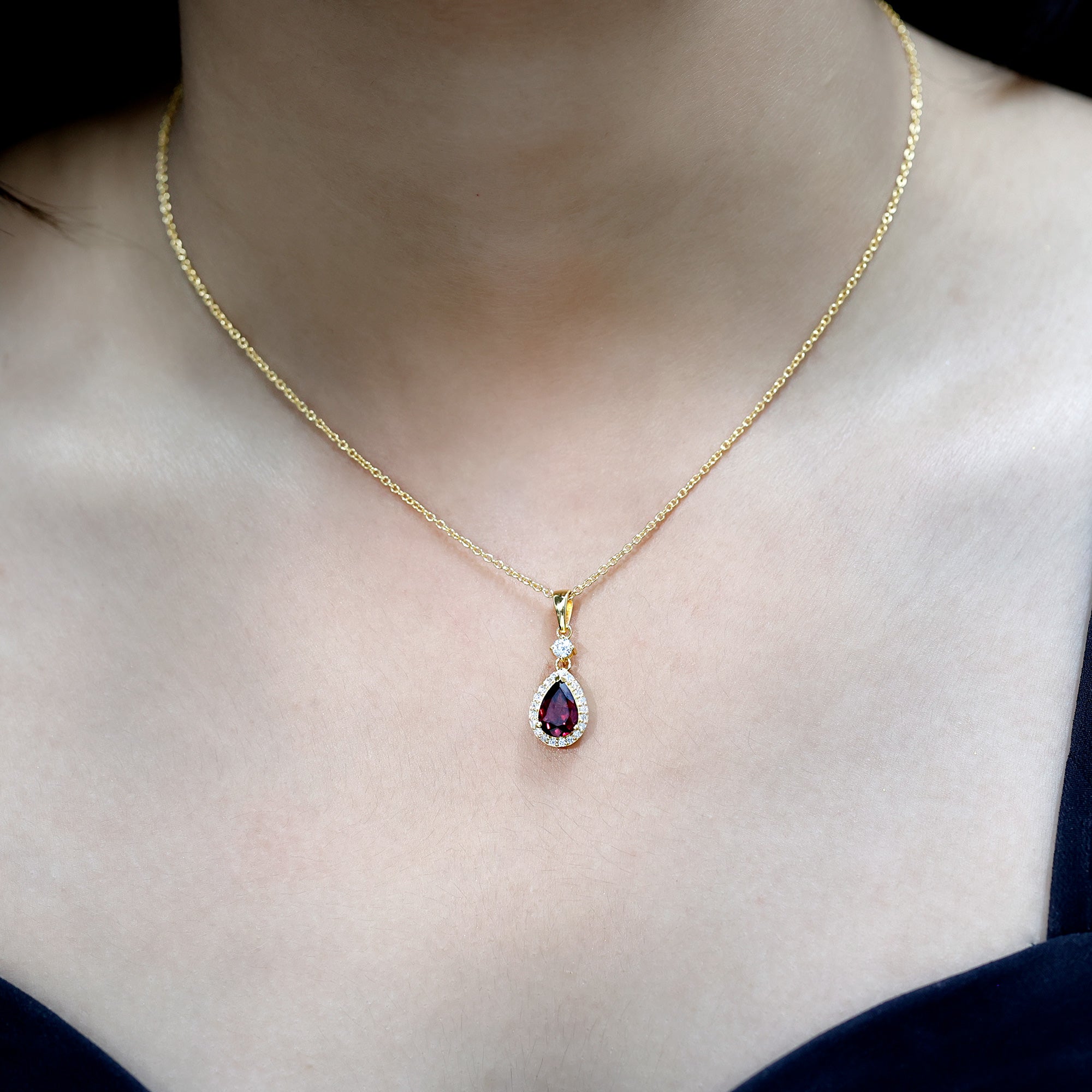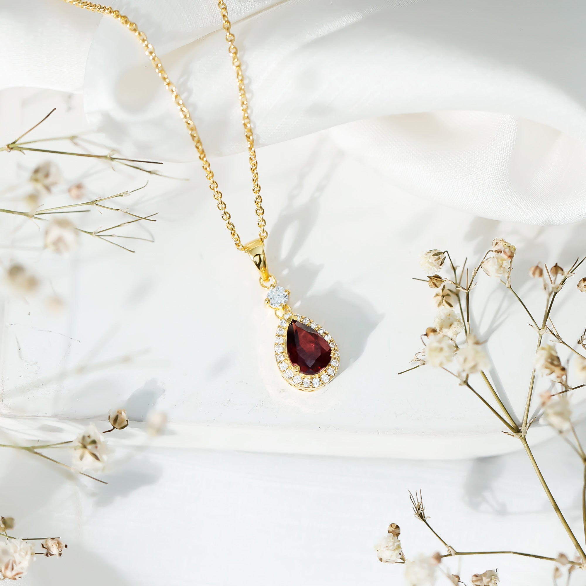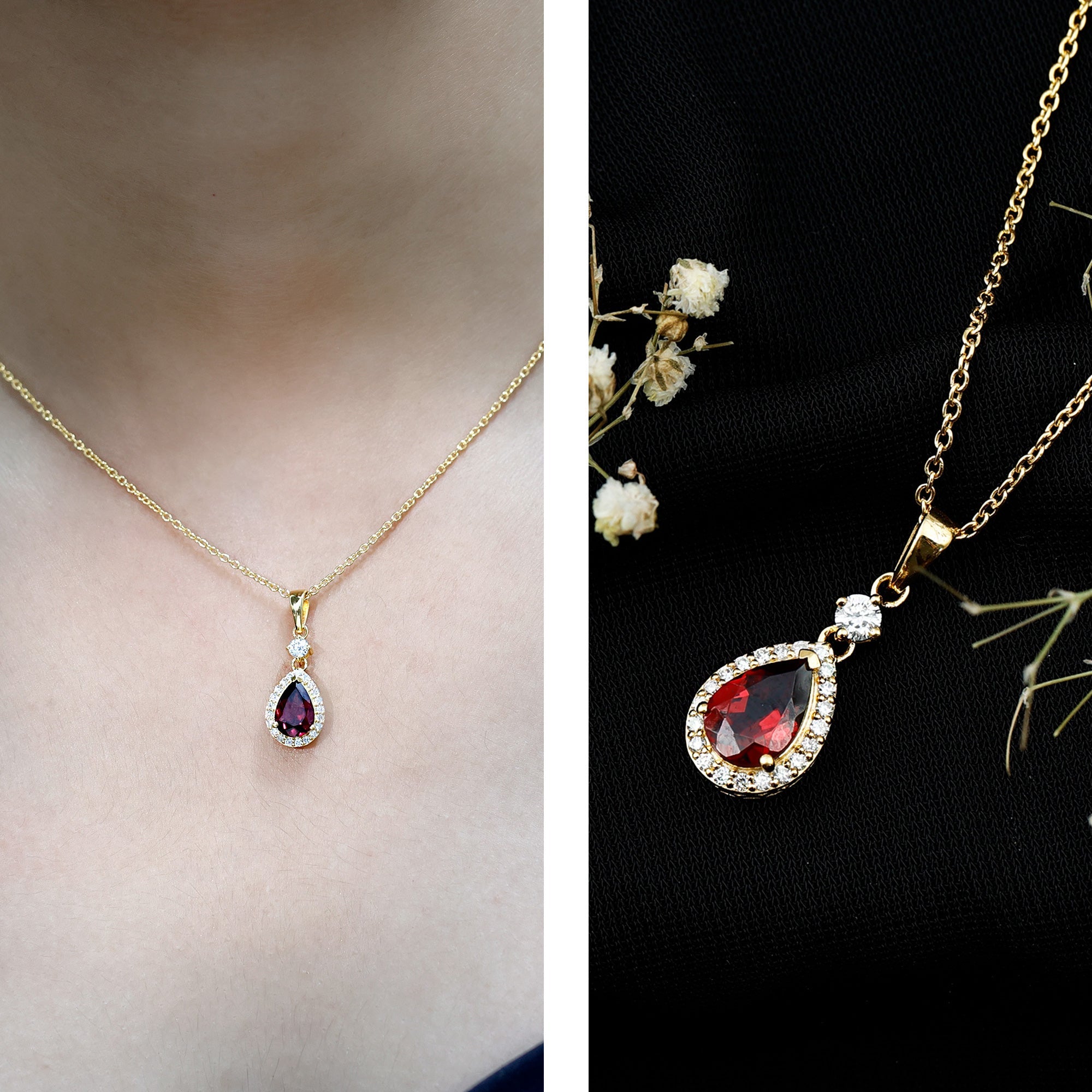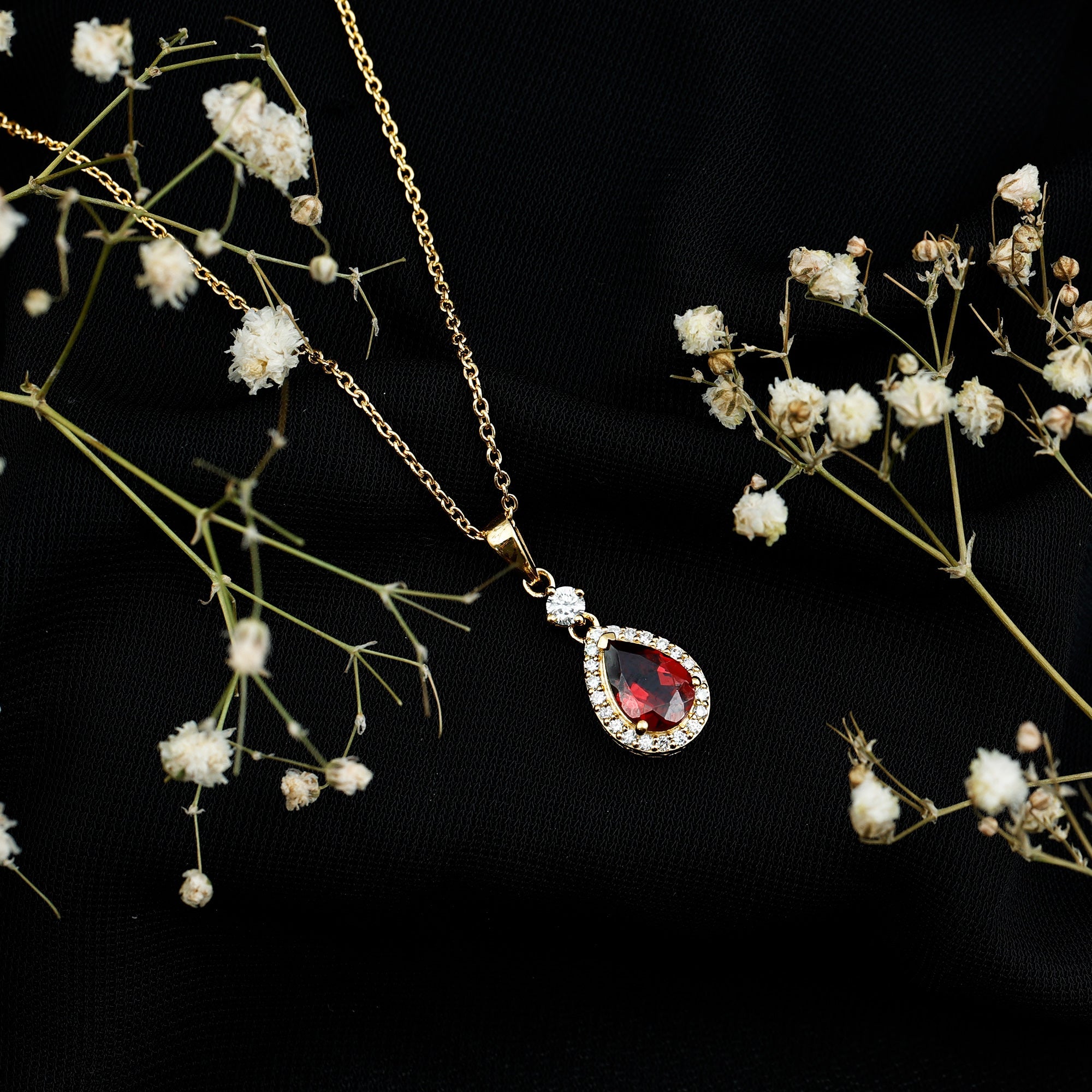 Like a soft drop of love, this Rhodolite Garnet Teardrop Necklace adds romance and beauty to any special moment. Designed with elegance and care, it features a stunning 6X9MM pear shaped rhodolite at the center. Surrounding the center stone is a halo of sparkling lab grown diamonds, adding just the right amount of shine and contrast. These diamonds catch the light beautifully, making the Rhodolite Garnet Necklace sparkle with every move you make. Sitting just above the teardrop is a single round lab grown diamond, giving the pendant an extra elegant touch and connecting it to the chain in a graceful way. The pendant is crafted in 14K yellow gold plated silver, giving it a soft golden glow. It hangs from a delicate cable chain that feels comfortable on the skin and lies beautifully on the neckline, ideal for wedding gowns, party dresses, or even a romantic dinner look. This Wedding Necklace for Bride is a lovely choice for bridal jewelry, wedding day gifts, or anniversary celebrations. Whether it is worn by the bride herself, gifted to a loved one, or saved as a keepsake, it is a timeless piece that will be treasured for years. Packaged in a premium jewelry box and comes with a gemstone certificate, this necklace is ready to gift and full of love. Celebrate your most special moments with jewelry that feels as heartfelt as the occasion.