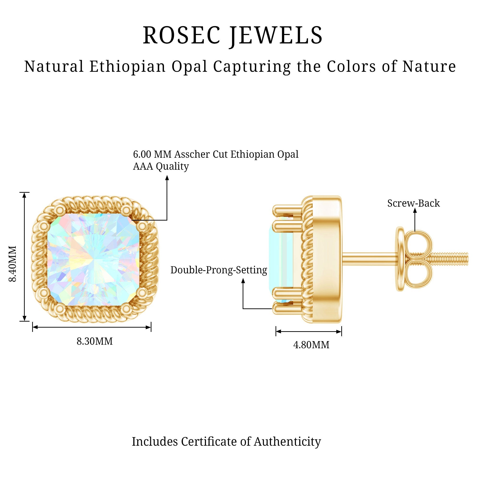 Turn heads with the vibrant beauty of these striking Ethiopian Opal Stud Earrings - a statement of sophistication and bold elegance. Each earring showcases a mesmerizing 6 MM cushion cut Ethiopian opal, totaling an impressive 6 CT (3 Carat Stud each) of ethereal brilliance. Set securely in a safe double-prong setting, the center stones are framed by a distinctive twisted rope border, giving these Solitaire Studs a refined vintage charm with a contemporary edge. The screw back design ensures a snug and comfortable fit, making them perfect for daily wear or special occasions where elegance matters most. Whether you are dressing up for a candlelit dinner or adding a splash of brilliance to a casual outfit, these Real Opal Earrings never miss the mark. Crafted in 14k yellow gold plated silver with attention to detail, the twisted rope frame adds texture and dimension, wrapping the opals like a halo of elegance, enhancing their glow while offering a unique, artisanal look. Feminine yet fierce, these Cushion Cut Earrings are ideal for an October born woman as a Birthstone Stud Earrings or the one who appreciates timeless beauty with a modern twist. These October Birthstone Earrings are conversation starters, symbols of individuality, and radiant tokens of self-expression. Presented in a premium jewelry box, they make a wonderful gift or a cherished addition to your own collection. Celebrate your unique glow with every flicker of light.