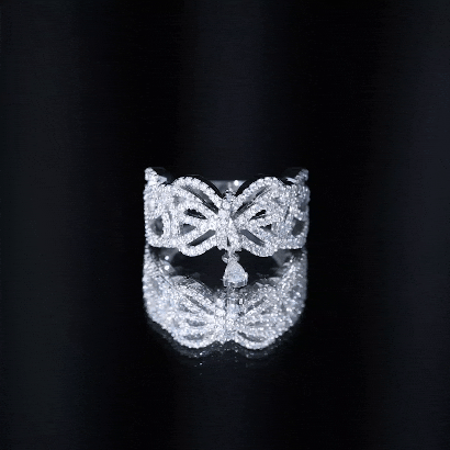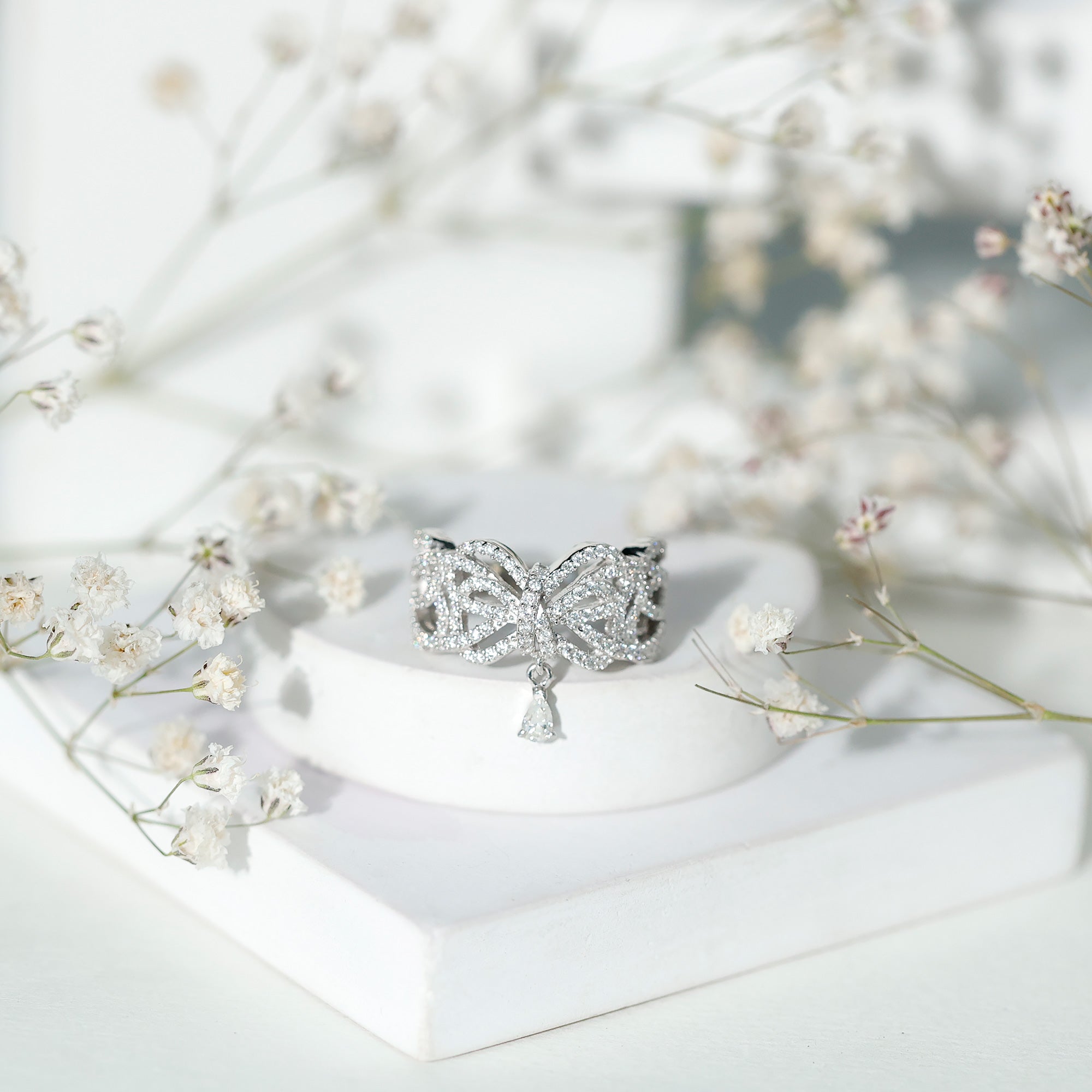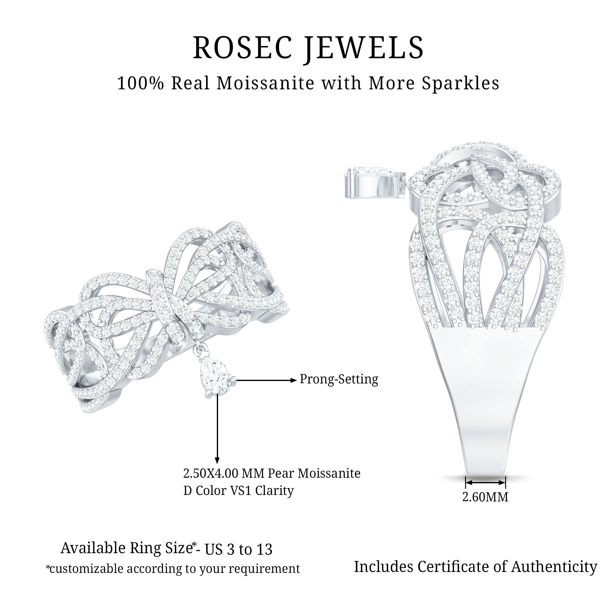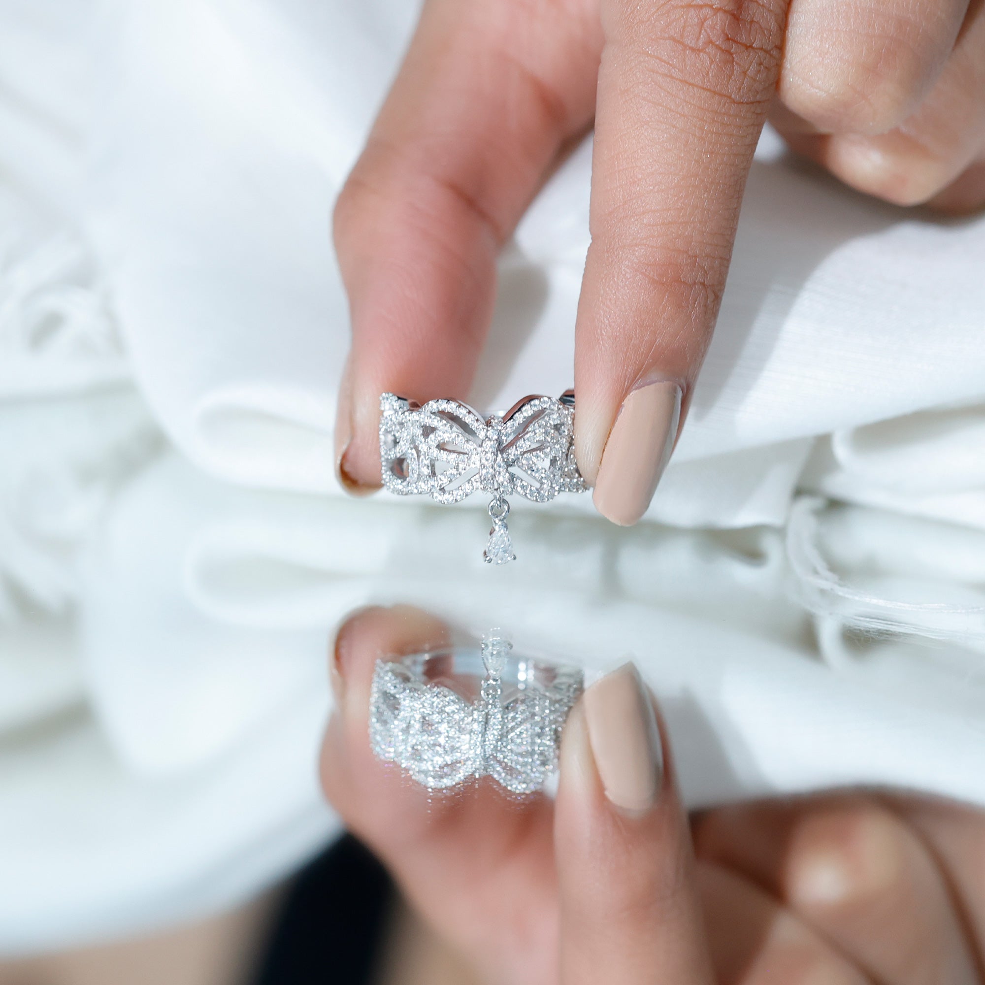 Looking for something that surprises your lady, here weve got your back with the Moissanite Ring, crafted with 14K White Gold Plated Silver. This Non Traditional Engagement Ring features a bow motif, which is studded with Moissanite and holds dangling pear shape Moissanite secured in Prong Setting. This Designer Engagement Ring represents Love, Commitment, and Devotion, which makes it a perfect choice to experience love. The ring shines with the adorable shine of D-VS1 Quality Moissanite studded in the ring. Present this big ring to your special one and experience a priceless moment with her.