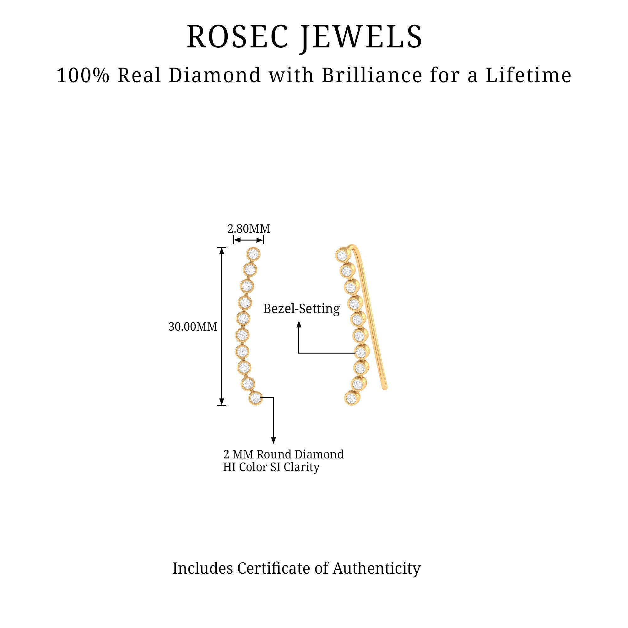 - This earring features a row of bezel set diamonds in the same size as the style gently curves up the ear. This earring is secure with a comfy long wire back that stabilizes the climbing design.