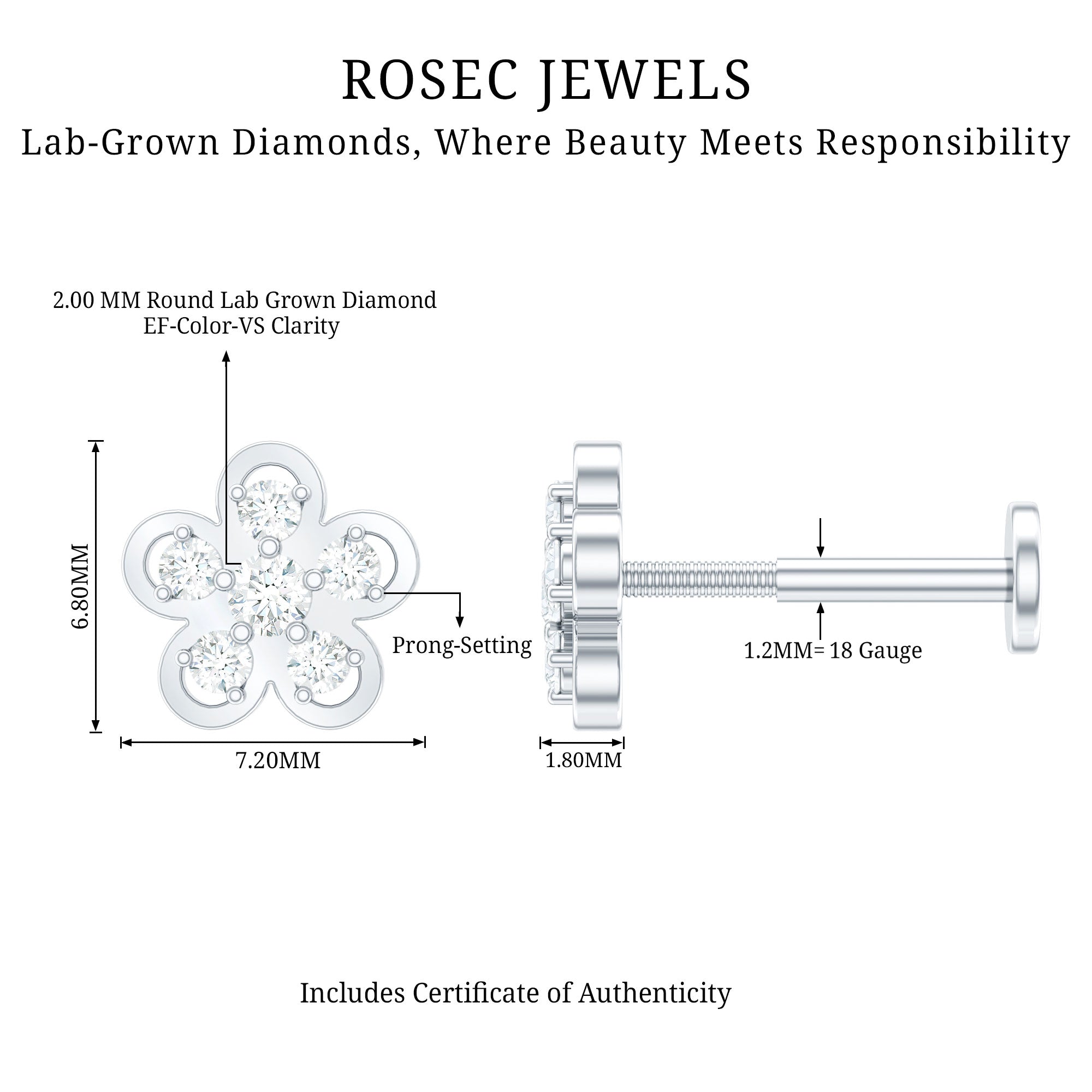 Diamond Floral Helix Earring for Women ‐ Lab - ( EF-VS ) / 18K White Gold / Flat Back 5.5 MM