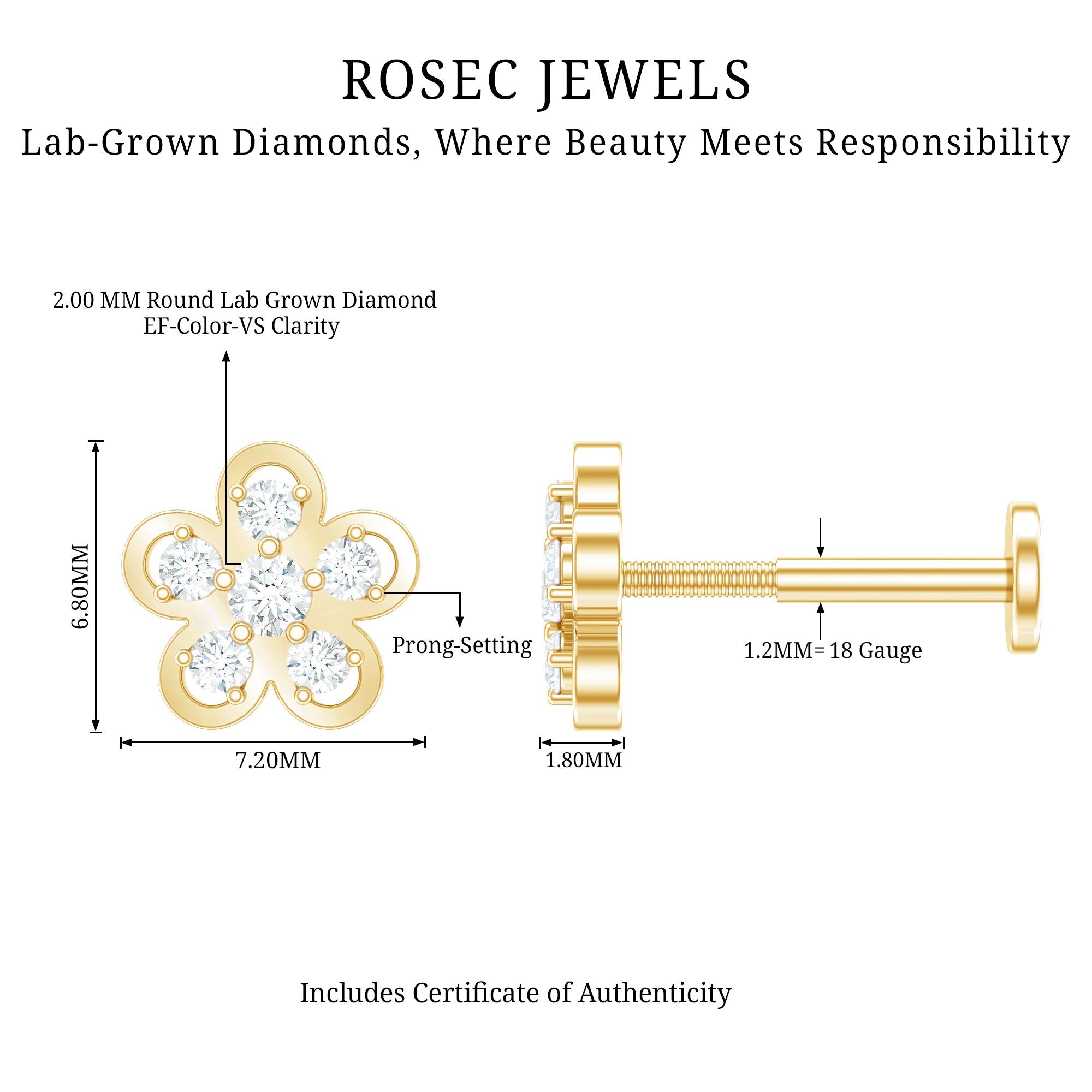 Diamond Floral Helix Earring for Women ‐ Lab - ( EF-VS ) / 18K Yellow Gold / Flat Back 5.5 MM