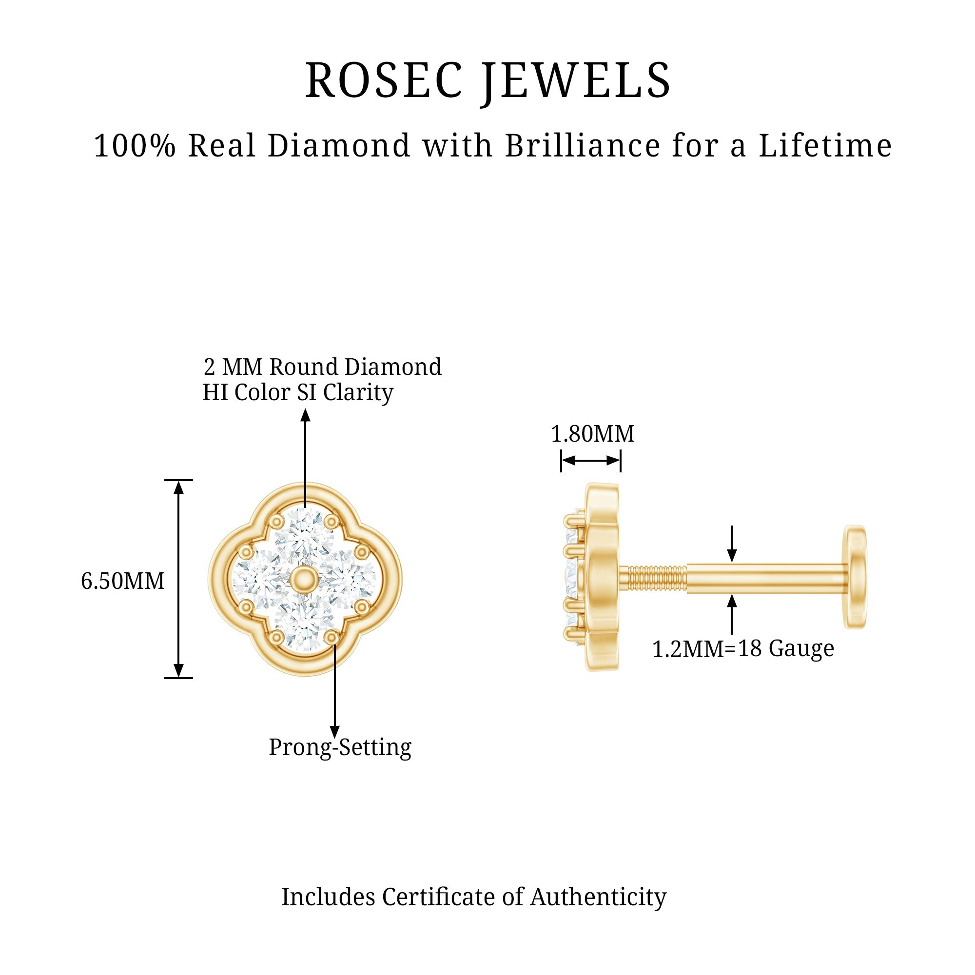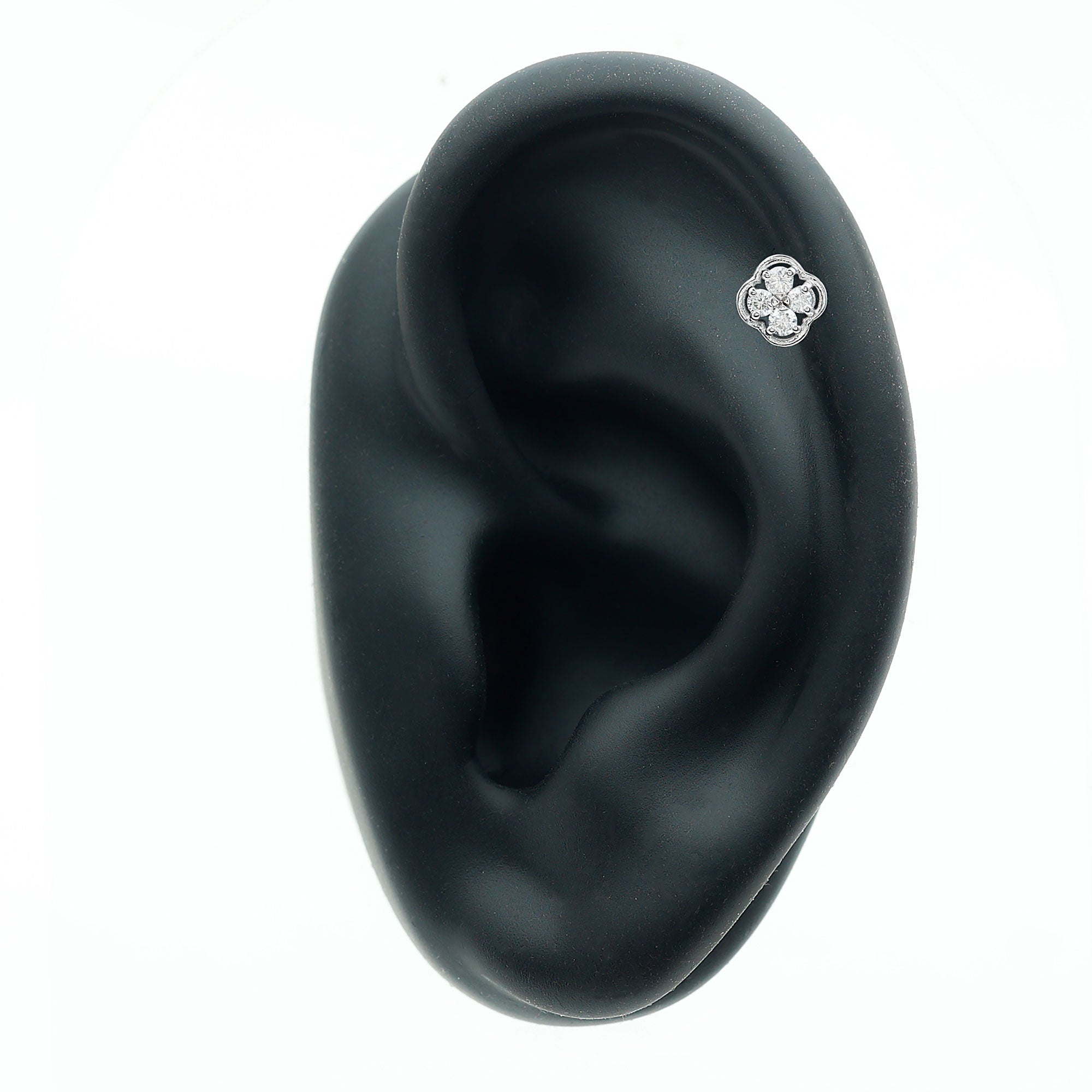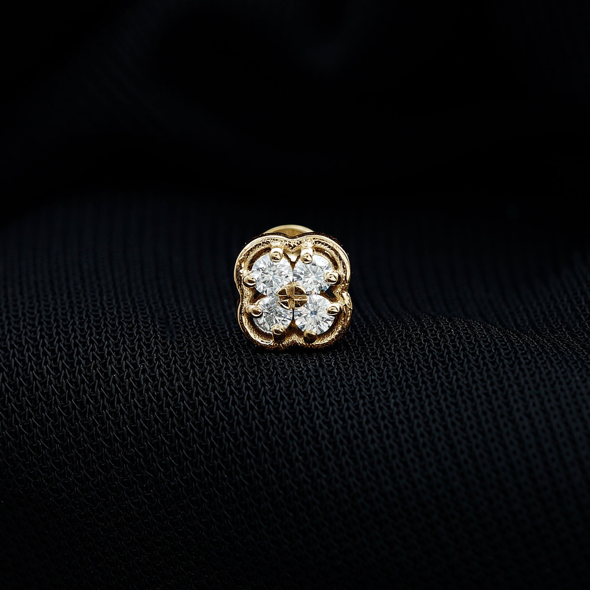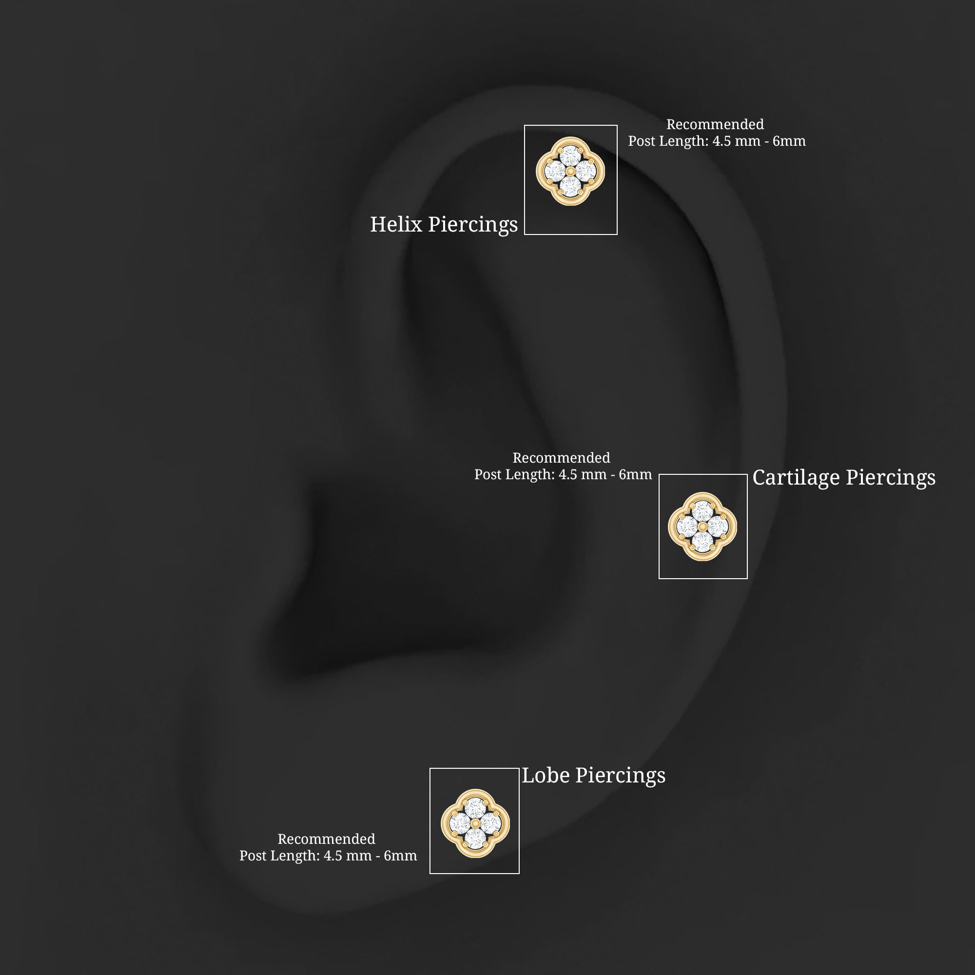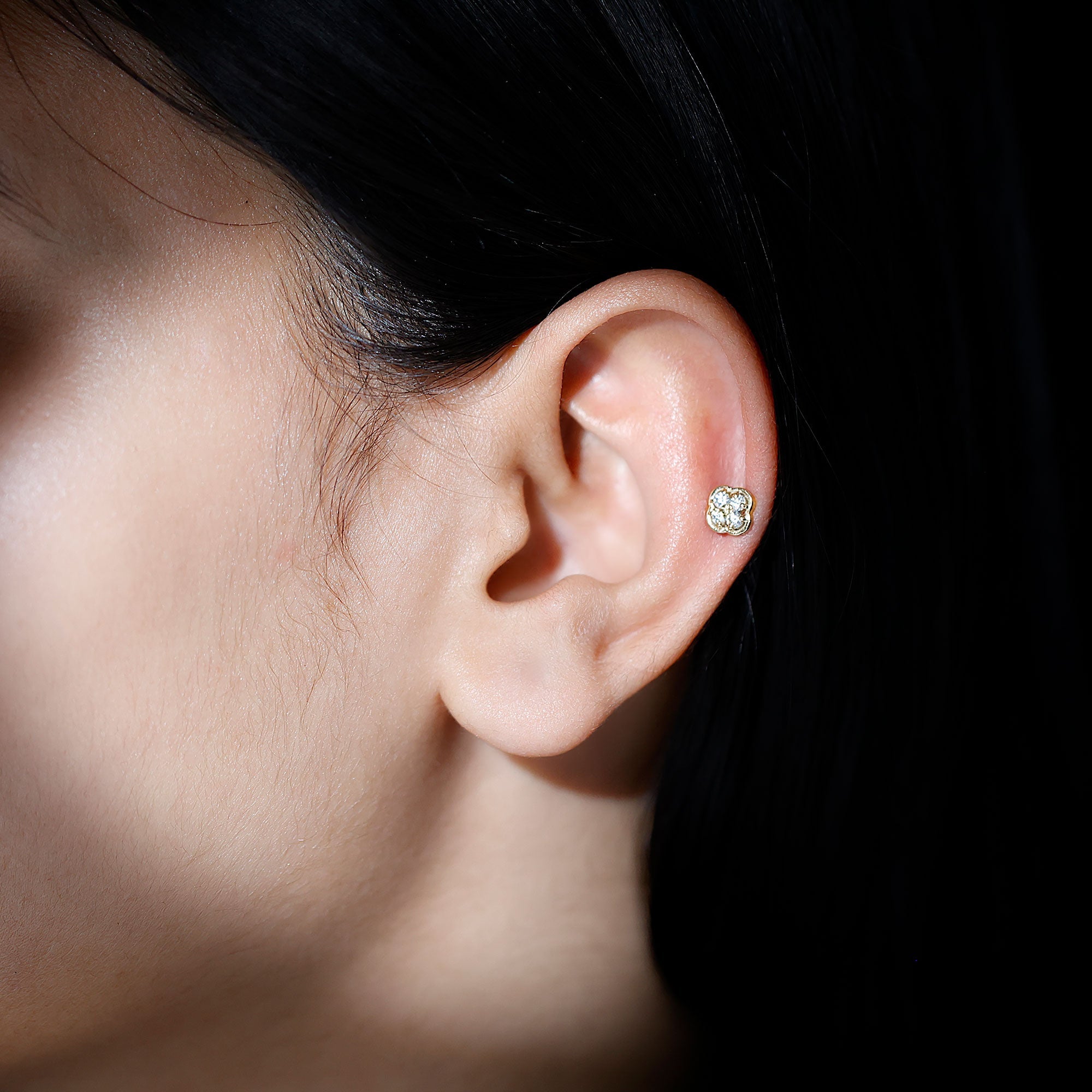 Let your cartilage piercing step out of the shadows and blossom into a star! Enhance your look with our Diamond Floral Earring, which radiates the perfect sparkle. This earring features a cluster of four Round Diamonds set in prongs and surrounded by a floral design frame made of solid metal, ensuring durability. You can elevate your earring stack by adding this Flower Stud Earring to your helix, cartilage, conch, tragus, or upper lobe piercing. With so many possibilities, this Flower Cartilage Stud is sure to be the highlight of your body jewelry collection. Treat your special someone to this Diamond Cartilage Earring for any occasion, be it a birthday, graduation, anniversary, or just because. Whether worn alone as a standout piece or combined with other earrings for a curated ear look, it effortlessly adapts to both minimalistic and bold styles. A true tribute to natures beauty, enhanced by the everlasting sparkle of diamonds.