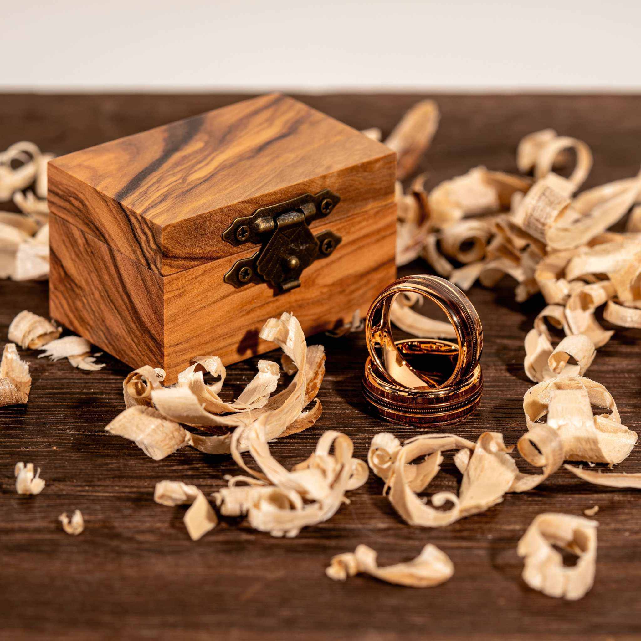Guitar String Whiskey Barrel Wood Ring - Rose Gold Band Tungsten