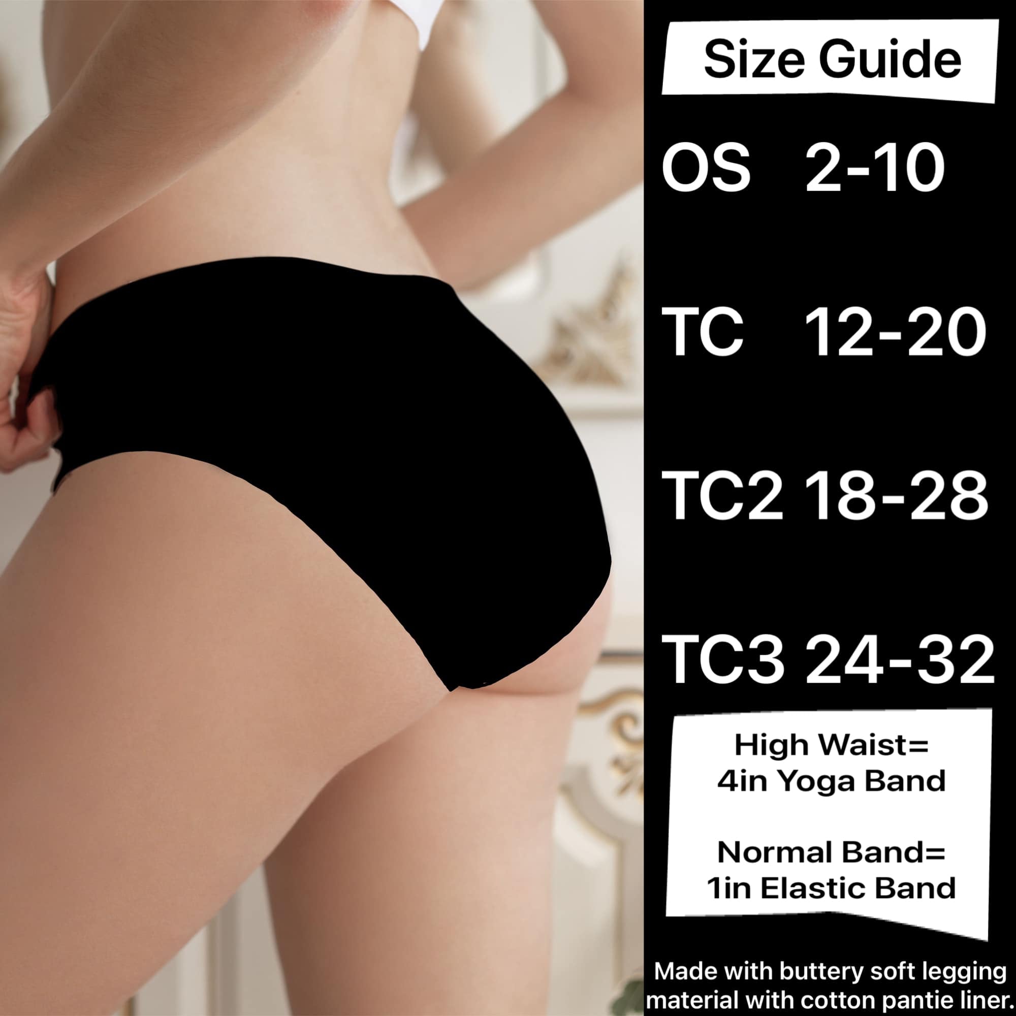 Panties are available in sizes OS, TC, TC2, and TC3. They are made with buttery soft legging material and have a cotton panties liner.