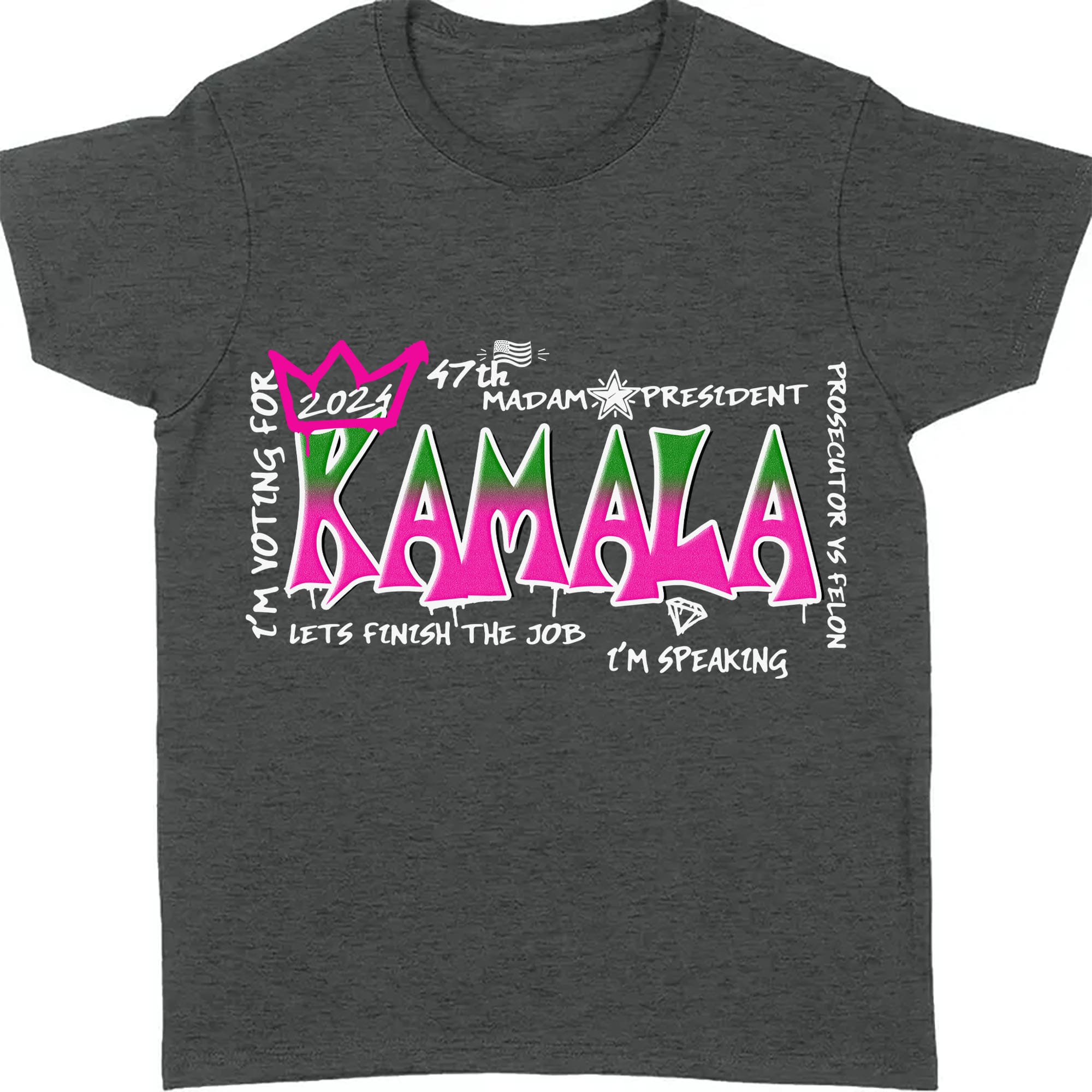 This t-shirt features the name "Kamala" boldly displayed in a vibrant graffiti style, making a powerful statement of support for Kamala Harris in her campaign to become the 47th President of the United States. The edgy, urban design captures attention and expresses a sense of energy and enthusiasm for her leadership.