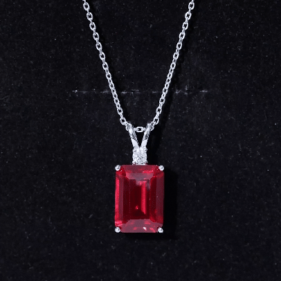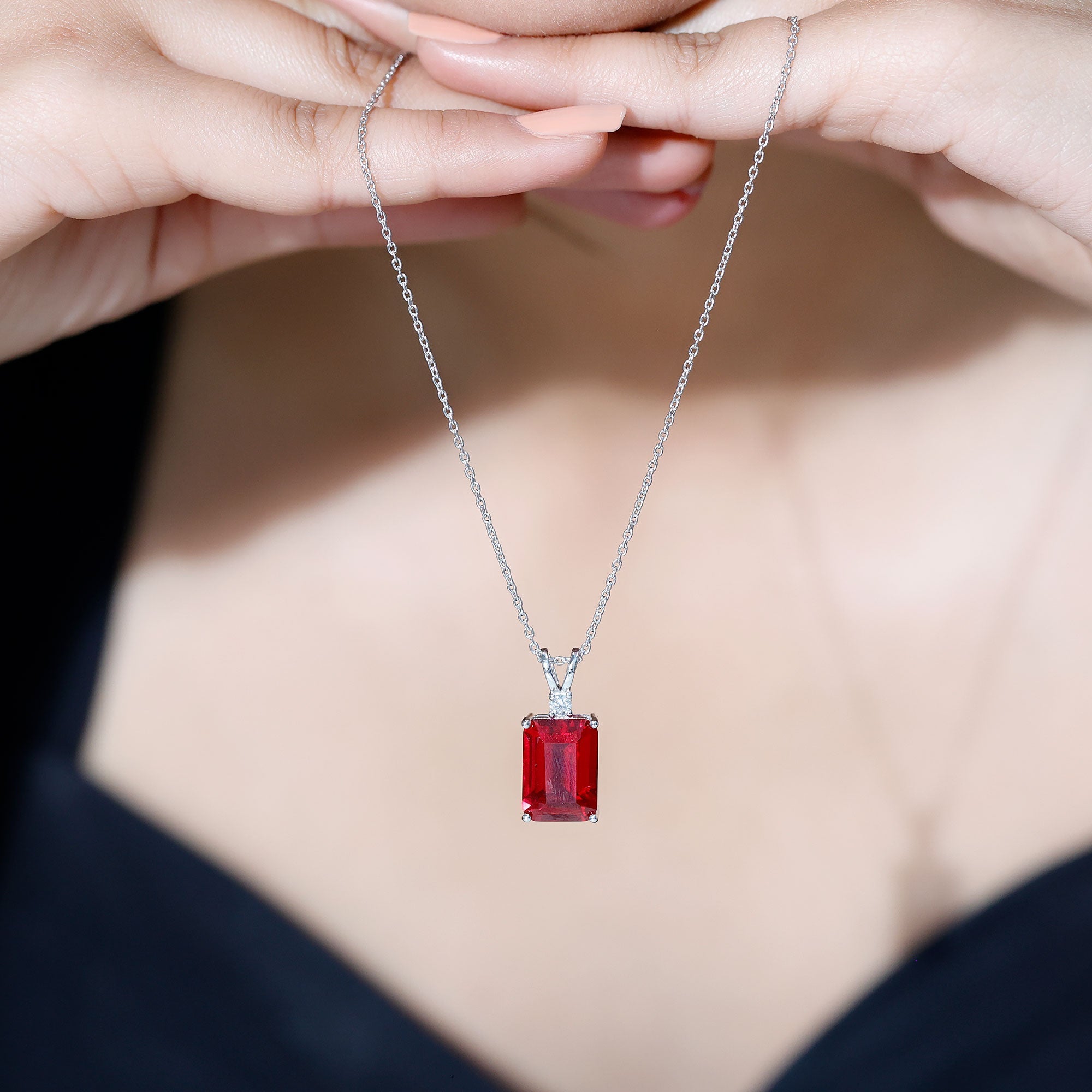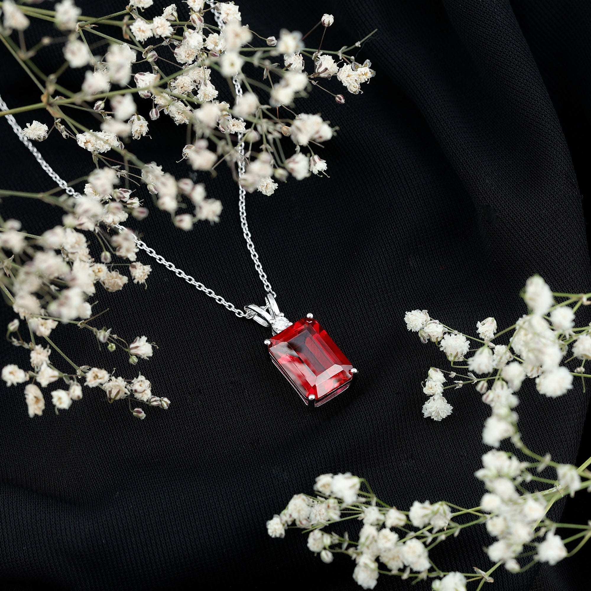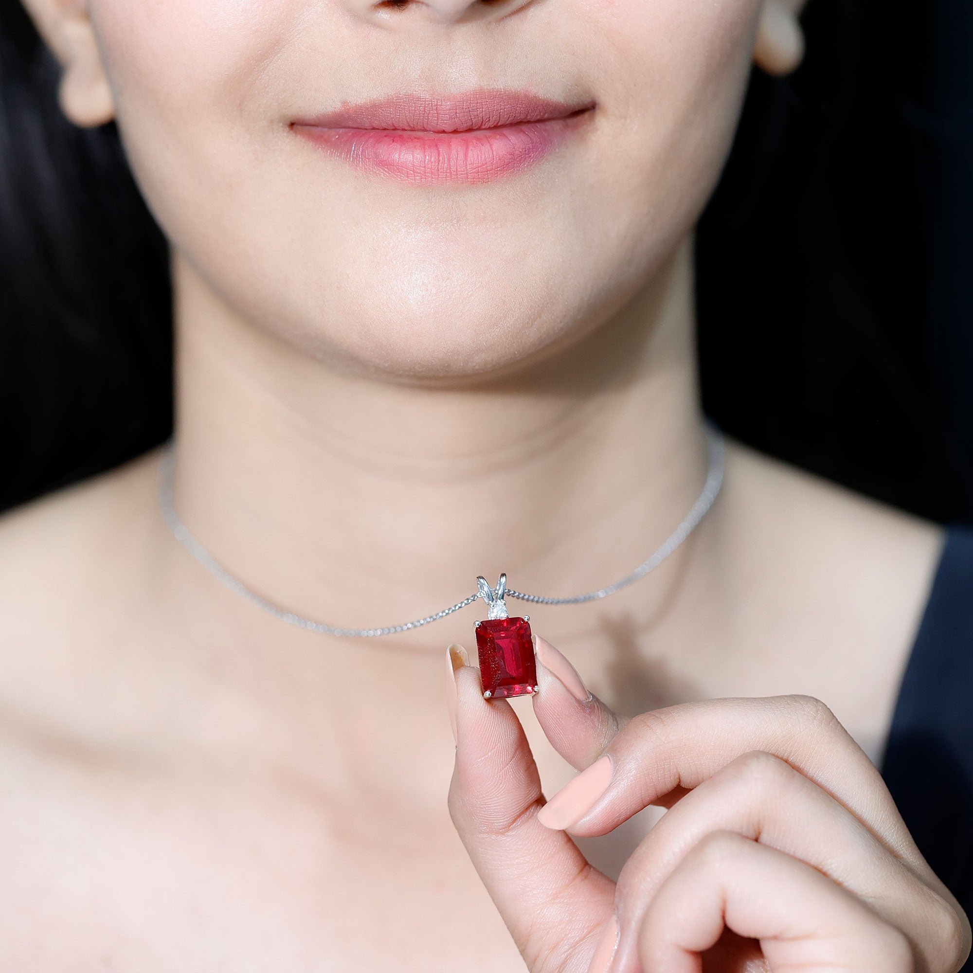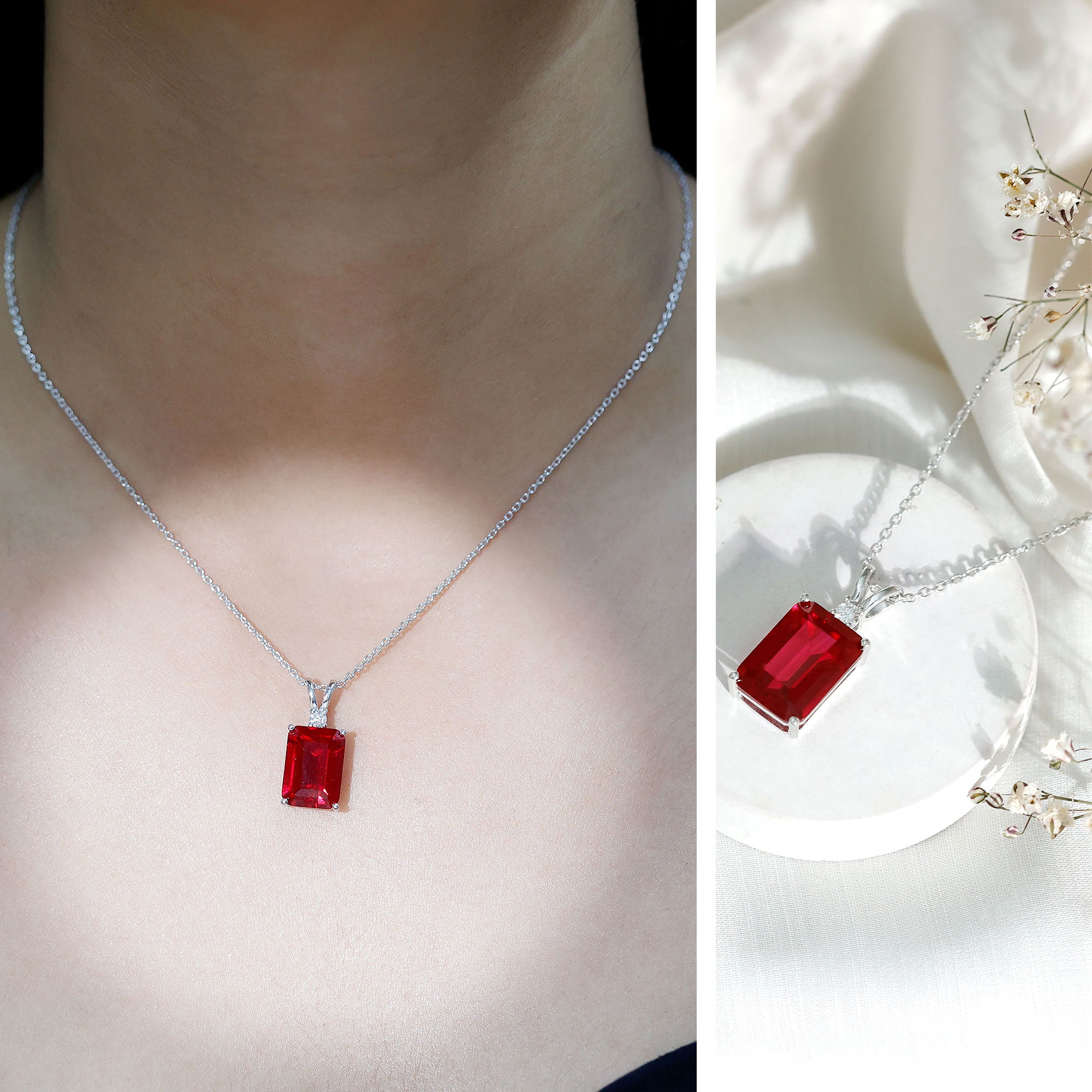 This Lab Grown Ruby Necklace is a stylish and adaptable choice for any occasion. Featuring a breathtaking emerald-cut ruby gemstone (10X14 MM Lab Created) securely set in 4 prongs, along with a delicate round cut moissanite at the top, it radiates elegance. The vibrant red hue represents passion and love, making it a meaningful selection for anyone. With a total carat weight of 5 CT, this Solitaire Ruby Necklace dazzles with its bold sparkle. Made from high-quality 14k white gold plated sterling silver, it combines durability with timeless beauty. The sterling silver setting provides a stunning contrast to the red created ruby, ensuring lasting quality. The Emerald Cut Pendant comes with a matching cable chain, creating a complete and ready-to-wear piece. Crafted from the same premium sterling silver, the chain adds to the necklace cohesive and stylish appearance. Our dedication to excellence guarantees that you receive a carefully crafted product that adheres to the highest design and quality standards. Elegant, large, and unforgettable - this Silver Statement Necklace is perfect for those who want to shine uniquely on their special day.