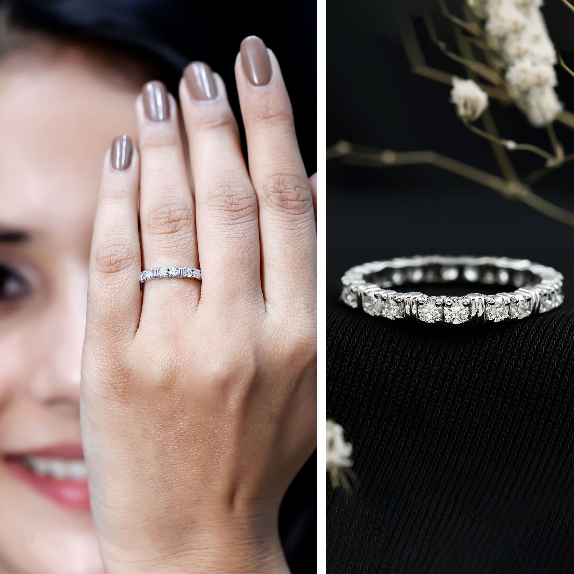 Wrap your finger in some shimmer and let this Diamond Wedding Ring be the sparkle that complements your glow. Crafted with round shaped lab-grown diamonds set in prong setting, this Stackable Ring creates an endless pattern of sparkle that represents eternal love and commitment. Handcrafted using lab made gemstones, this Diamond Anniversary Ring is a sustainable and ethical choice that does not skimp on brilliance or quality. Rosec Jewels offers a variety of metal colors and purity options to select from. This Full Eternity Ring shines with EF-VS Quality Lab Grown Diamonds, providing an affordable alternative that cuts costs compared to natural diamonds. With its timeless and eye catching design, this Lab Created Diamond Eternity Ring is perfect for a wedding ring or an anniversary band, marking the beginning of a new chapter. This Wedding Anniversary Band blends elegance with modern style, making it perfect for those looking for a touch of luxury.