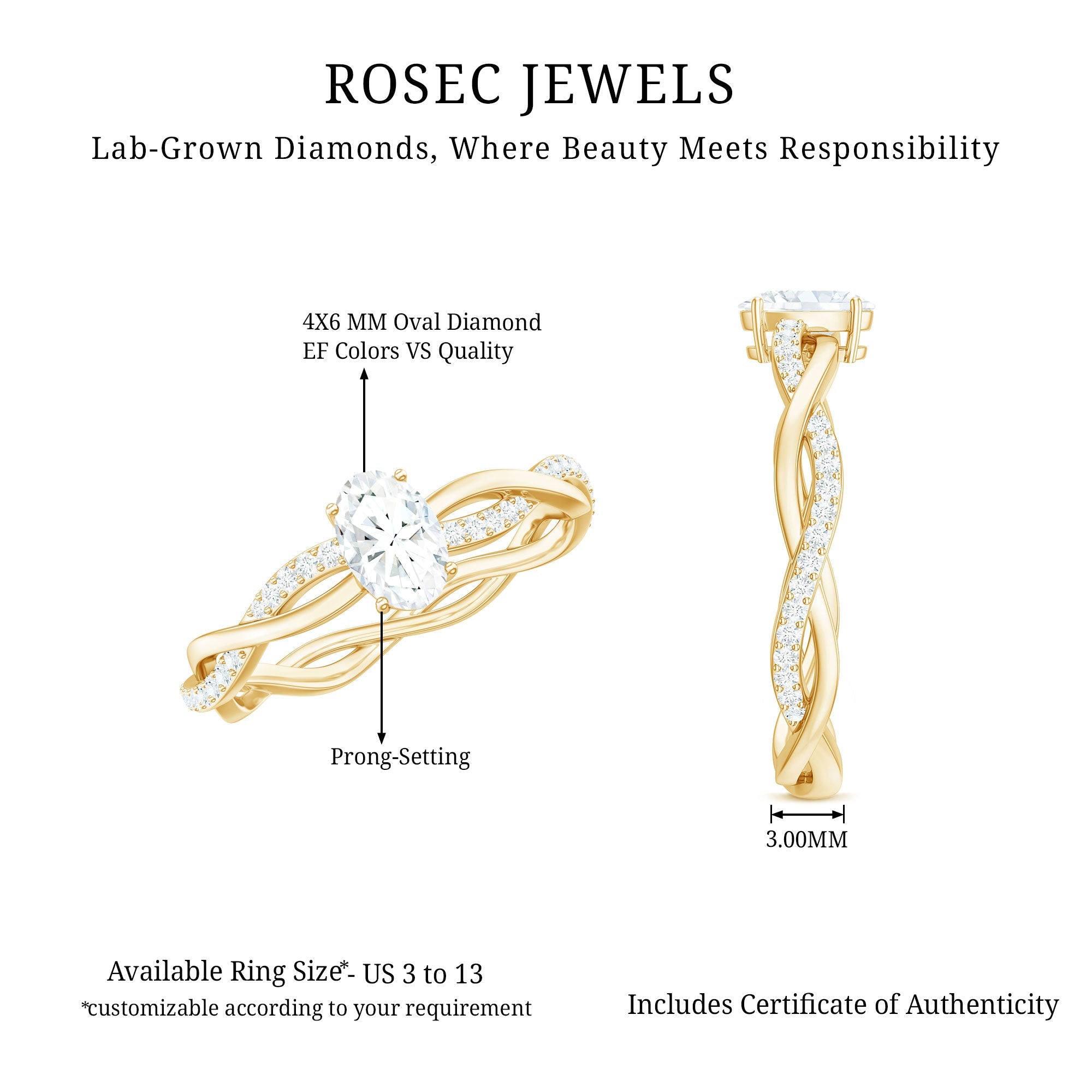 Step into a realm of elegance and timeless beauty with our Lab Created Diamond Promise Ring for Her, a stunning piece crafted to make your forever moment truly memorable. At the center of this gorgeous Solitaire Engagement Ring is a 4X6 MM Oval Shaped Lab Grown Diamond set in Prong Setting. With its EF color and VS clarity, the brilliance is as genuine as your love story. The Braided Band, adorned with delicate stones, represents the lovely intertwining of two lives, two hearts, and one shared future. Designed to win hearts, this Braided Ring perfectly combines classic charm with modern flair. Presented in a luxurious jewelry box, it is ready for a picture-perfect proposal or an unforgettable surprise. Available in US ring sizes from 3 to 13, it guarantees a perfect fit for every bride-to-be. This Half Carat Diamond Ring is a promise, made ethically and intended for those who believe in forever. Embrace love, style, and a future as bright as this Pre Engagement Ring. Because some moments deserve an short of being extraordinary.