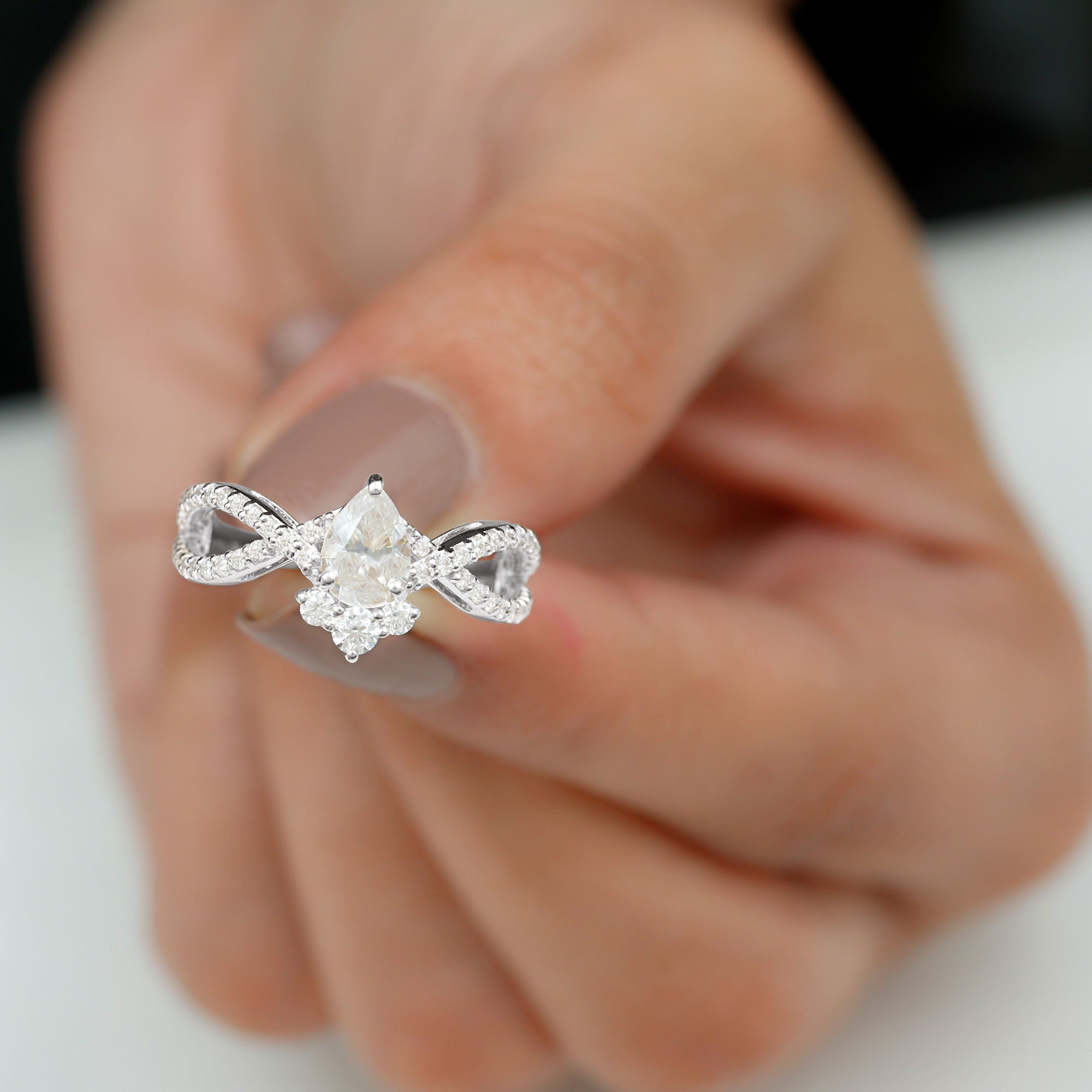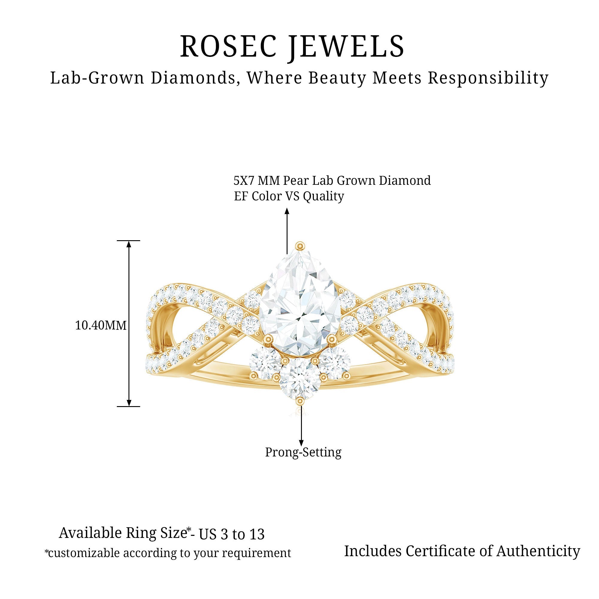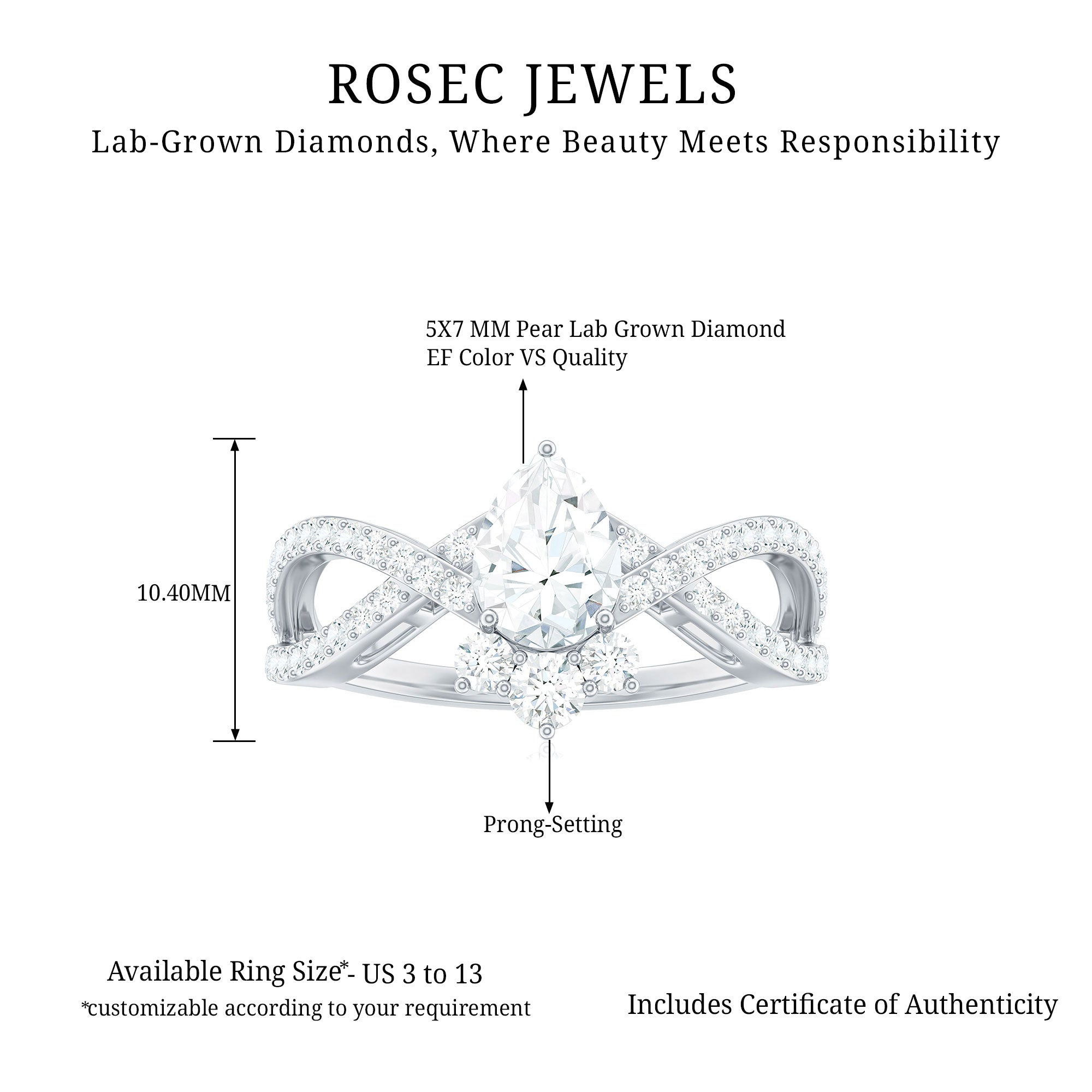 Make your proposal an epic effect with this Lab Grown Diamond Ring which is a mesmerizing symbol of love and devotion that beautifully intertwines elegance and innovation. This breathtaking ring features 5X7 MM Pear Shaped Lab Grown Diamond in Prong Setting, that sits in the center elegantly. With a sparkling classic and bold statements, this Diamond Engagement Ring has an enchanting crossover design that embodies seamless connection and unity between two souls. The band is adorned with sparkling Diamond Accents that enhance the overall brilliance, ensuring that the Pear Shaped Diamond Ring captures the light from every angle.