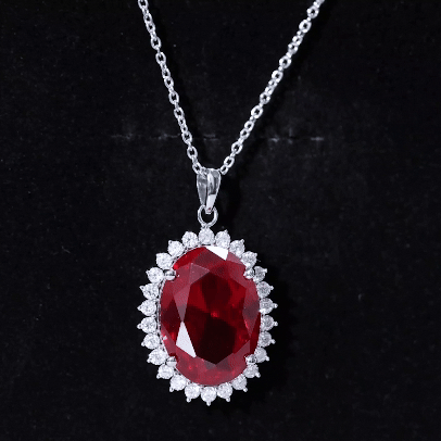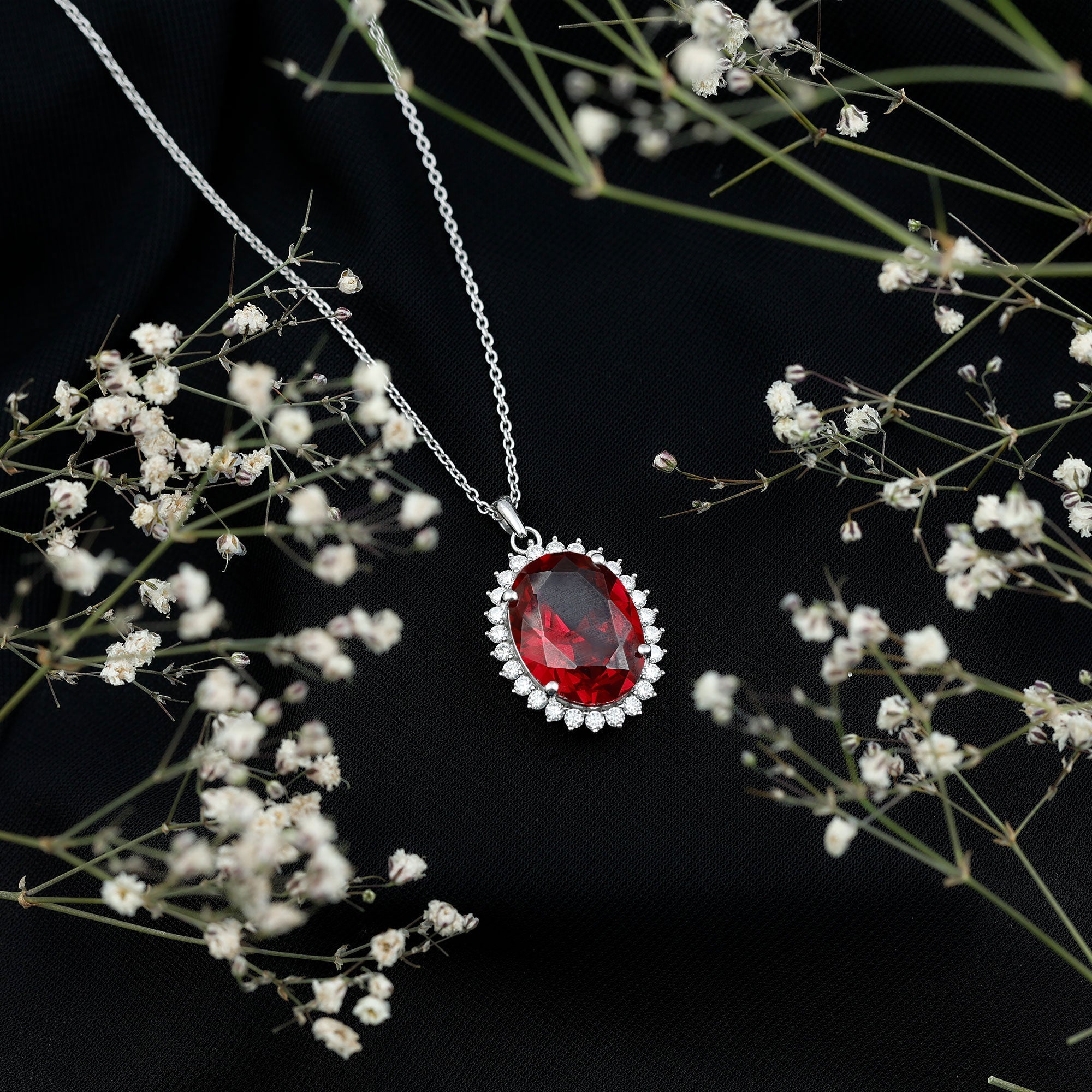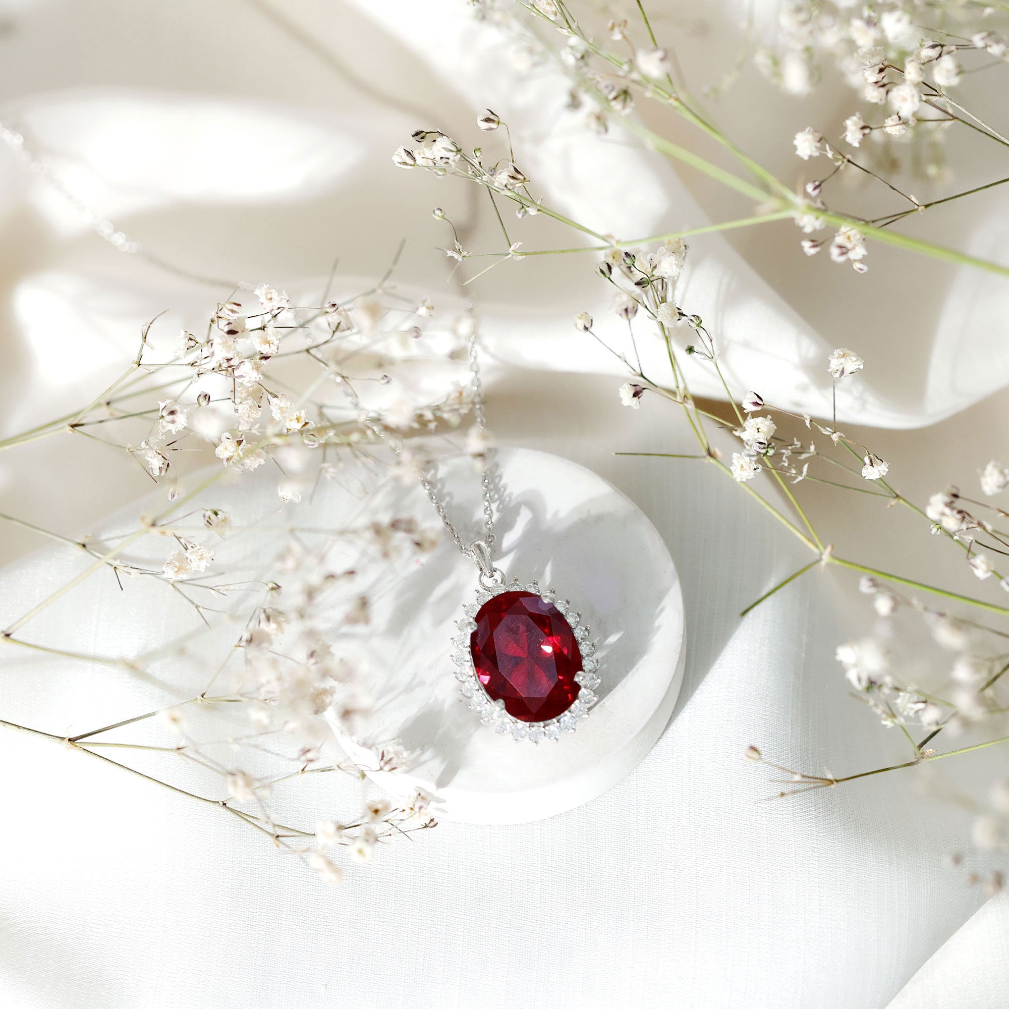 Enhance your special day outfit with this stunning Ruby Halo Necklace, expertly made from 14K White Gold Plated Silver. The focal point is a large 13X18 MM Oval Cut Lab Created Ruby, gracefully held in Prong Setting and encircled by a sparkling array of smaller Moissanite stones. This halo design amplifies the brilliance of the central gem, making it look even more impressive. Discover the timeless charm and extraordinary elegance of our Oval Halo Necklace, carefully crafted to celebrate life’s most treasured moments. This exceptional Vintage Ruby Necklace shines with brilliance and top-notch craftsmanship, designed with you in mind. Every detail embodies a tribute to your unique journey, capturing the essence of the moments that mark your special day. Your Wedding Necklace for Bride will be delivered in a signature jewelry pouch, along with a certificate of authenticity.