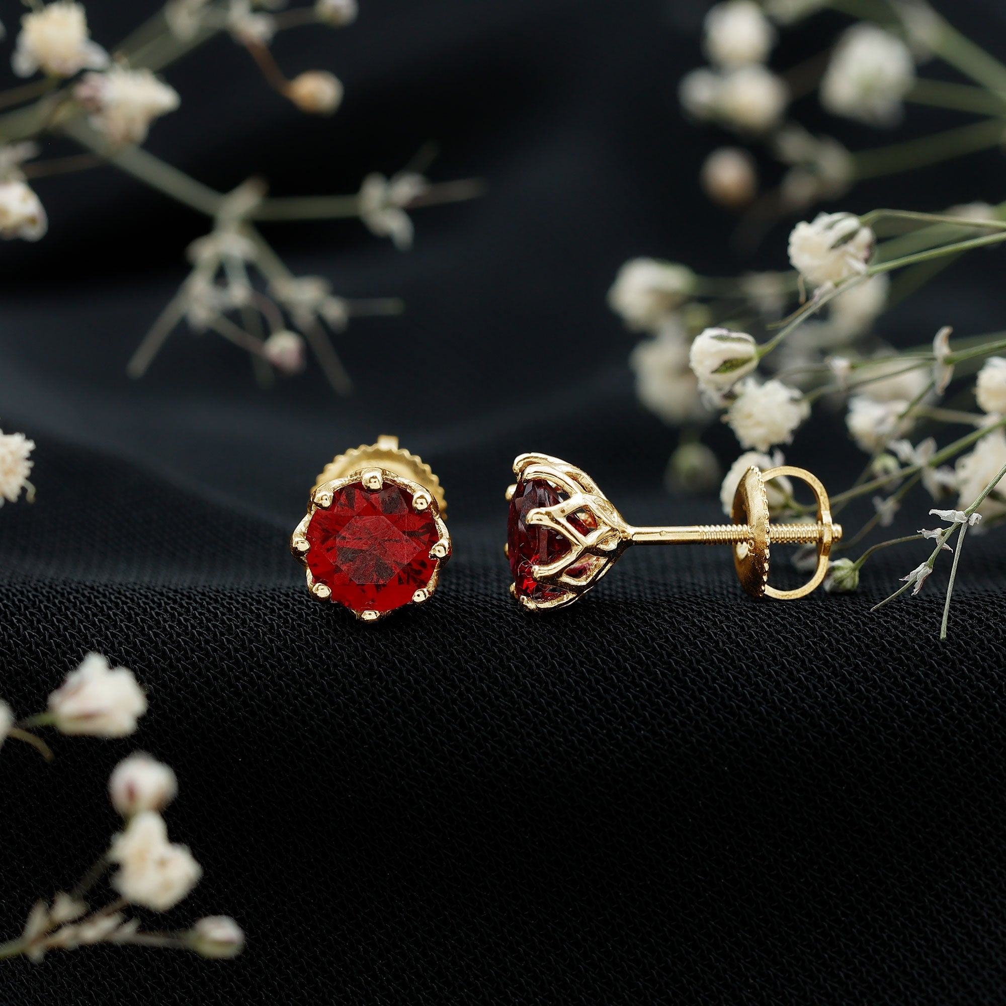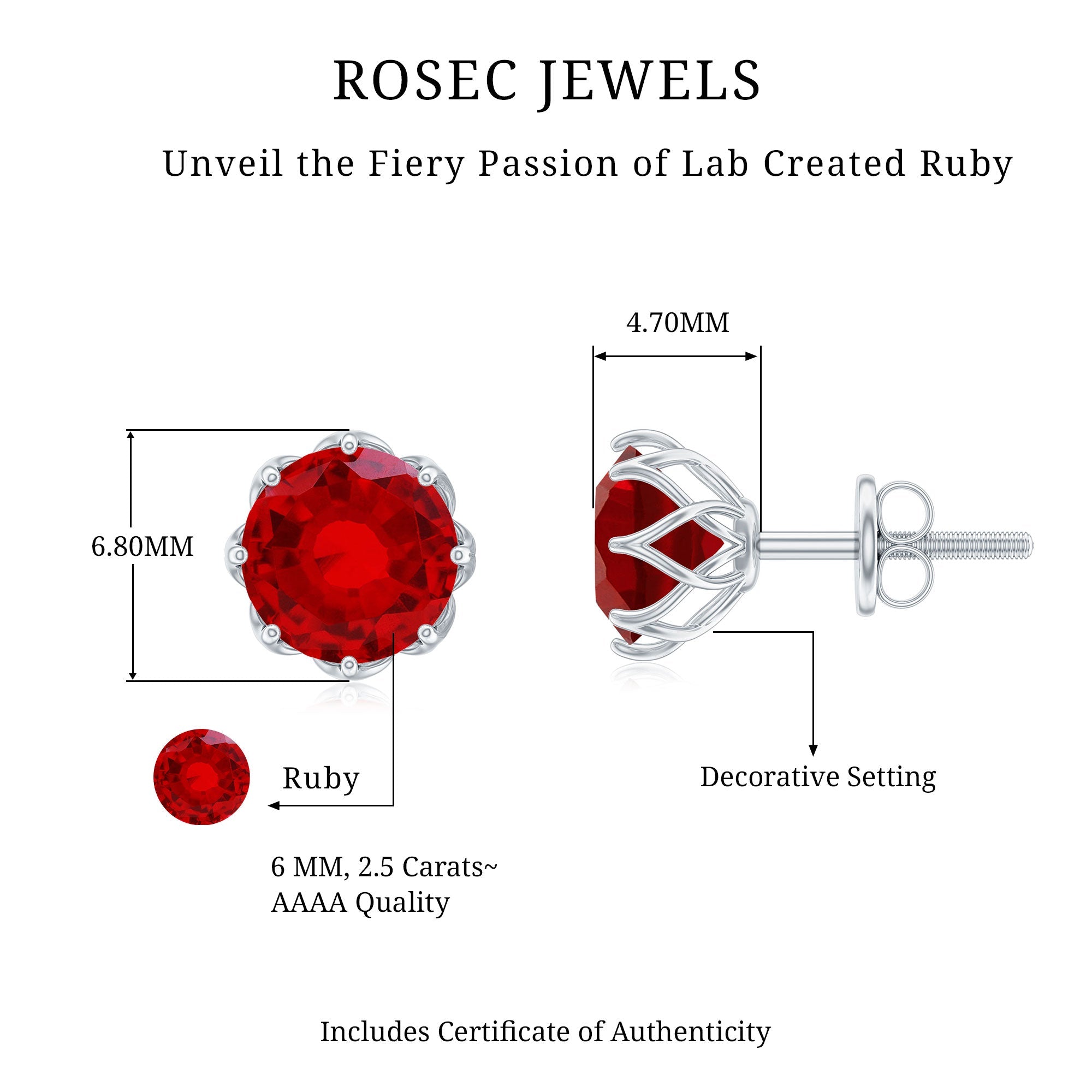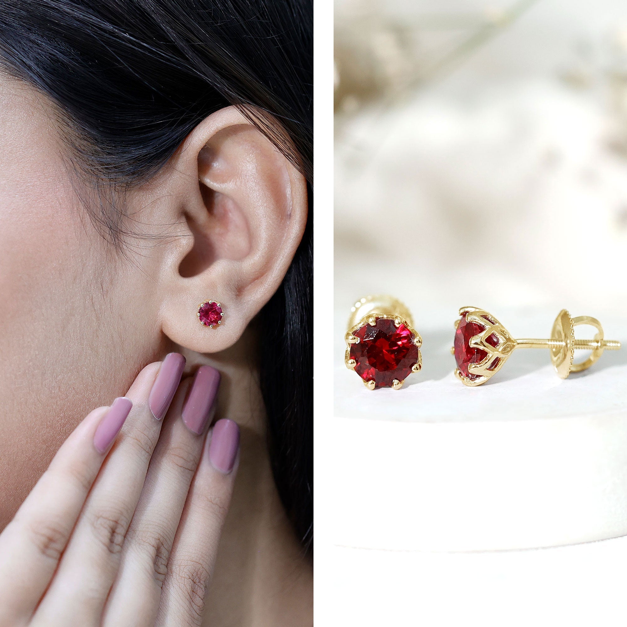 Elevate your fashion with these Lab Grown Ruby Stud Earrings crafted from 14K Yellow Gold Plated Silver. These earrings feature a 6 MM Round Shape Lab Created Ruby securely set in Decorative Setting. The Round Stud Earrings radiate the timeless brilliance of AAAA Quality Synthetic Ruby. They are an ideal gift for your loved ones on special occasions such as birthdays, anniversaries, or Valentine’s Day. Designed in a classic stud style with a reliable screw back closure, these Ruby Solitaire Earrings are both fashionable and comfortable for all-day wear. Step into a realm of refined beauty with these earrings, which possess an inherent sparkle, making them a truly versatile and enchanting choice. These Solitaire Studs reflect timeless sophistication, presenting a captivating mix of traditional charm and contemporary design. We have selected them with lab grown ruby, ensuring they are both affordable and eco-friendly. Accompanied by a certificate of authenticity that guarantees their quality and value, and presented in a luxurious jewelry box, these Red Stone Earrings enhance your everyday style with their rich and romantic hue.