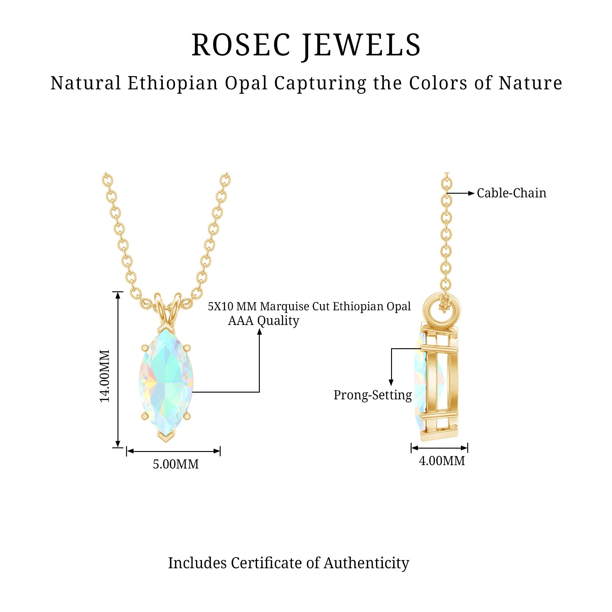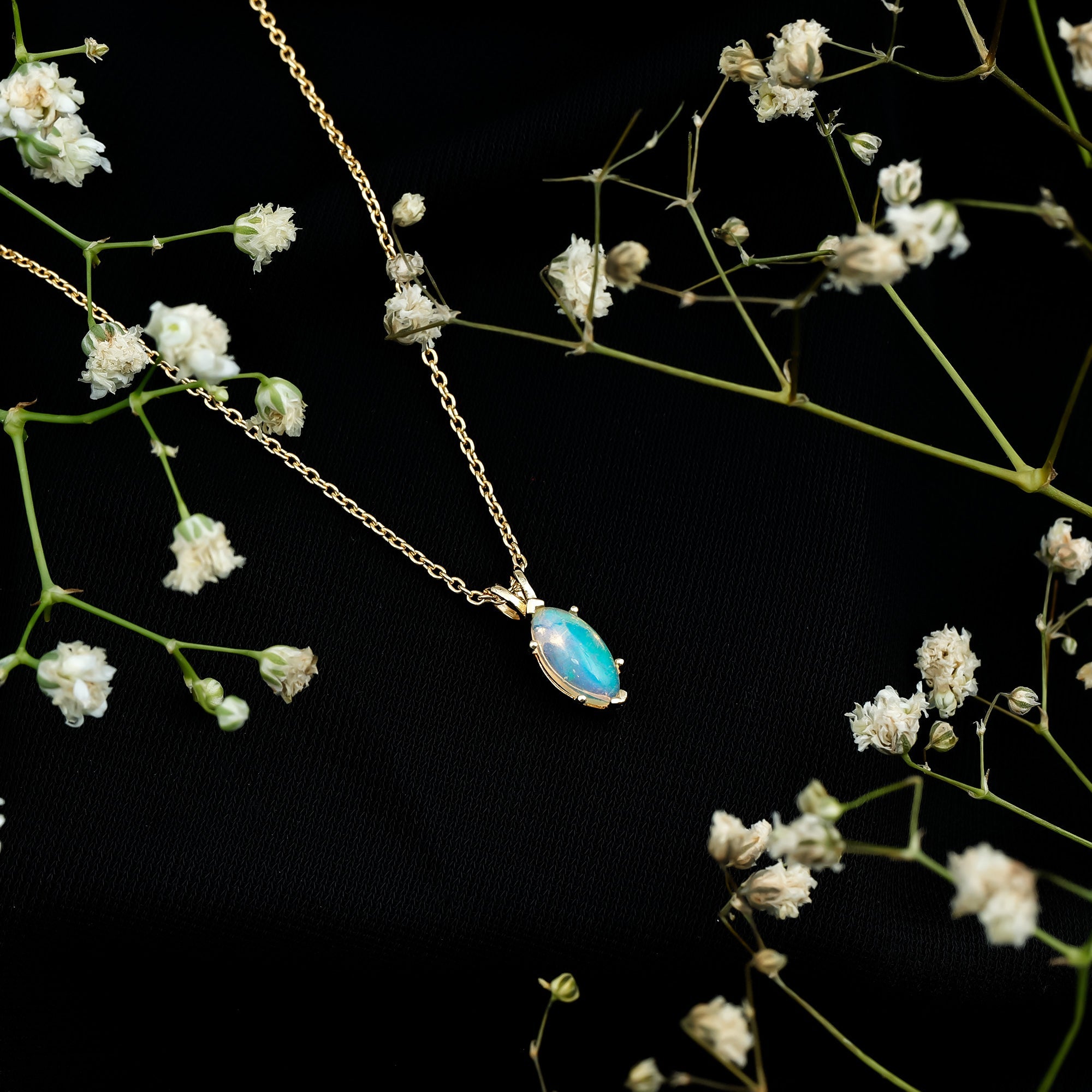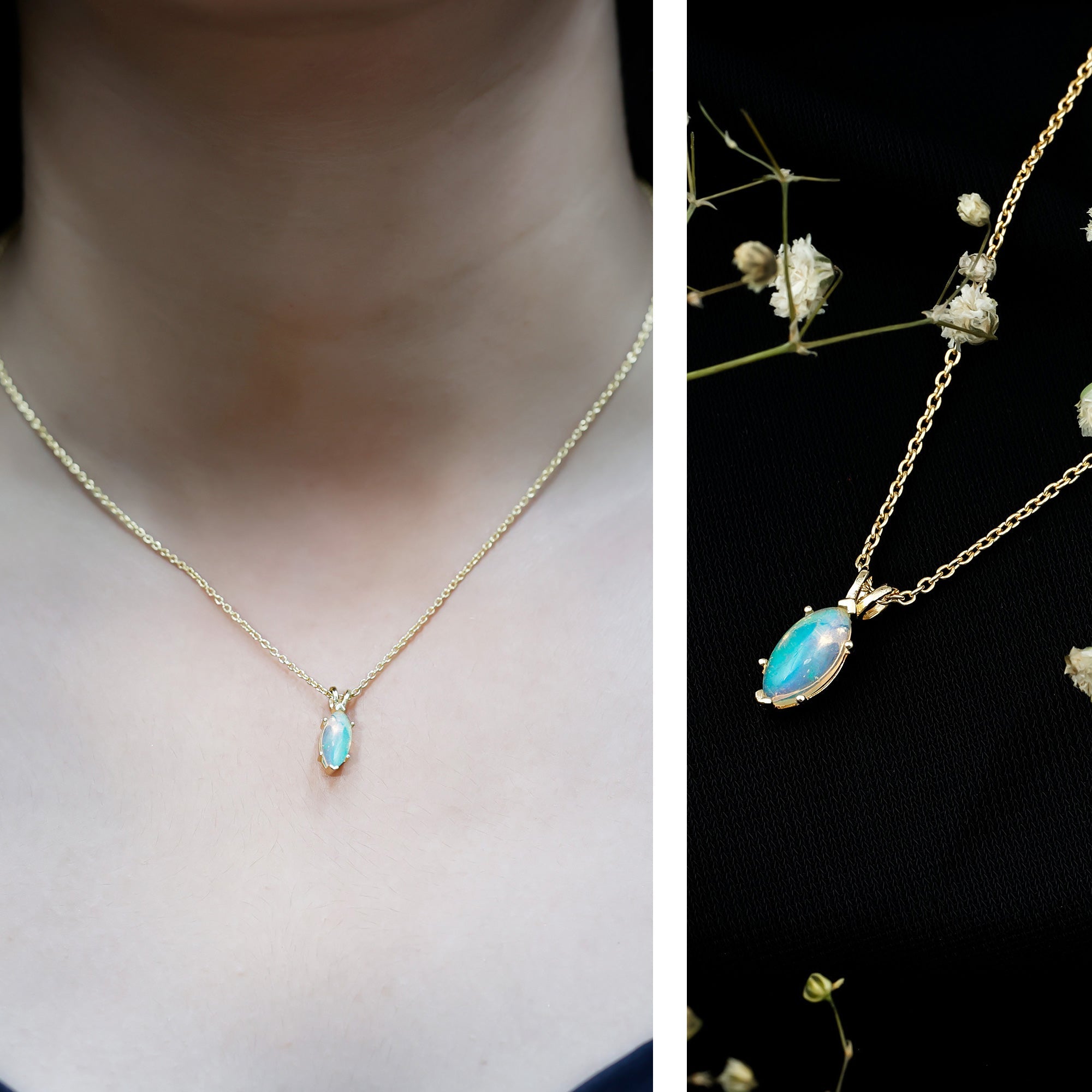 Born in the season of color and change, October hearts deserve something just as magical, like this stunning Ethiopian Opal Necklace that captures the beauty of transformation and individuality. Beautifully handcrafted in 14k yellow gold plated silver, this stunning Solitaire Pendant features a 5X10 MM marquise cut Ethiopian opal. The opal is set securely in a safe prong setting, allowing the stone’s natural beauty to shine without distraction. A graceful rabbit ear bail connects the Opal Pendant Necklace to a fine, adjustable chain that closes with a secure lobster clasp, giving you the option to wear it at the perfect length for any outfit. This Marquise Cut Pendant is a thoughtful gift for anyone born in October, or simply someone who appreciates rare, meaningful gemstones. The AAA quality Ethiopian Opal and polished metal create a clean yet eye-catching look, ideal for both everyday wear and special occasions. Whether you are celebrating a birthday, anniversary, or personal milestone, this October Birthstone Necklace is a beautiful symbol of confidence, creativity, and timeless beauty. Arriving in a signature jewelry box, it is ready to be gifted , or cherished as your own radiant reminder of elegance.