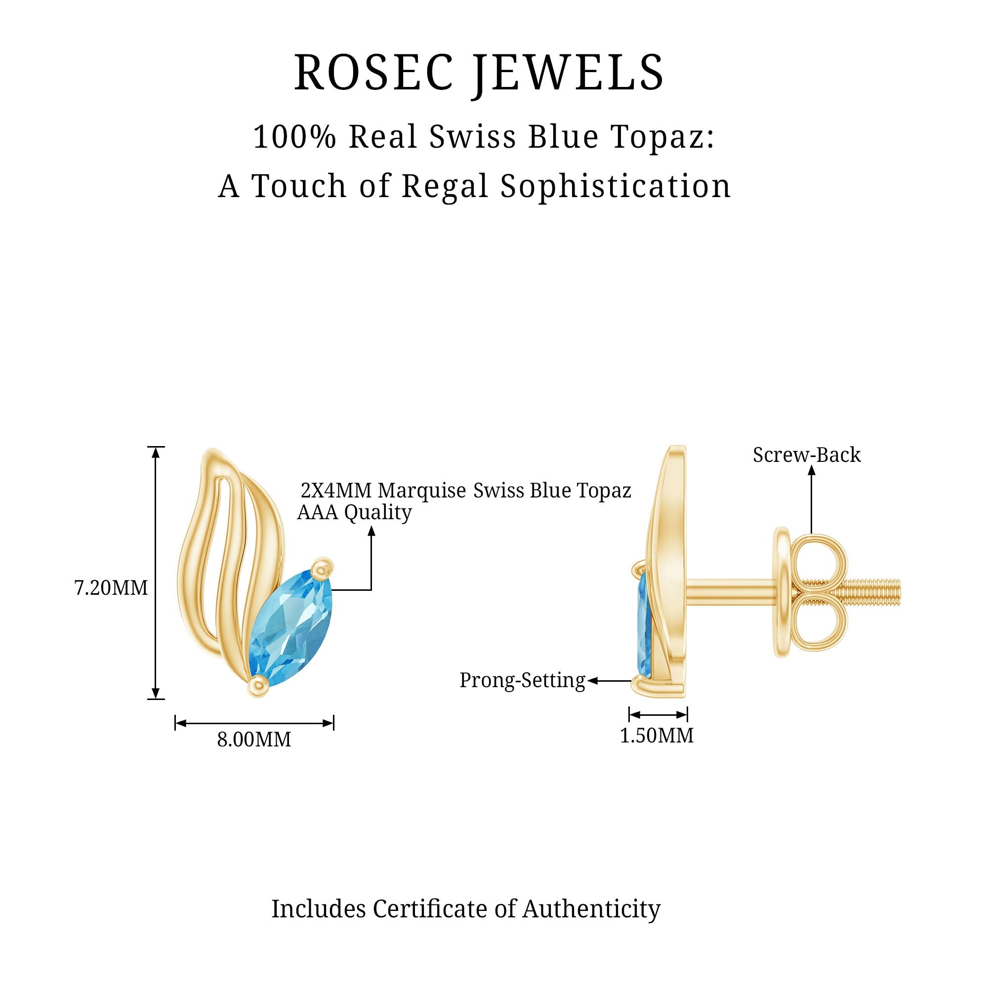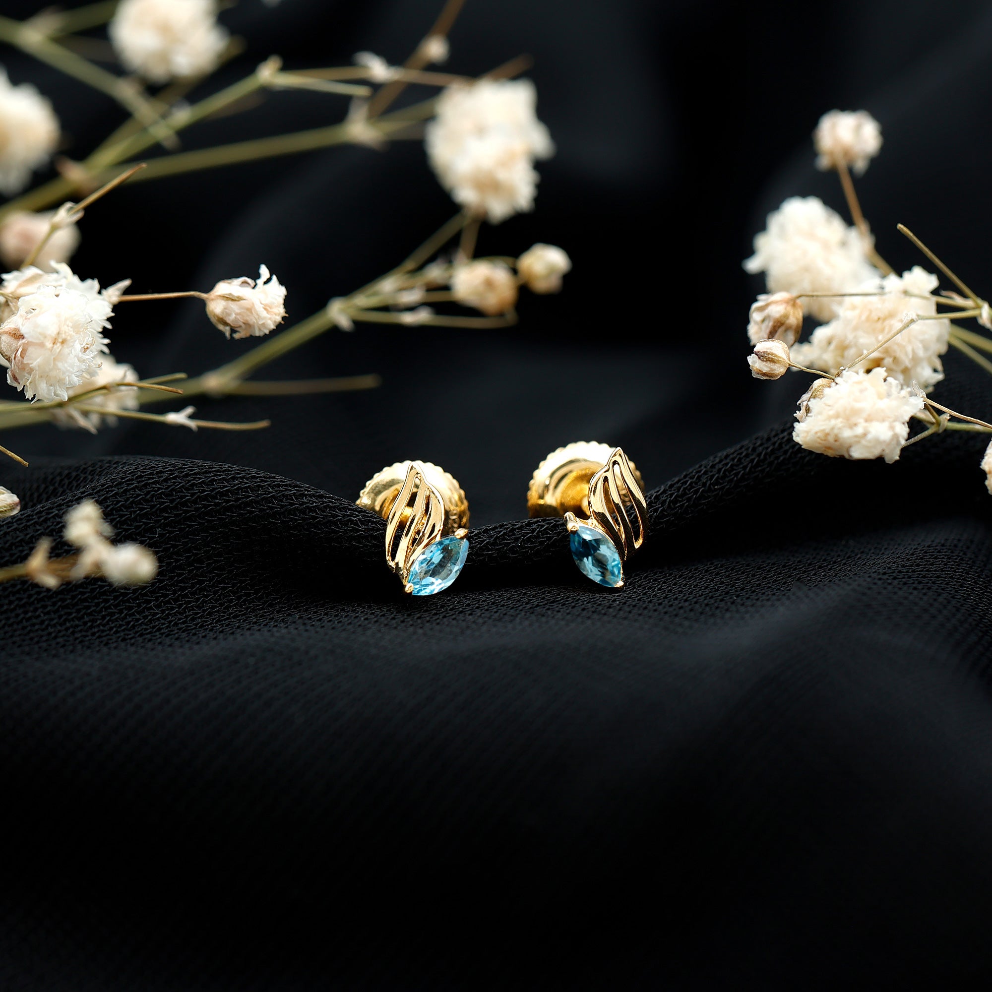 Marquise Shaped Swiss Blue Topaz Leaf Stud Earrings in Silver ‐ AAA / 14K Yellow Gold Plated Silver