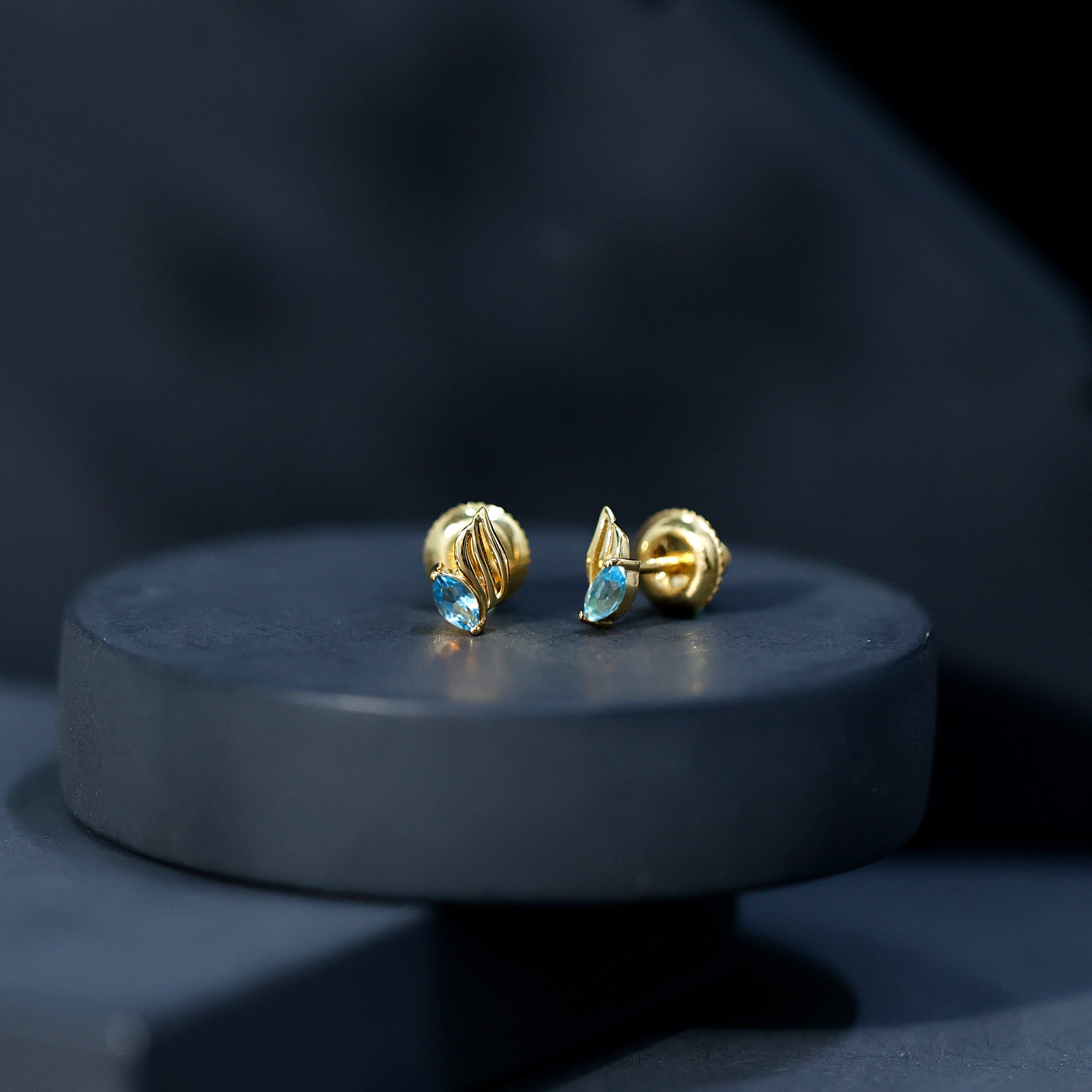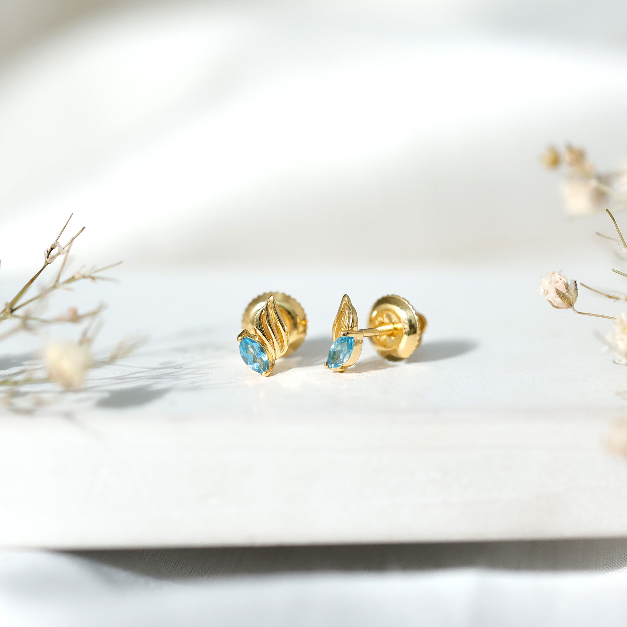 Nature meets elegance in these charming Leaf Earrings that blend delicate design with everyday wearability. Carefully crafted in 14k yellow gold plated silver, these Swiss Blue Topaz Earrings bring a refreshing twist to classic style. At the center of each stud sits a 2X4 MM marquise shaped Swiss Blue Topaz, nestled securely in prong setting. The marquise cut beautifully mimics the shape of a leaf, making these December Birthstone Earrings feel both artistic and organic. The leafy design adds a whimsical, nature-inspired element, making these Topaz Stud Earrings a lovely choice for those who appreciate subtle details that stand out. Whether you are a nature lover or just enjoy jewelry with a touch of the unexpected, this pair is sure to become a go-to favorite. These screw back studs are designed for both comfort and security, so you can wear them all day long with confidence. The AAA quality Swiss Blue Topaz stones bring just the right hint of sparkle, while the clean lines of the gold plated leaf keep the look polished and modern. Perfect for birthdays, milestones, or just a thoughtful treat for yourself, these Leaf Stud Earrings also make a sweet gift for someone who enjoys timeless pieces. Minimal yet full of personality, these Earrings are the kind of everyday luxury you will love wearing again and again.