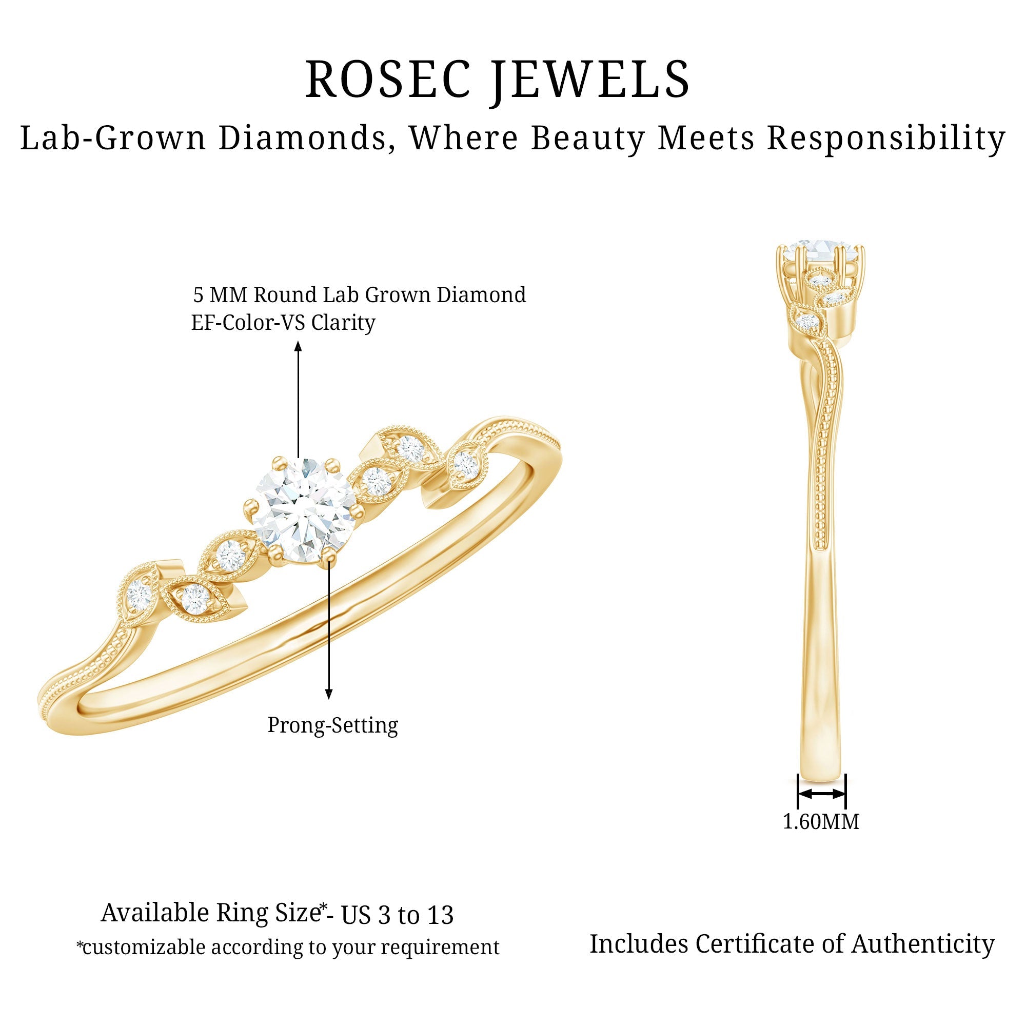 Minimal Lab Grown Diamond Leaf Ring with Beaded Detailing ‐ Lab - ( EF-VS ) / 14K Yellow Gold / 5